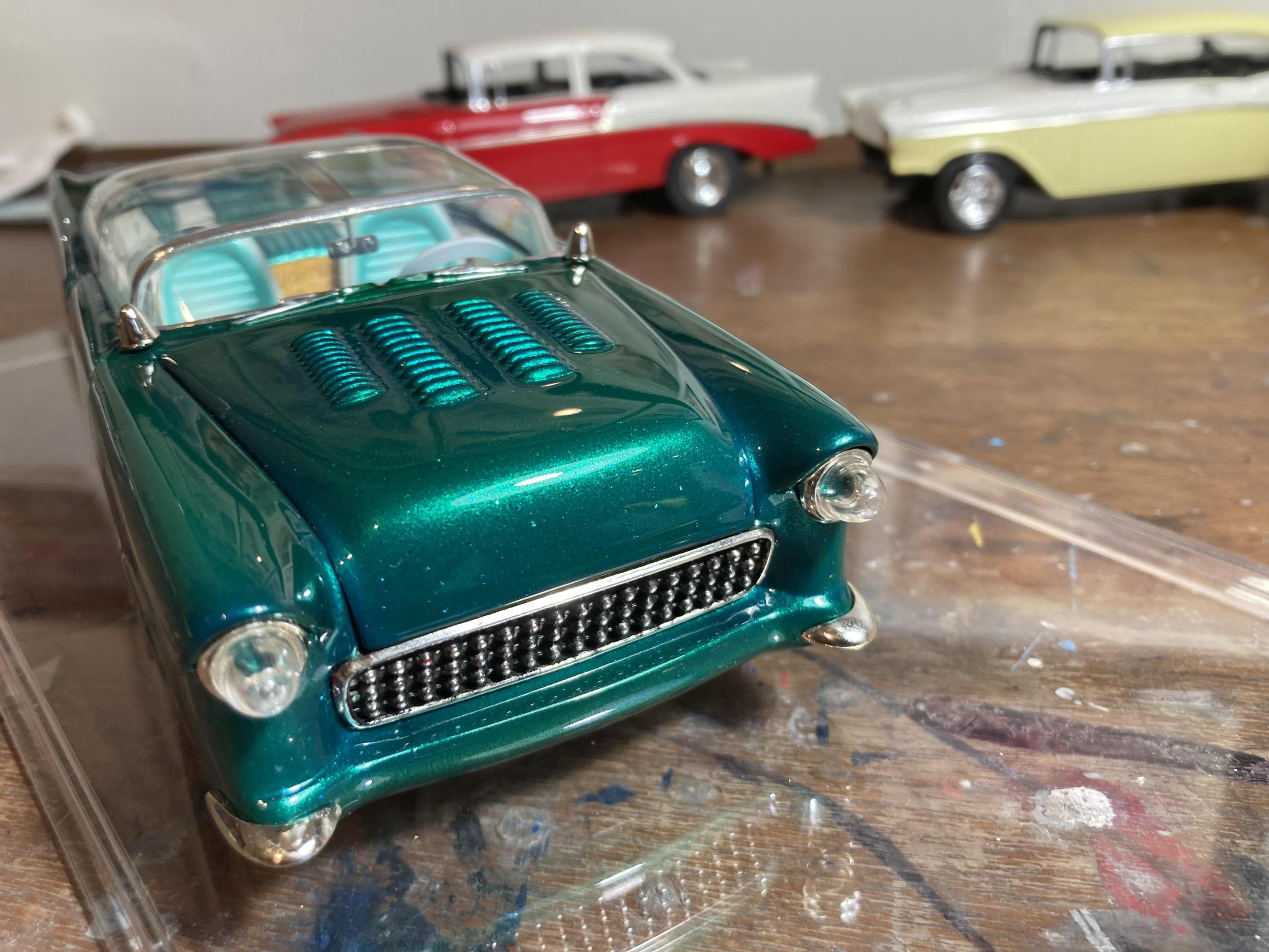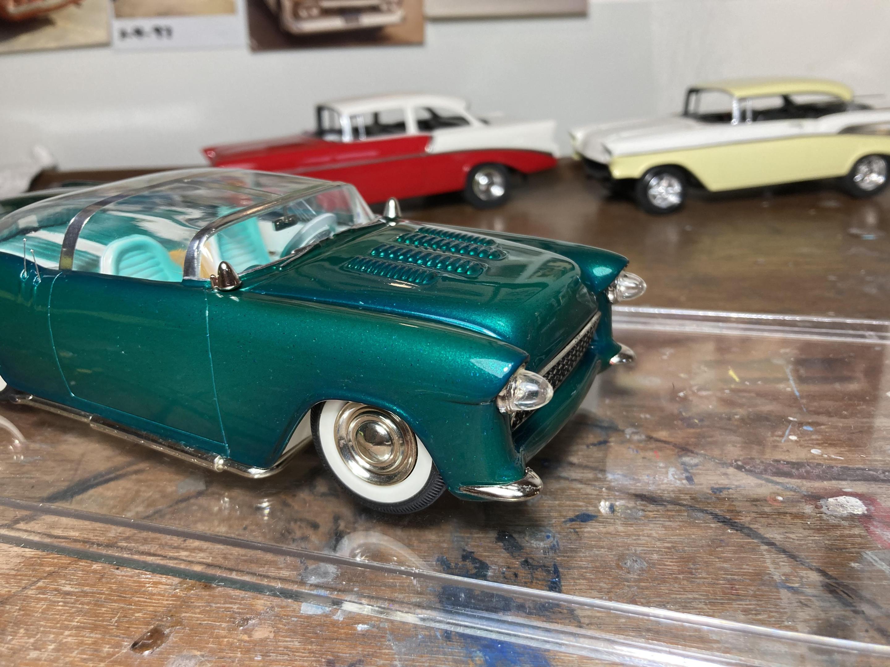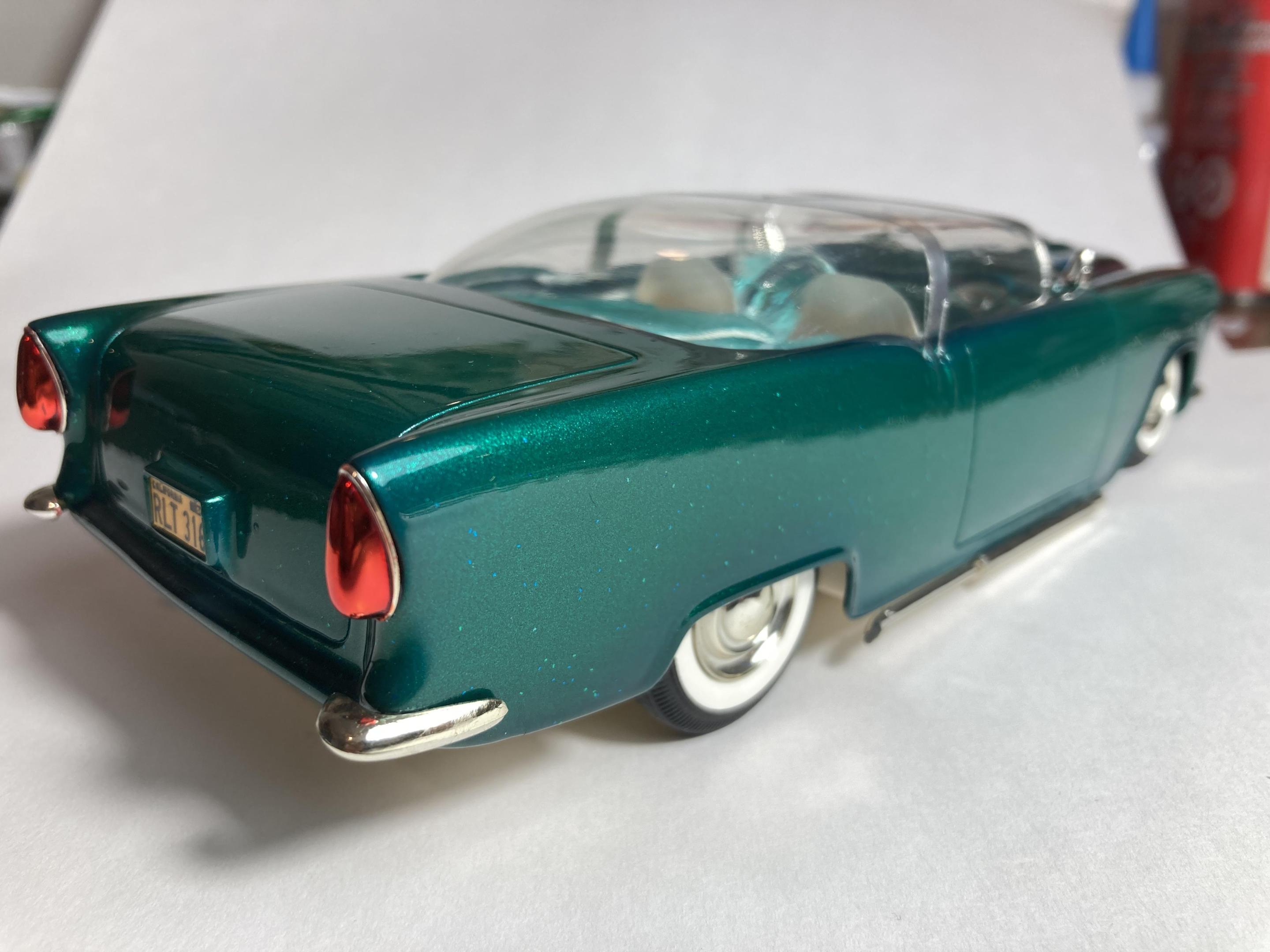Here’s another one I just finished, this is the early Monogram 1955 Chevy , when I got this kit the windshield post was broken and after trying to repair it a few times I finally just cut it and glued the windshield to the custom bubble top and re made a new windshield post allowing me to be able to chop the top, adding most of the kit supplied custom parts ,shaving all the chrome and giving the car the stance I wanted , it was ready for primer and paint, candy green mixed with candy teal and sprinkle with a rainbow flake, and topped with a 2 K clear coat, all this over a silver metal flake base, pearl white and candy teal interior, I didn’t like the way you could look down though the bubble and see the stock rear seat so I made a rear cover, all in all it was a fun fast build of a vintage kit ,complete build about a week, hope you enjoy.