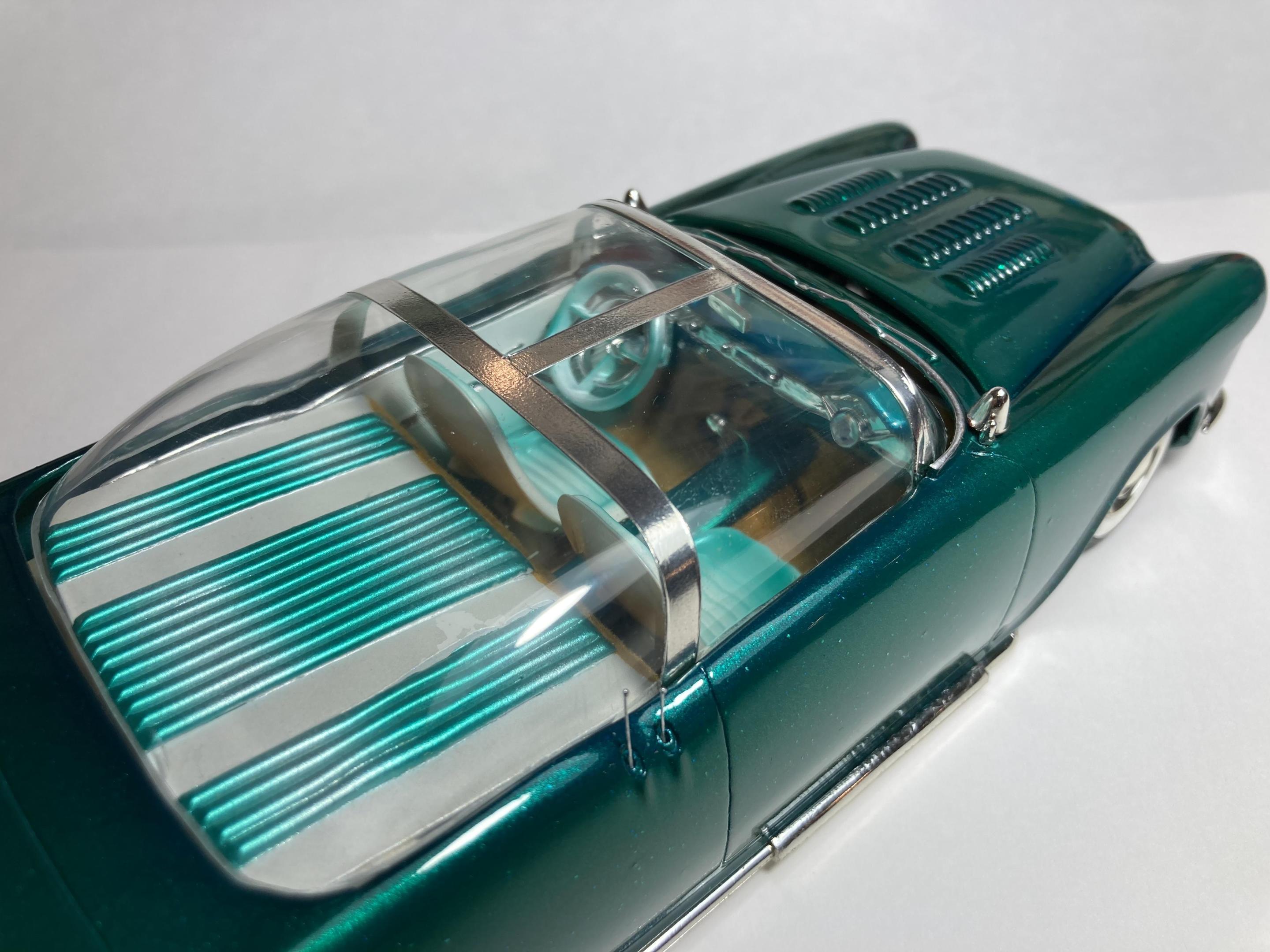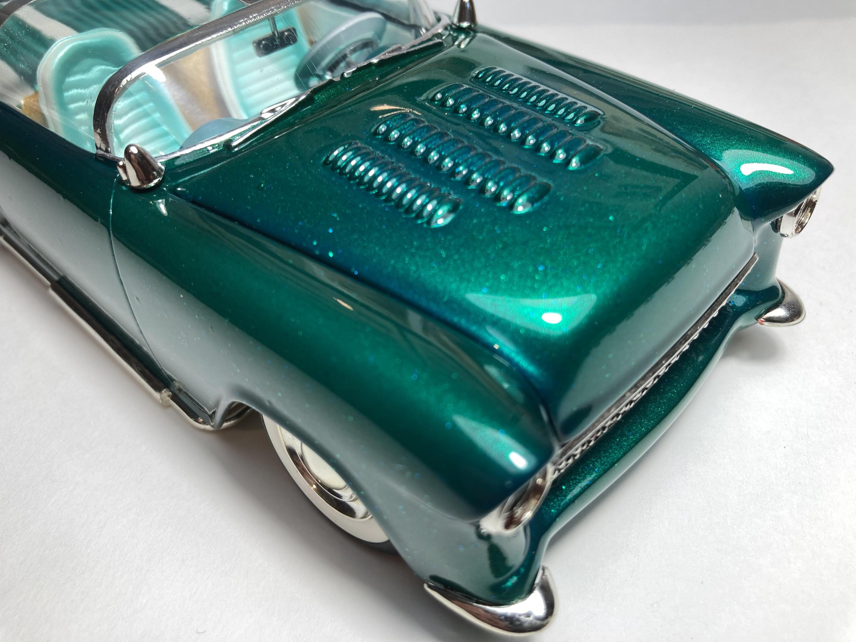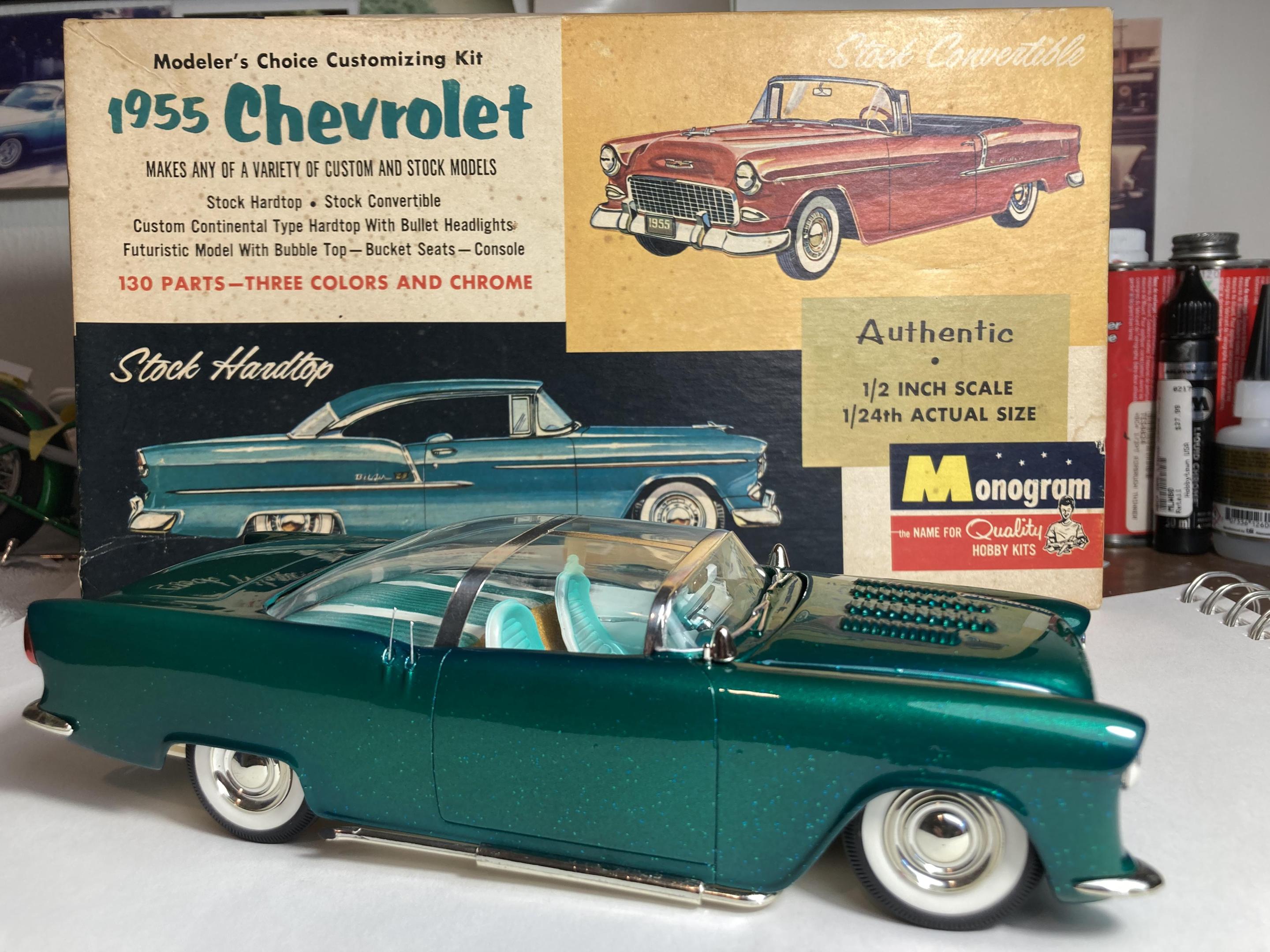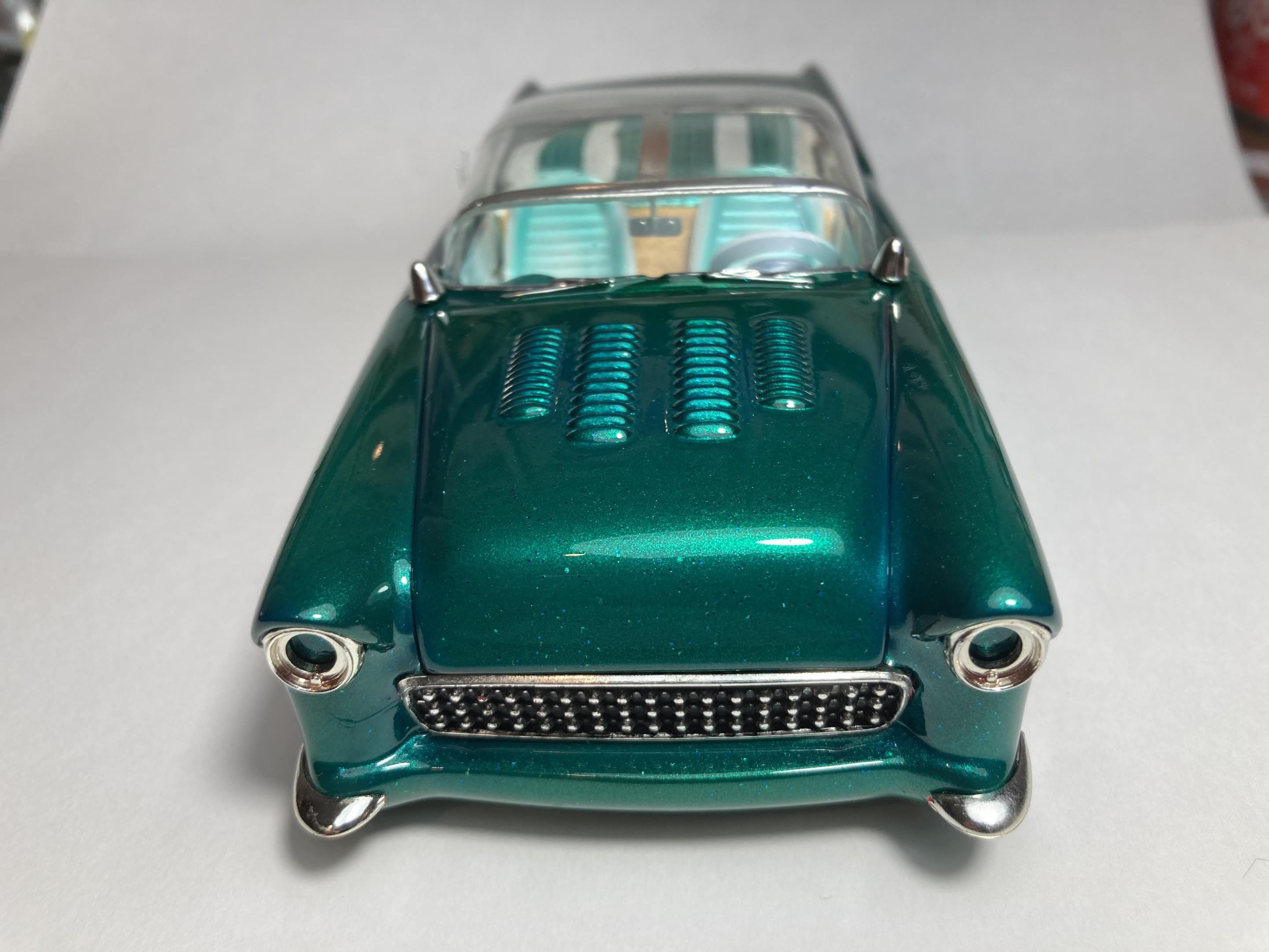 Here’s another one I just finished, this is the early Monogram 1955 Chevy , when I got this kit the windshield post was broken and after trying to repair it a few times I finally just cut it and glued the windshield to the custom bubble top and re made a new windshield post allowing me to be able to chop the top, adding most of the kit supplied custom parts ,shaving all the chrome and giving the car the stance I wanted , it was ready for primer and paint, candy green mixed with candy teal and sprinkle with a rainbow flake, and topped with a 2 K clear coat, all this over a silver metal flake base, pearl white and candy teal interior, I didn’t like the way you could look down though the bubble and see the stock rear seat so I made a rear cover, all in all it was a fun fast build of a vintage kit ,complete build about a week, hope you enjoy.