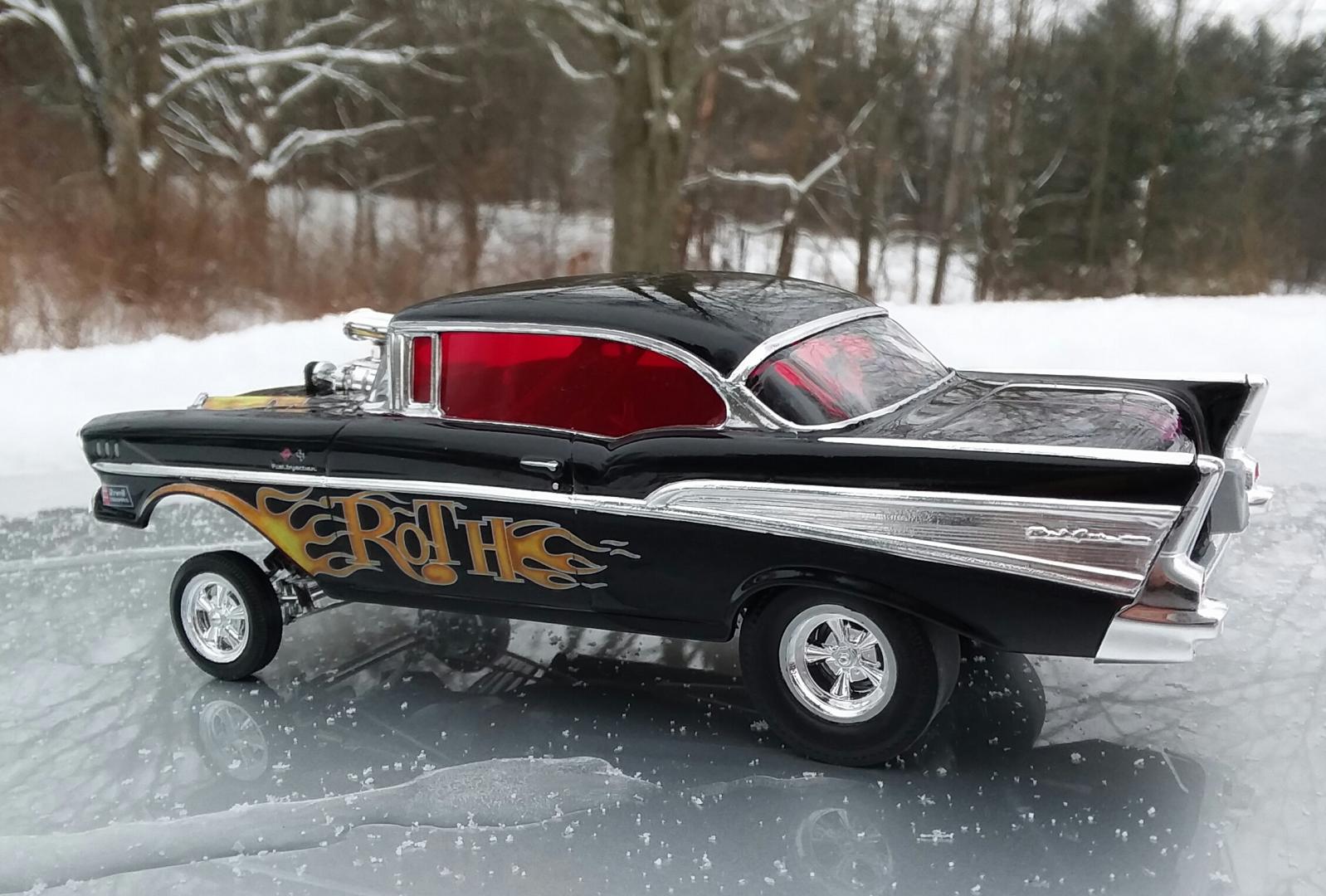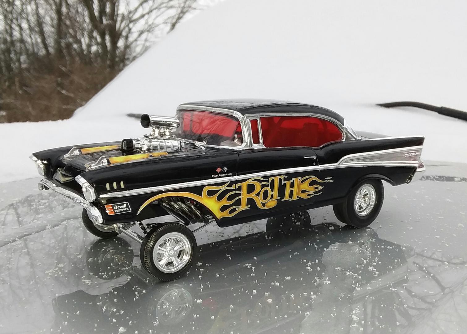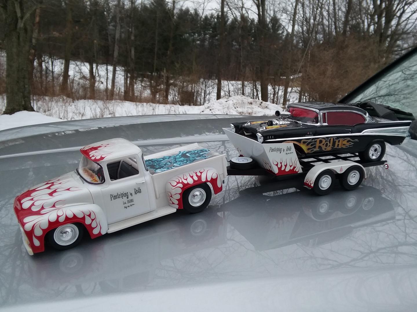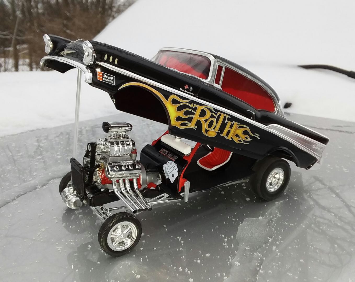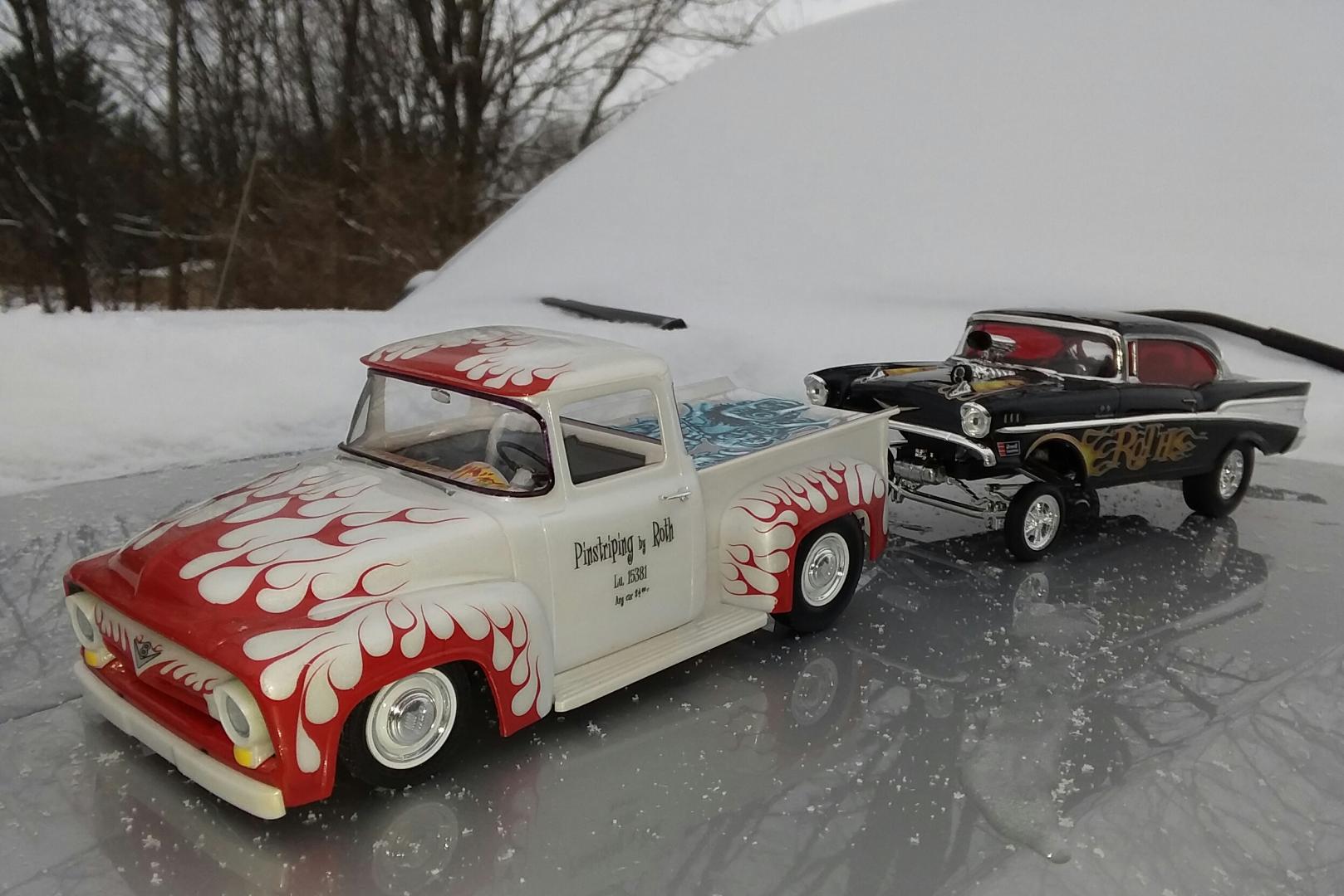 The second part of my Roth race team. Trailers next. Took the Revell snap 57 body and the Miss Deal rolling stock that had to be streached a little and used some of the decals from the Roth 57 kit. Just a fun build.