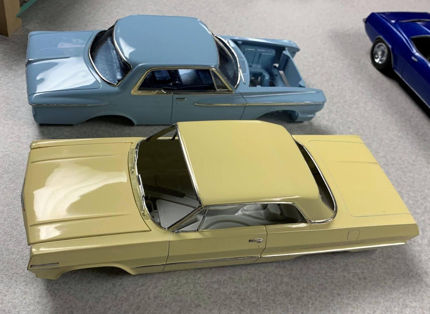 I was able to take parts I needed from a 64 that the guys in our model club were passing around in a 64 Impala box..Got the radiator,firewall and rad hoses..Axles were thin like they used to be..Didn't like the molded in tail lights..Did some body work,removed mold marks and tried to sand the sides but they look like someone did bad body work right from the box..Paint came out good considering it was Krylon clear coated with Duplicolor Acrylic Enamen(tall black can) polished with 2000 then 4000 and finished with Meguiar's Scratch X2.0 and Meguiar's Gold Class Paste..Rod Maskiw did some white wall tire and going to use stock hub caps..Now to finish it..Chrome foil done by the King.. -