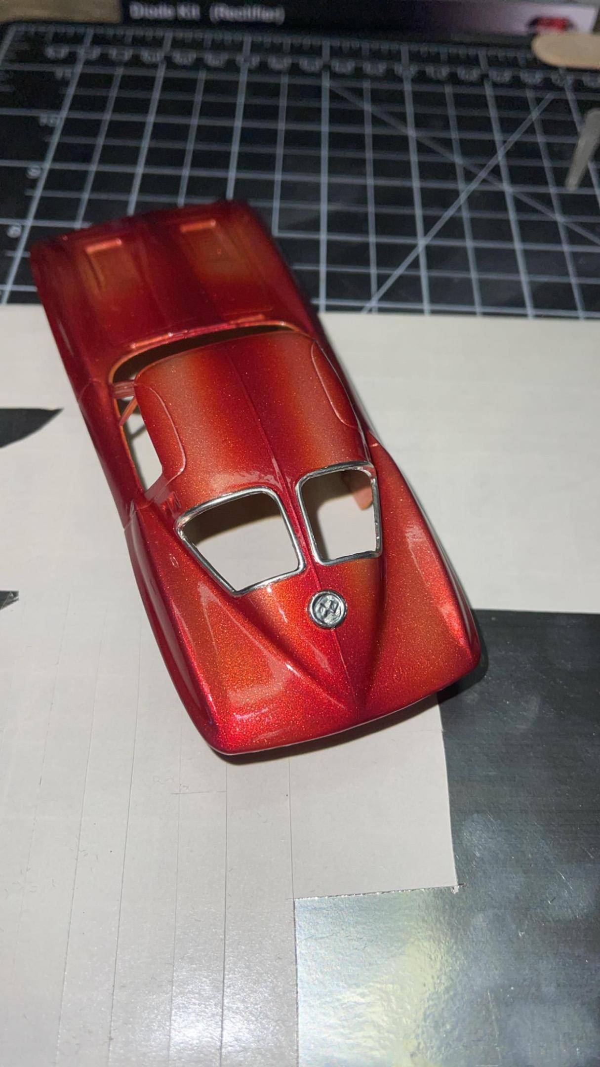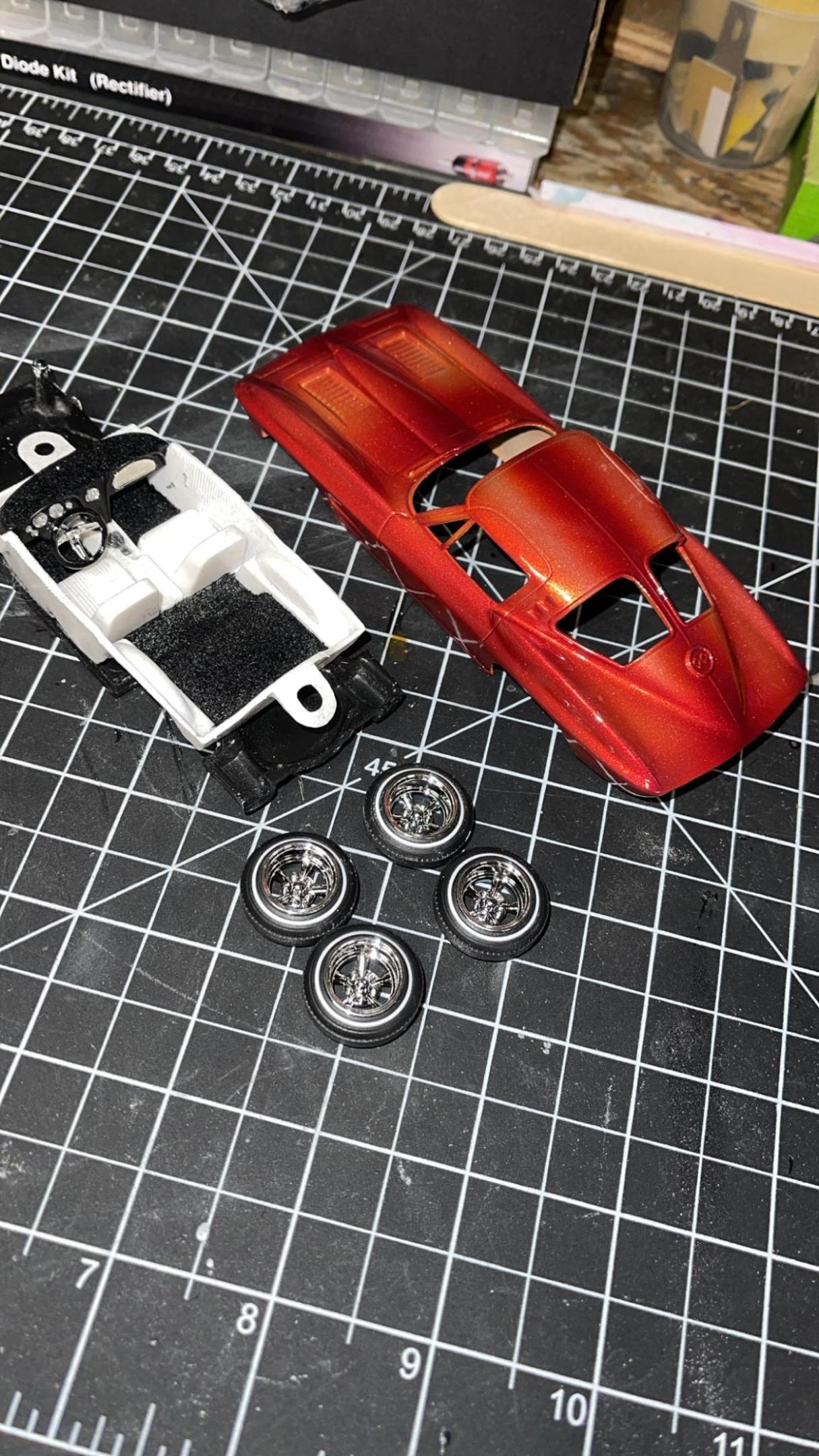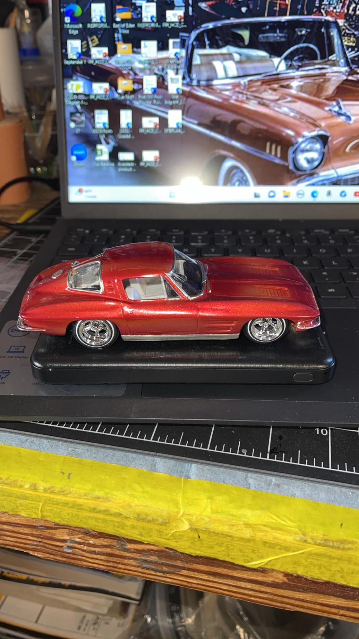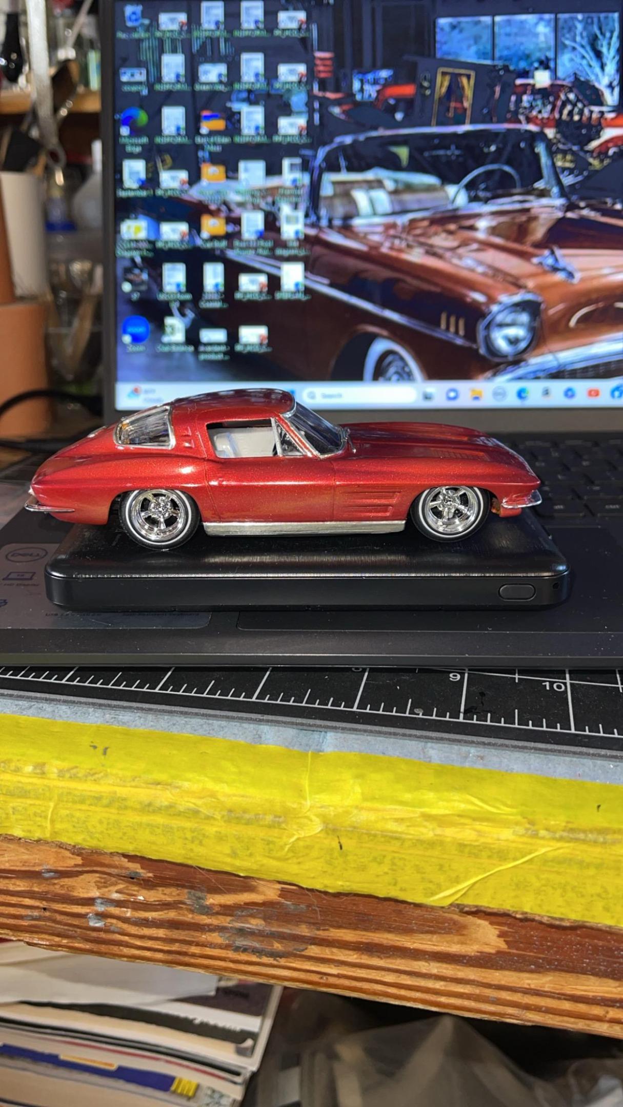 Just wrapped up this AMT 32nd scale Vette, was a fun build! I cut the front and rear body portions from the frame and molded them to the body. Used evercoat filler and Tamiya primer, shaved most the body. Used House of Kolors Orion Silver and Solar Gold bases, topped with Tropical Glitz Apple Wine Kandy paint, then covered it all with Scalefinishes Gloss 500 Clear Coat. The interior is sprayed with Tamiya Pearl White, I then used black flocking for the floors and top of the dash. Wheels and tires came from Lowrider Model Car Parts and trim is mostly Bare Metal Foil. You can see more on this on my YouTube channel, thanks for checking it out!!