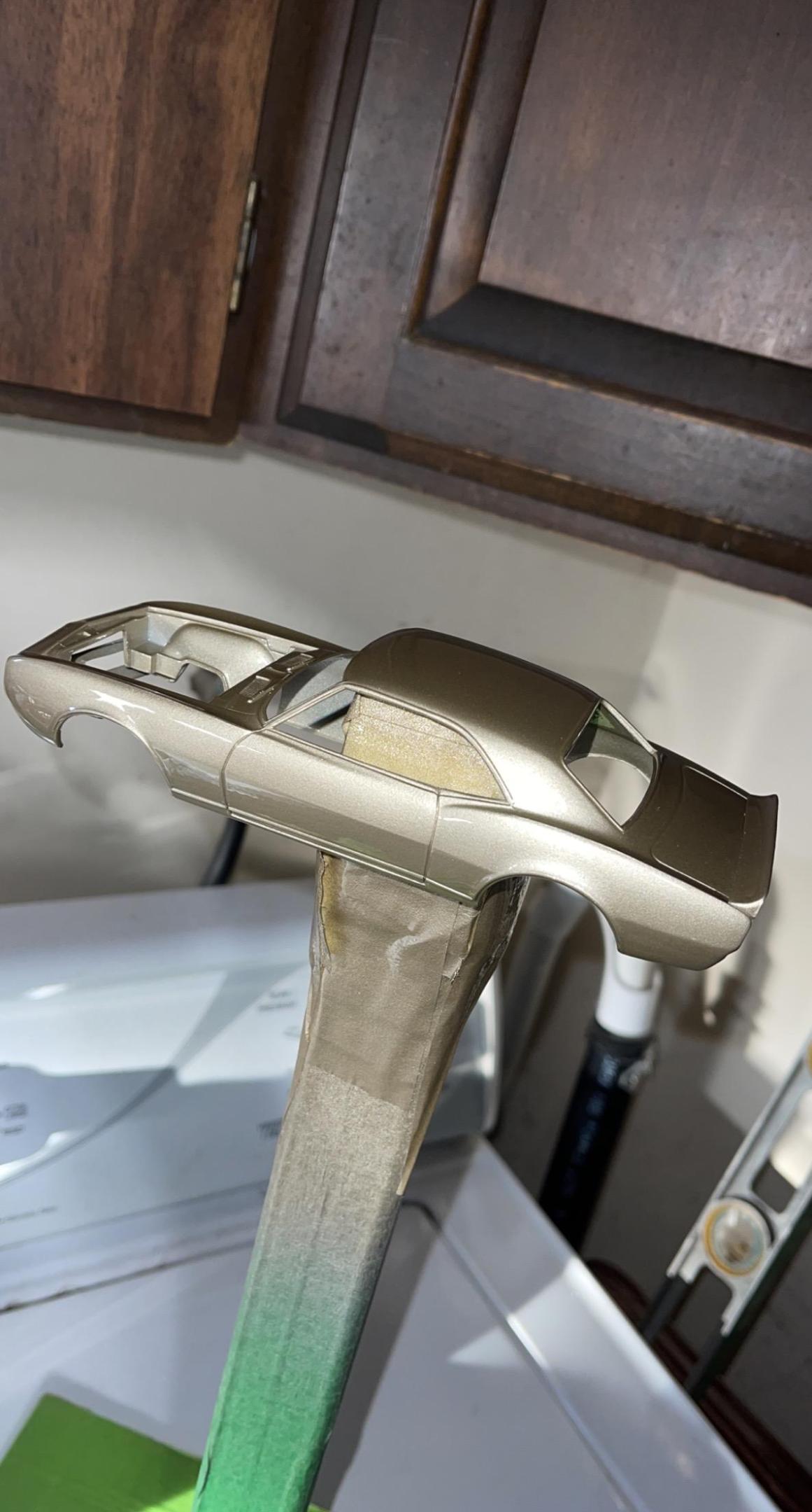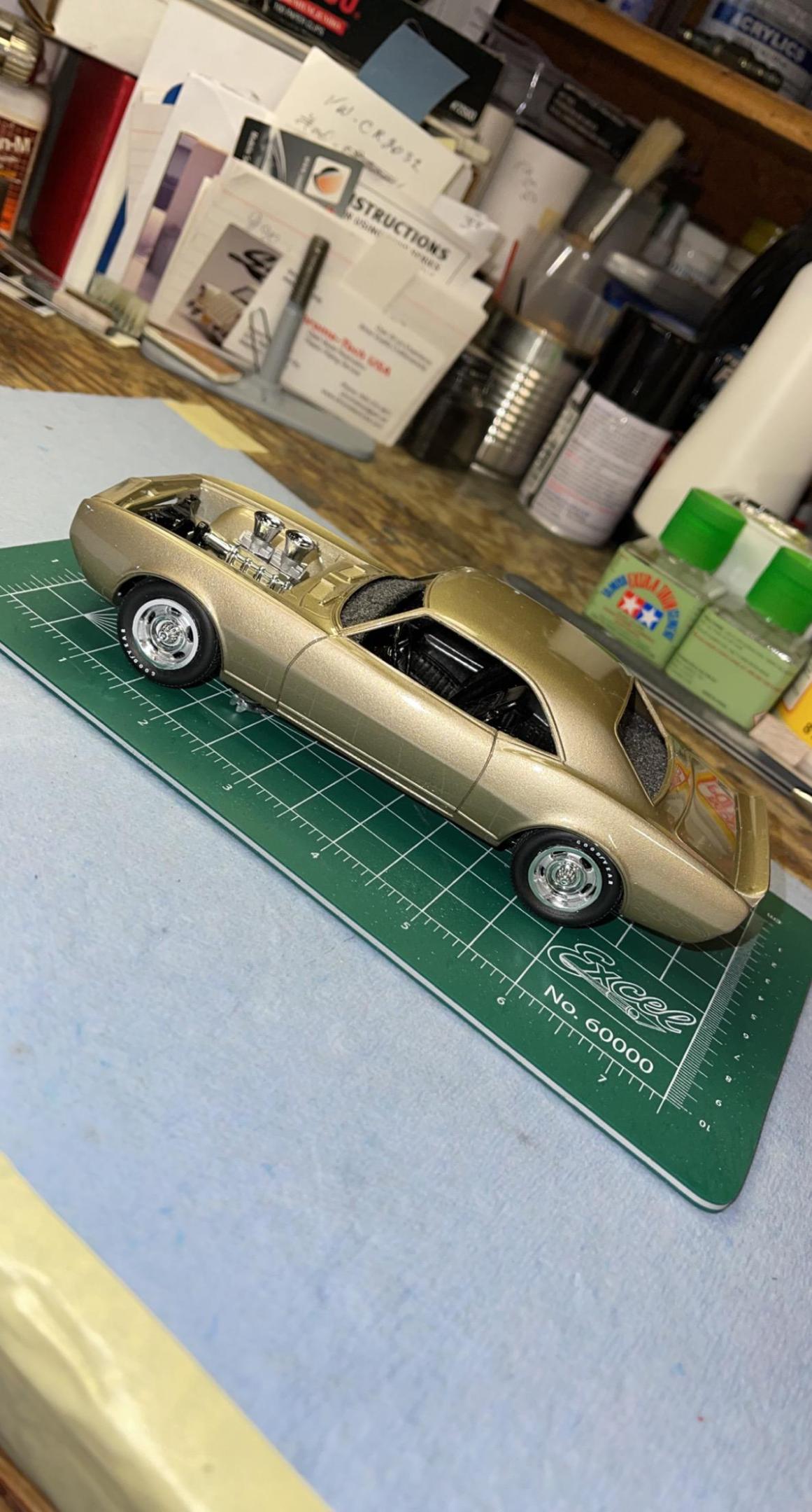 Just wrapped up this build, was done for an Instagram Build-off, was fun, the build definitely had its fit challenges. The first kit I started with had a warped chassis and warped body, next one was clear but had a number of issues overall, I ended up robbing an old chassis from an AMT 67 Camaro I had started years ago, stripped it down and it helped quite a bit with some fit issues. Overall, the model is built mostly with kit provided parts, a few interior details were added along with some lines and cables in the engine compartment. The body was cleaned and shaved for the most part, front and rear pans were molded and filled in, the paint is a PPG Mercedes Gold covered with Deltron 3k clear. Onto the next project!