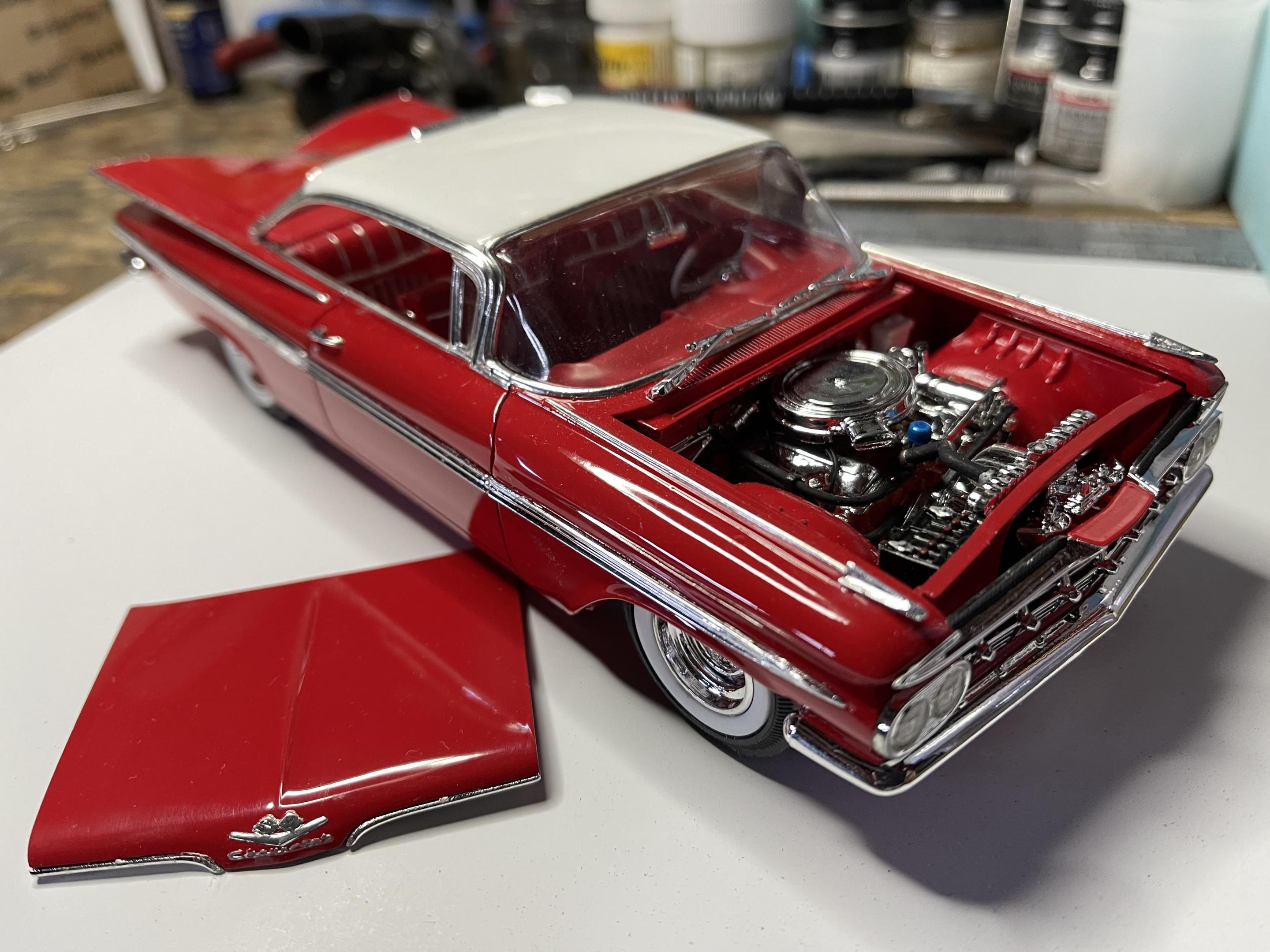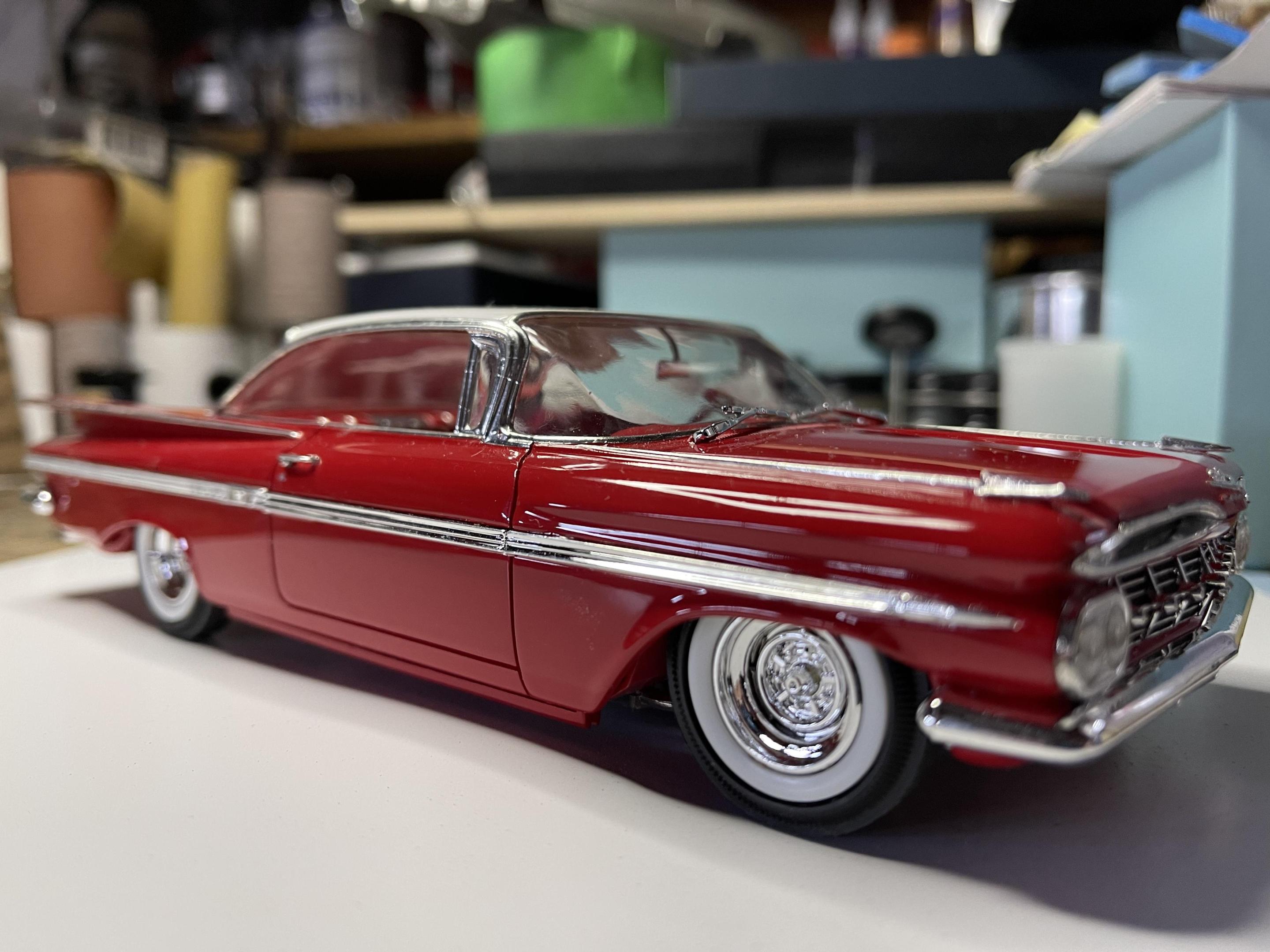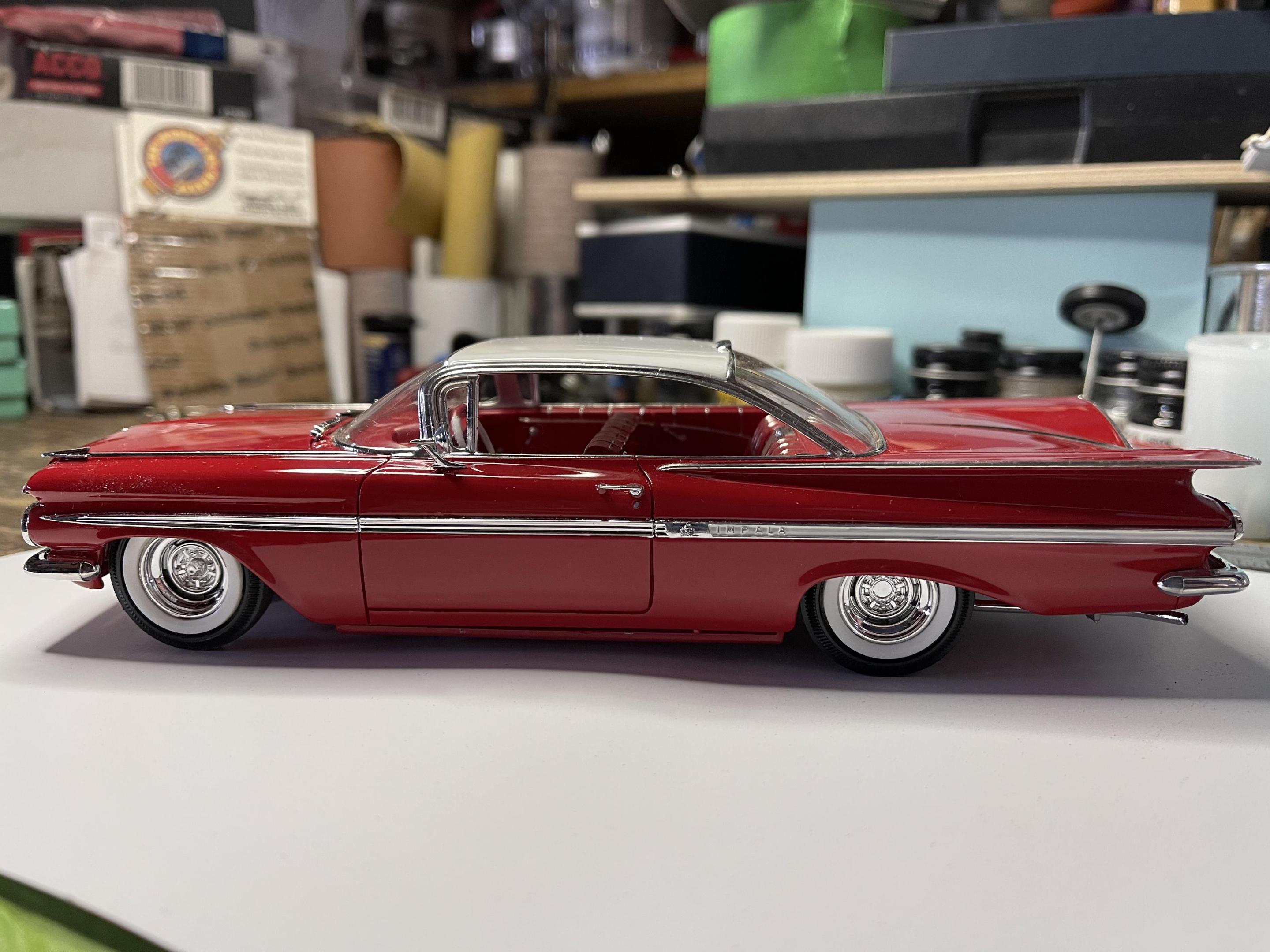 Good morning all, here is 59 Impala built by my pops about 15 years ago, some fitting issues but overall came out really nice. GM Red and white top, Sikkens paint and clear, lowered with chrome reverse wheels, otherwise mostly built from the kit itself