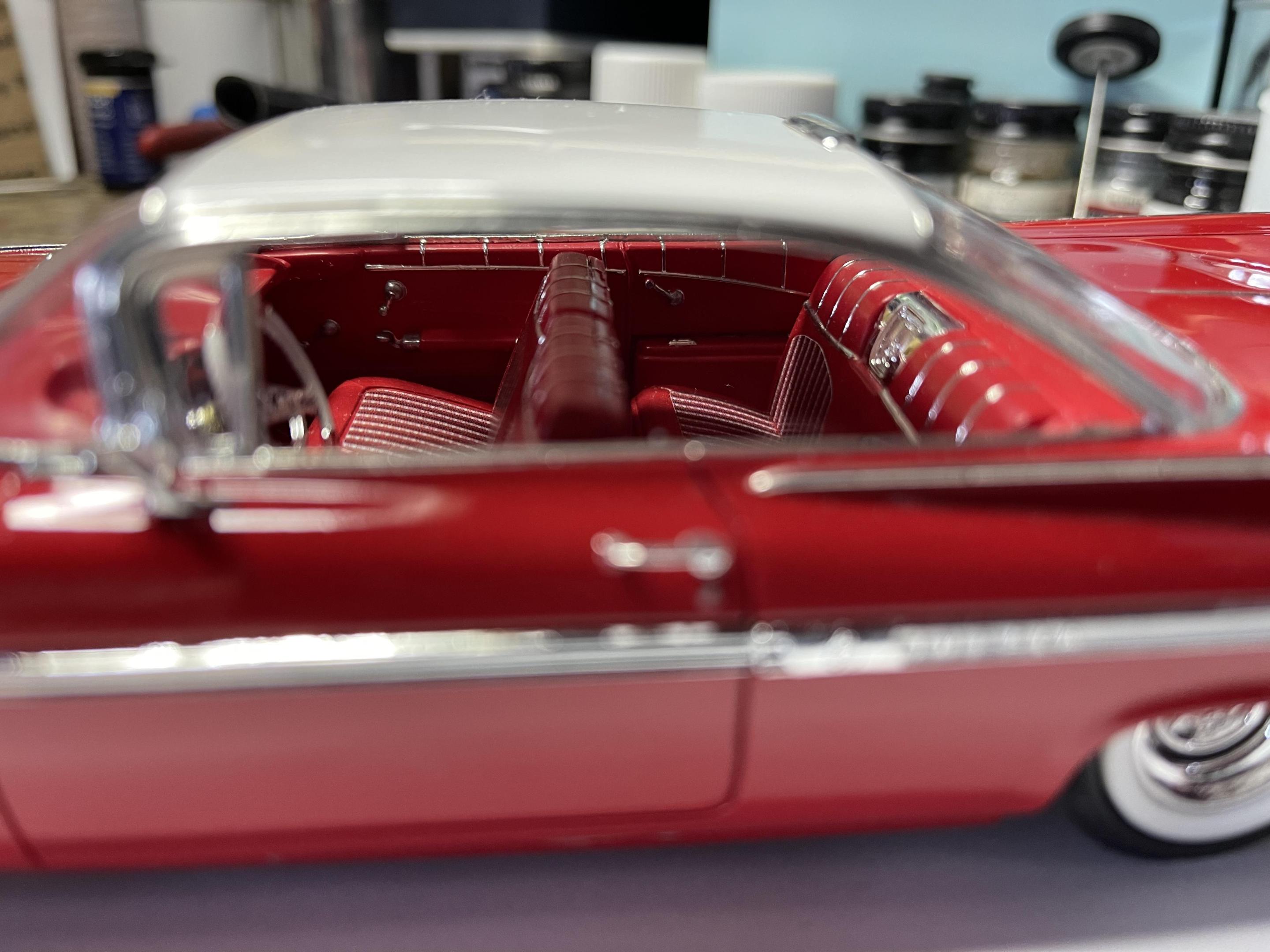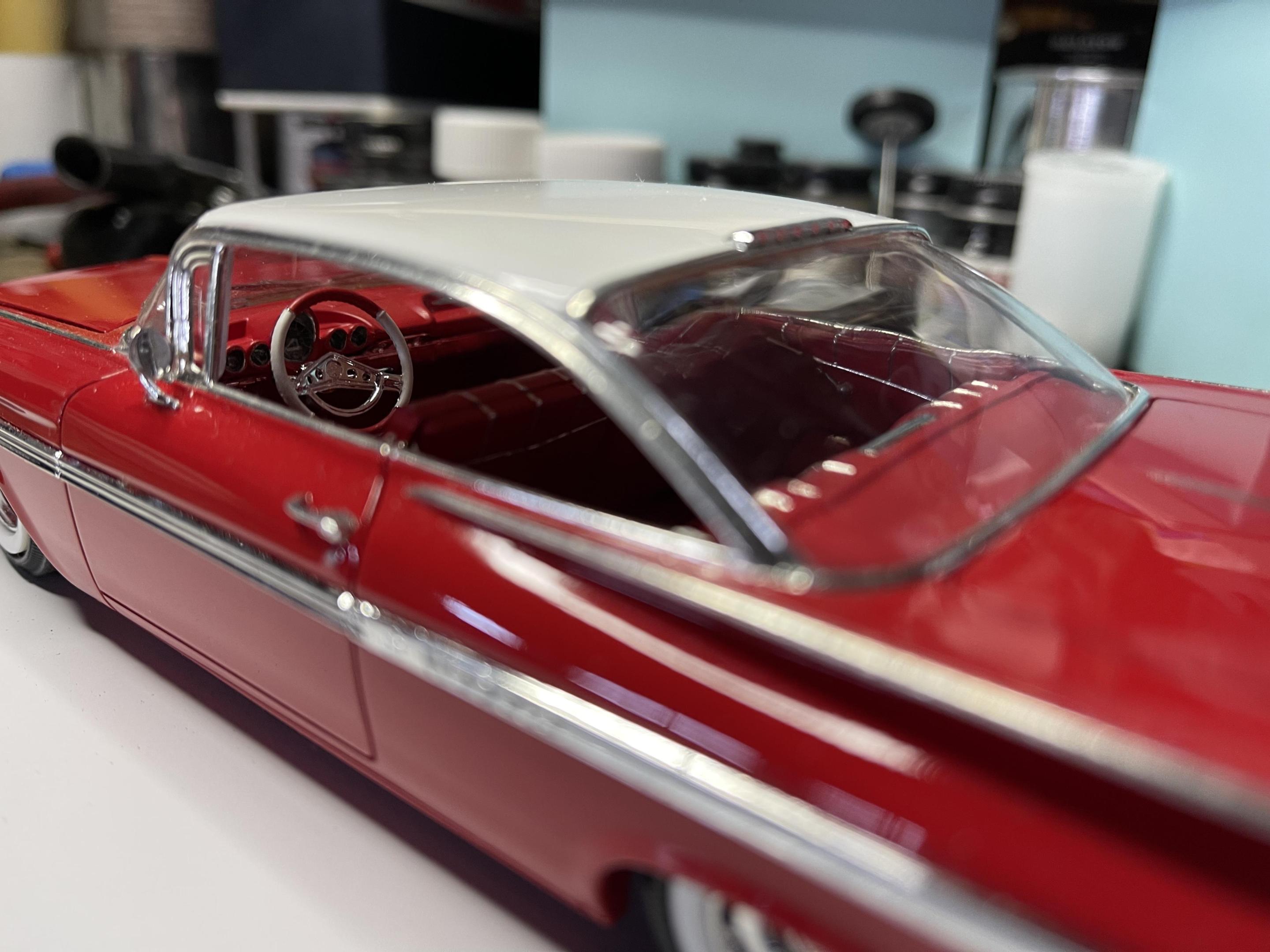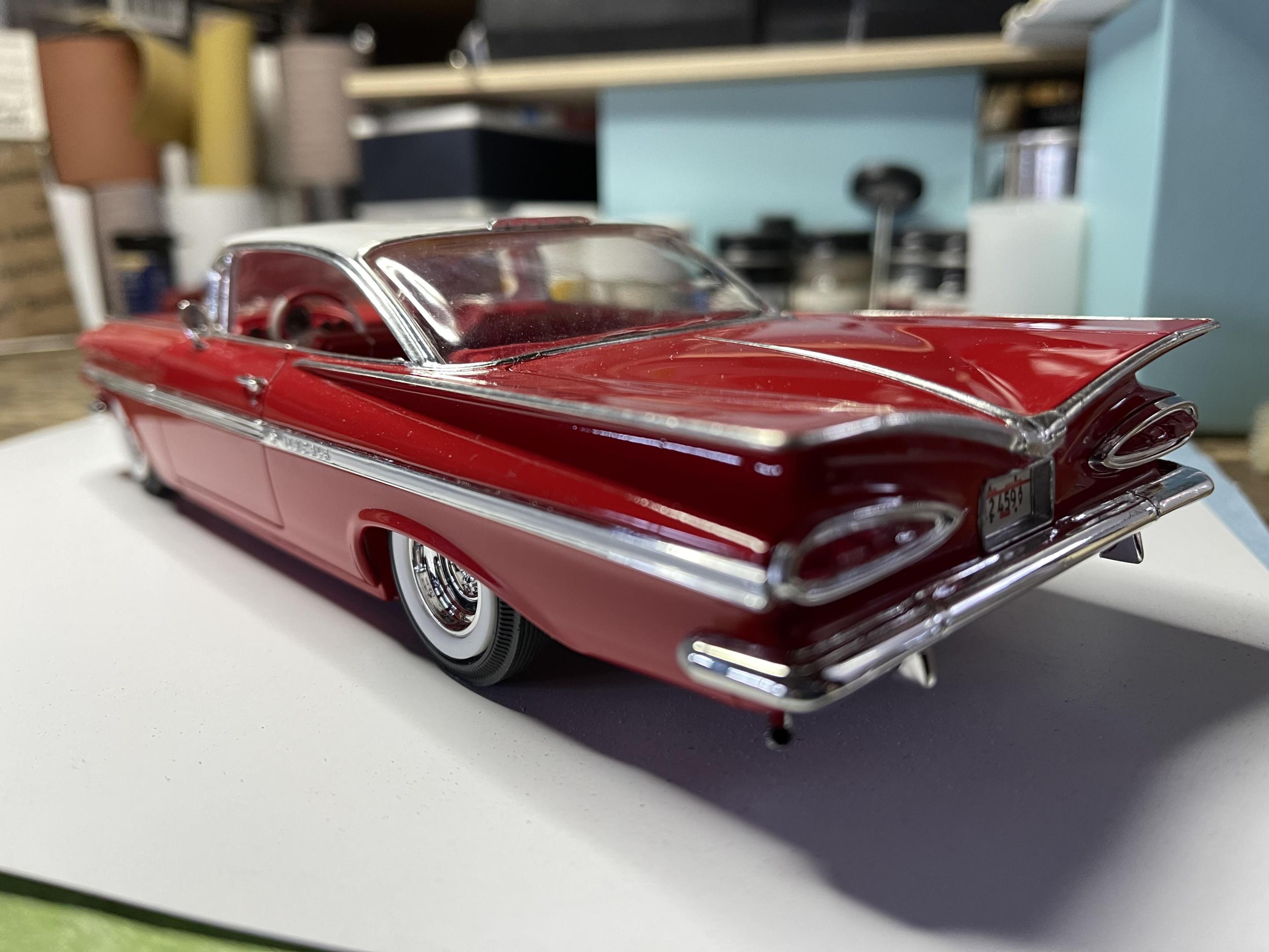 Good morning all, here is 59 Impala built by my pops about 15 years ago, some fitting issues but overall came out really nice. GM Red and white top, Sikkens paint and clear, lowered with chrome reverse wheels, otherwise mostly built from the kit itself
