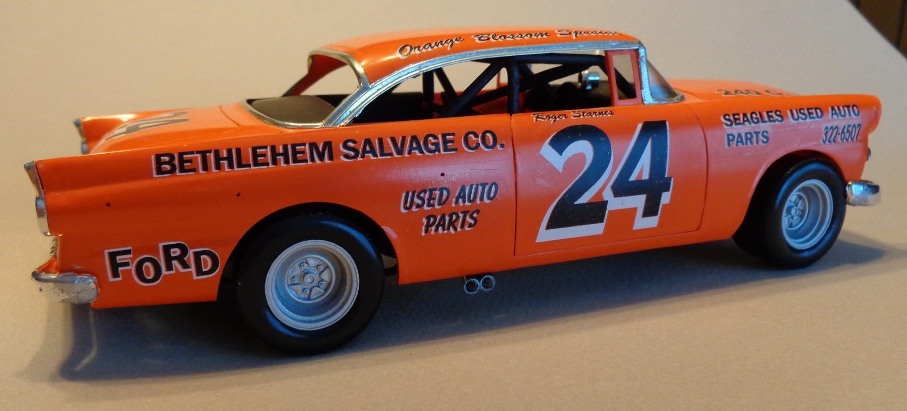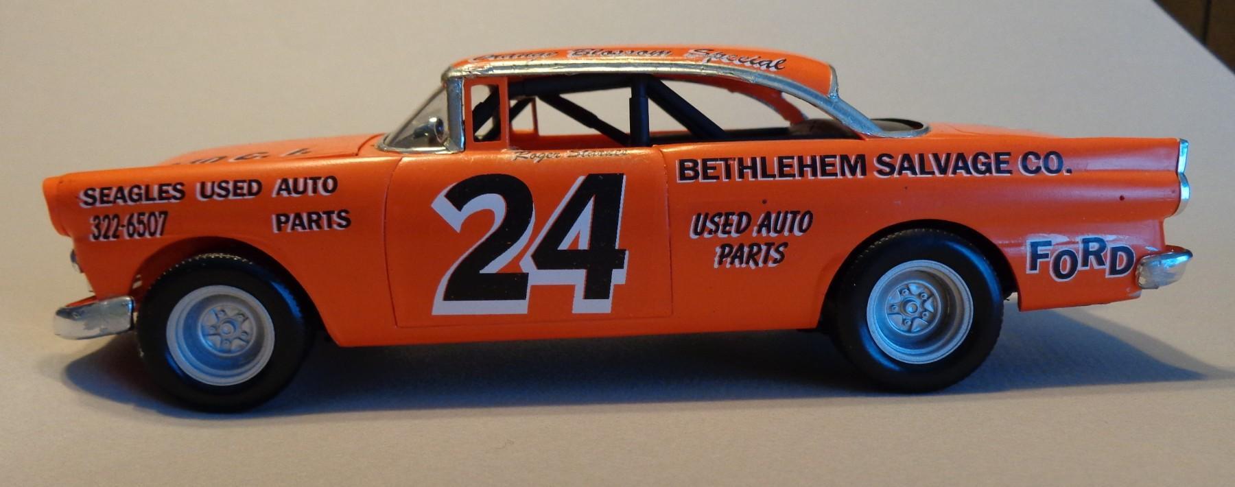 This is another stalled project that is hard to believe how old it is. I started this more like 30 years ago....just shy of the 3 decade mark!! It is a model of one of two cars that ran at Hickory and Metrolinia speedways in the 1970. The other car was #4 and between the two they won 30 of 41 LMS NASCAR races in 1974 alone. They were 240 CID 6 cyl cars while the Chevy guys ran 283 V8's. I attended most of those races that year....and LOVED these cars....to me true American race cars that could be run competitive by the average Joe. These stalled as there was no 240 CID, easy to get, and I fussed over details asI had little info on the cars. Now I just finished it up....warts and all. Testors paint.....painted MANY years ago. Penngwen Hobbies decals, PPP wheels and tires AND roll cage. I do like the finished model.....should have done so years ago.....can't take another 30 years for the #4 car!!! thx