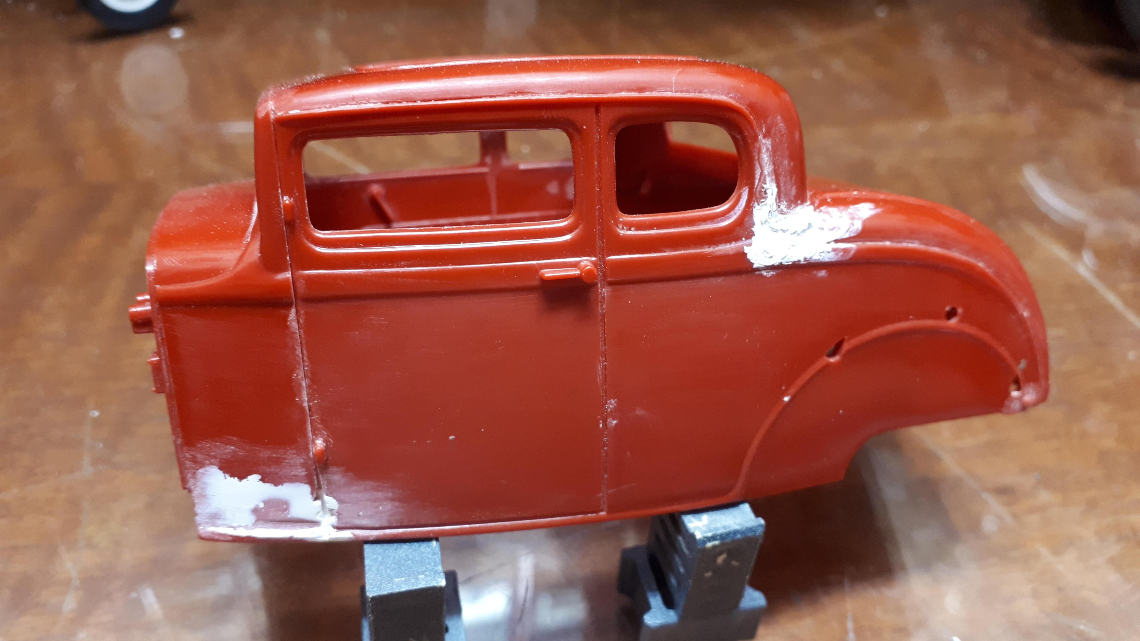 Some years ago I bought a box of gluebombed Monogram Sport Coupe parts for $25 in an Adelaide antique store. I figured there were enough decent parts in there to build one of my holy grails. recently I had another look in the box and figured I had enough to get another one out of those parts if I combined them with other parts in my stash. Before we start, for the benefit of newcomers to the hobby, this is NOT a model of a 1932 Ford Sports Coupe. It is a model of a five window coupe. The sports coupe had a fixed fabric top behind the doors, where the quarter windows are on a five window coupe. Just thought I would clear that up for those who weren't aware. The first photo shows the contents of the box. Plenty of old enamel paint, plenty of glue but the bones were there. Second photo shows the results of paint stripping in caustic soda. I got the basic body panels assembled although they needed a bit of tweaking. There were some broken pieces of plastic missing plus some fairly rugged glue joins to contend with.