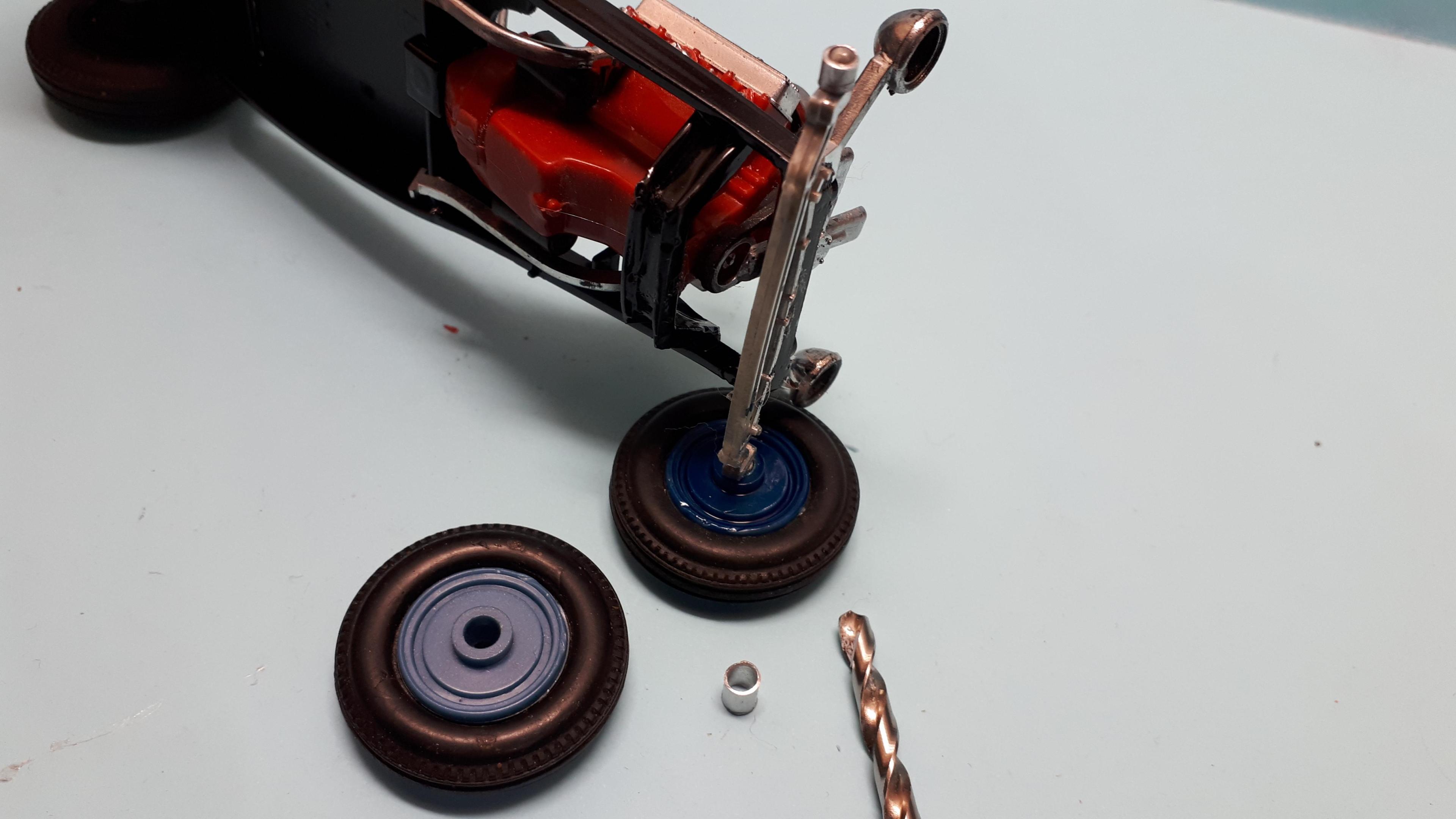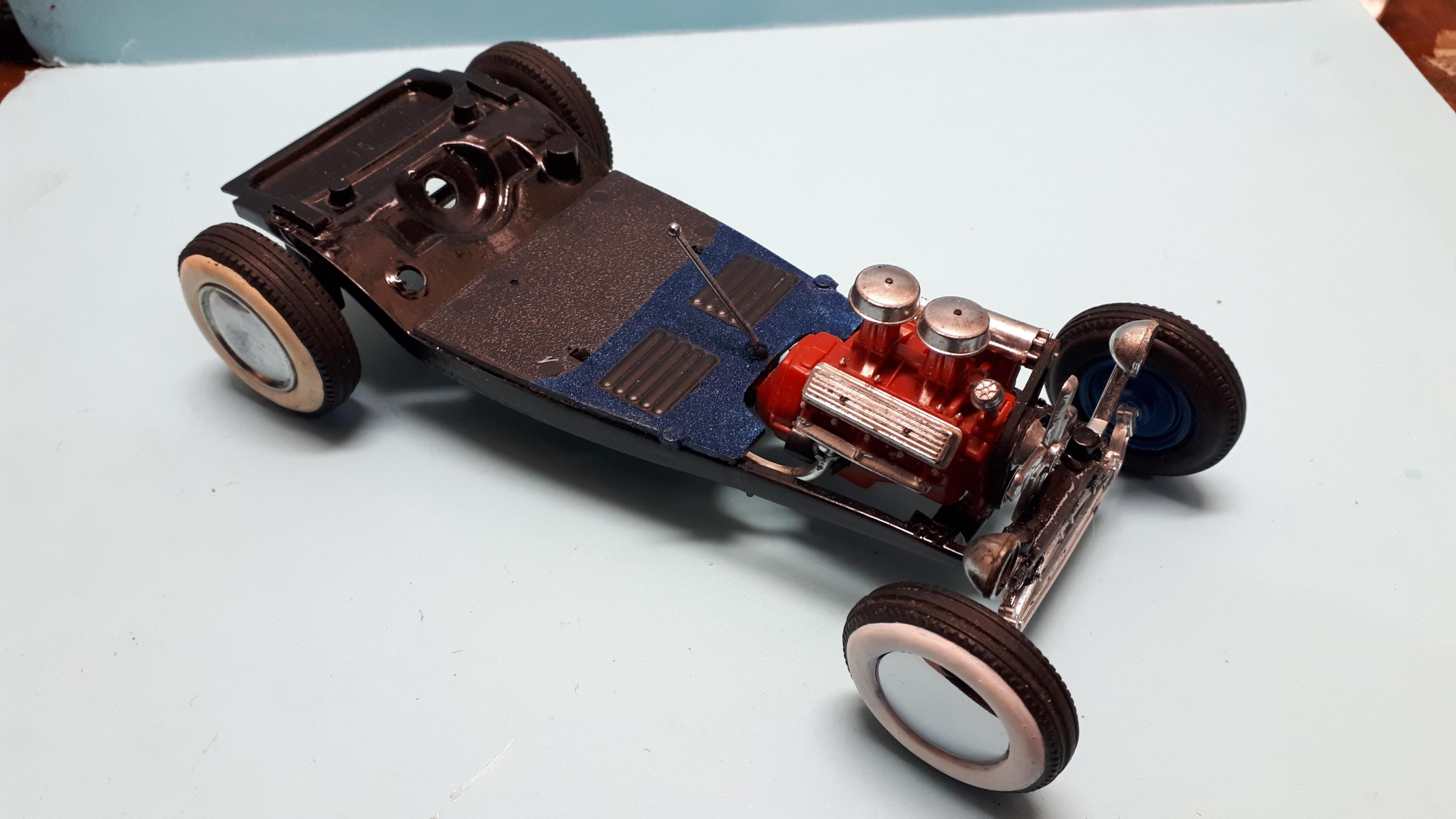 Hi Tim, this one would really ride nice and smooth with that long wheelbase! Looking at your suspension, I cant help wonder if both front and rear came from an AMT 25 T. The front axle looks too narrow for a Monogram Lil T and the skinny quickie and long rear radius rods also smack of the AMT version, as do the hairpins. Having just finished a few AMT 25 T's these components rang a bell as they say! Just a thought! Cheers Alan