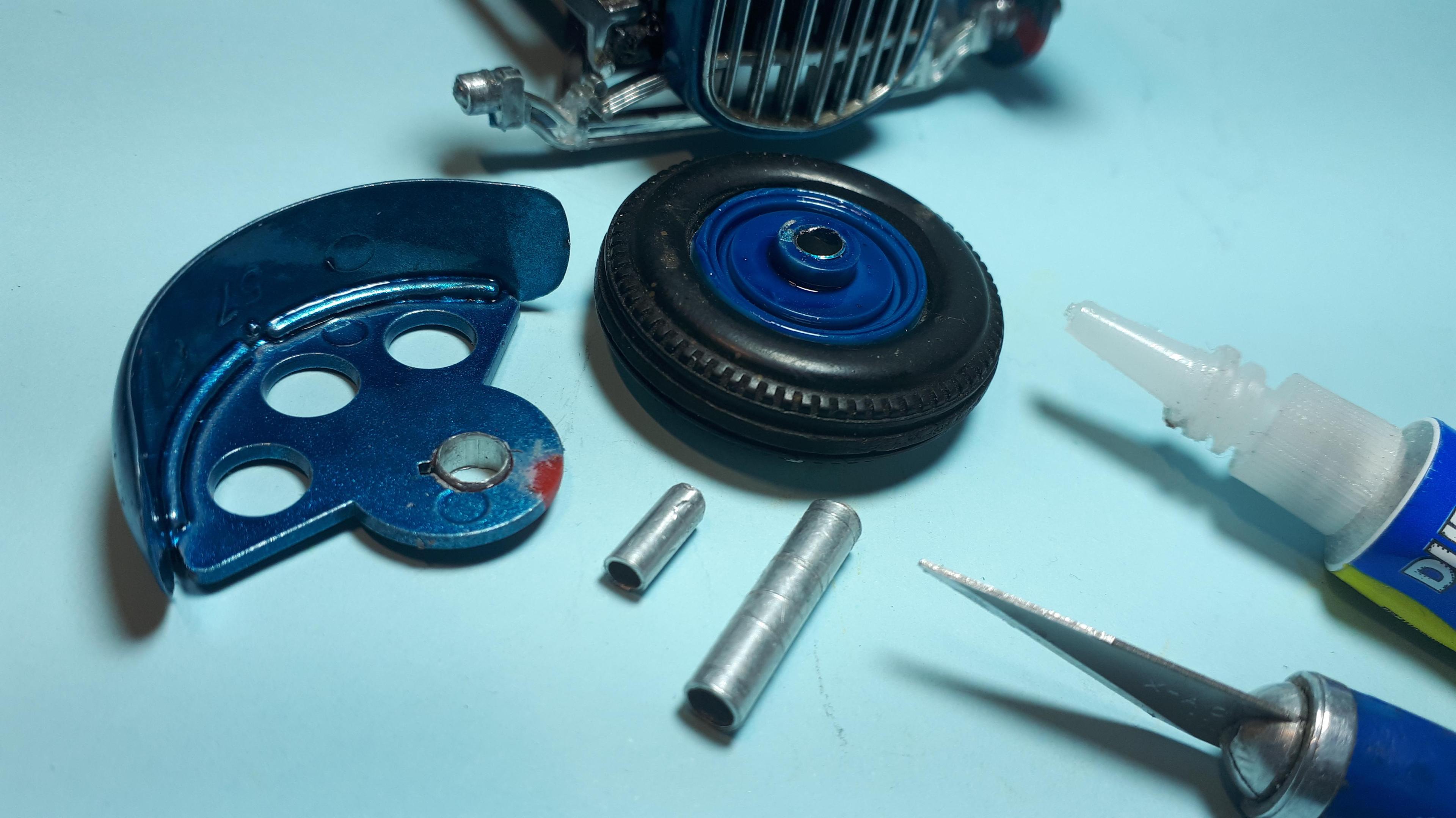 The chassis had a broken front crossmember that needed reinforcing. Otherwise all the parts were there to get it back on wheels. I considered fitting the original electric motor but decided it would only complicate things and left it out. I was missing some of the original wheelbacks so had to use short lengths of K and S aluminium tubing to make the replacement items fit the axle. Some of the tyres had handpainted whitewalls so I did the same on the replacement one that I used. Its a lot whiter but maybe it will yellow with age to match the others? Engine assembly went well and it was great to see it all together. -