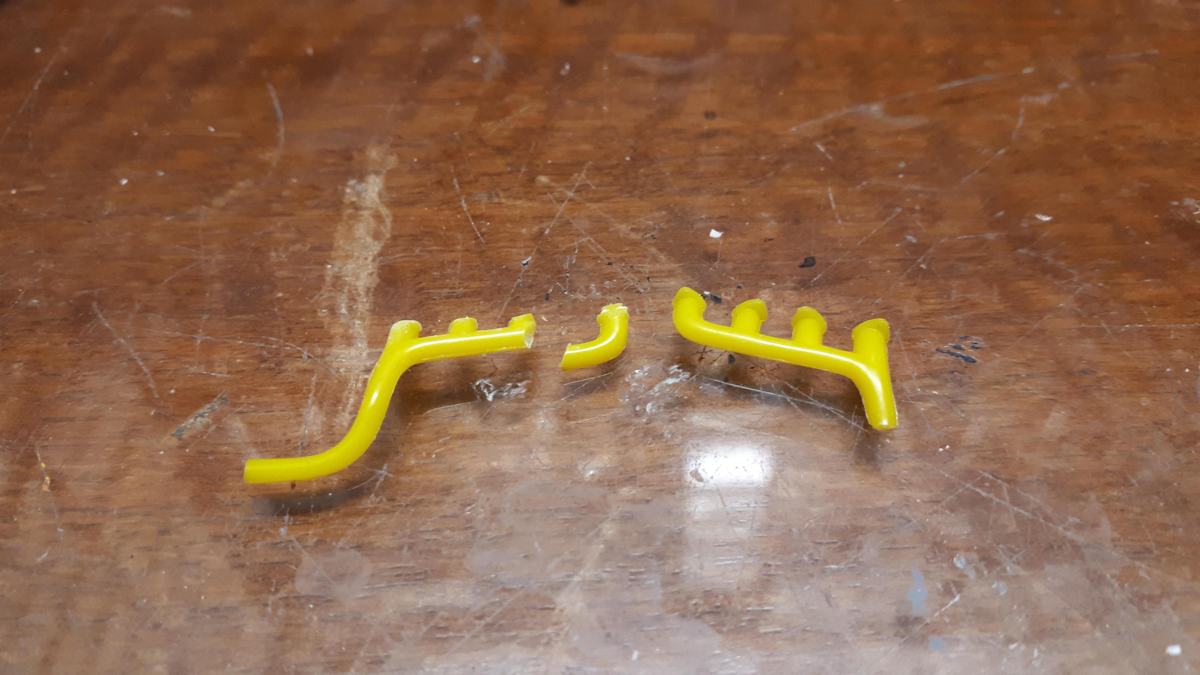 You won't have to wait much longer, Kit. The big reveal could be tomorrow, all things going well! Got a few things done today but the big one was getting the damaged pillars painted. Next I made and chromed the exhaust. I used Evergreen # 222 and bent it between my fingers. I then taped it down and painted the underside of the pipes. When they were reasonably dry, I carefully fitted them onto the car and then painted the top side, thus minimising handling the Molotow chrome. Very happy with the outcome. I also made a radiator support bracket for the top of the radiator, a radiator hose and alternator brackets - can't have floating alternators, can we? Tomorrow just need to install the radiator parts and fit the overhead console and that should be it! See you then. Cheers Alan