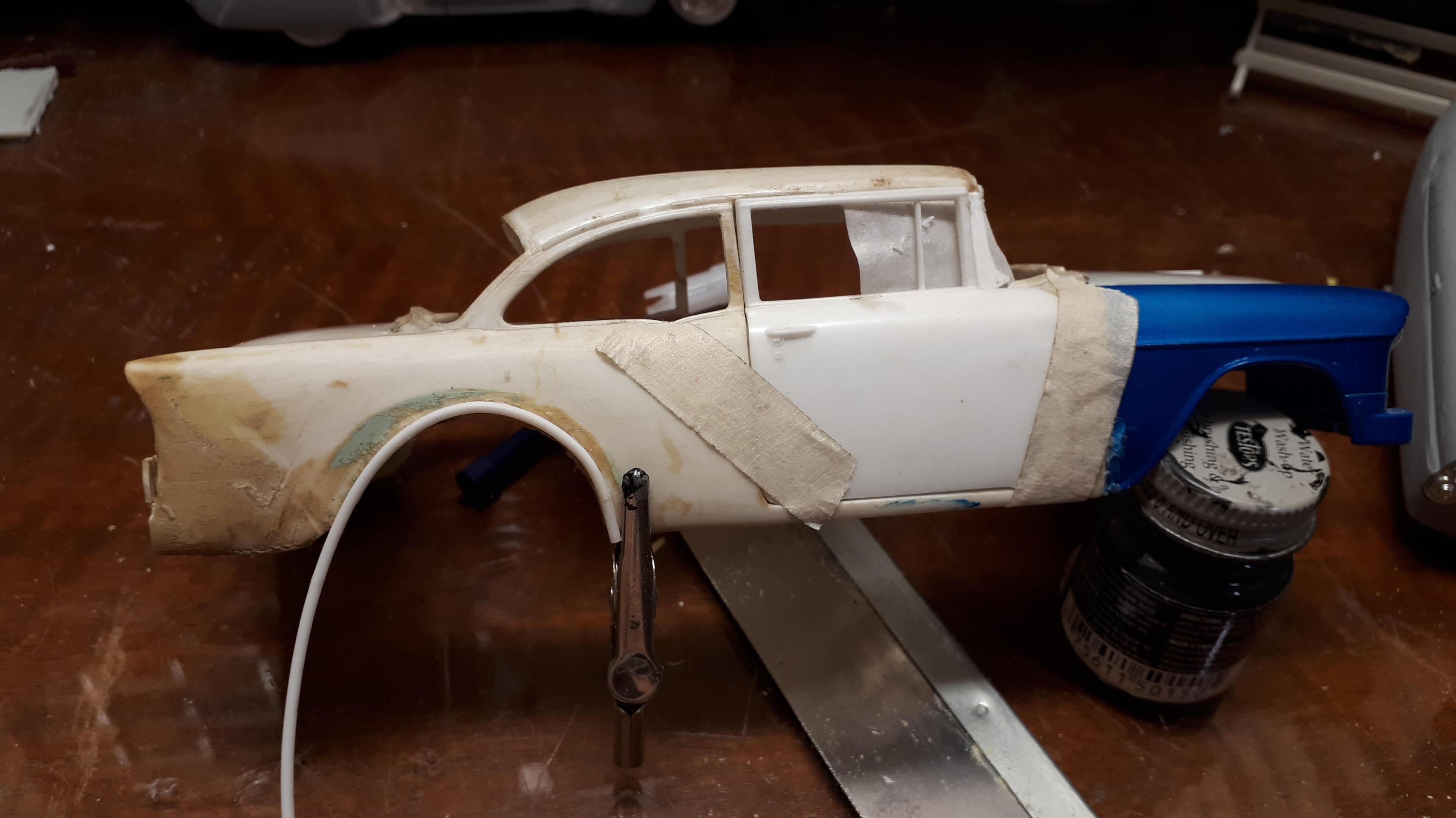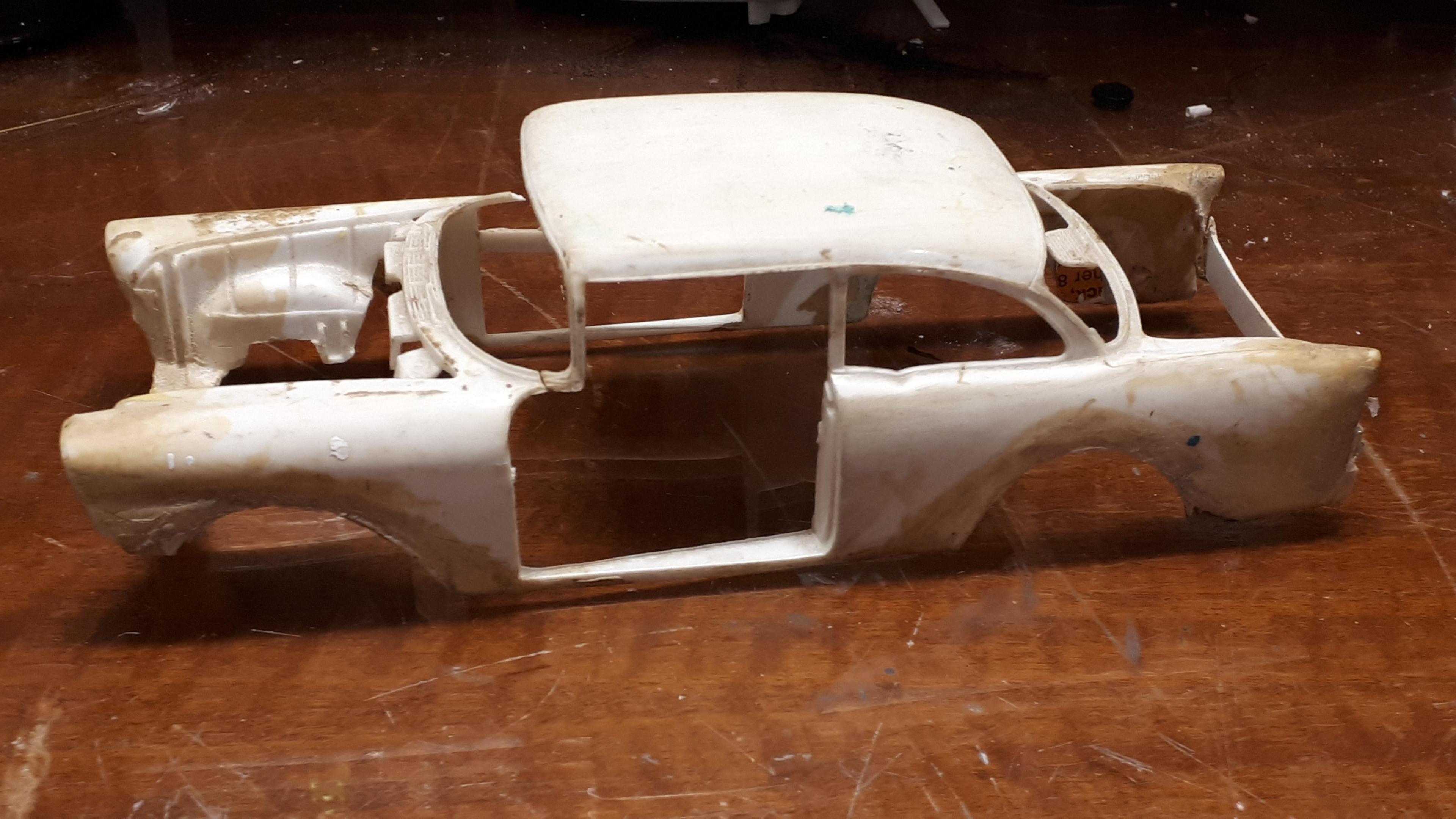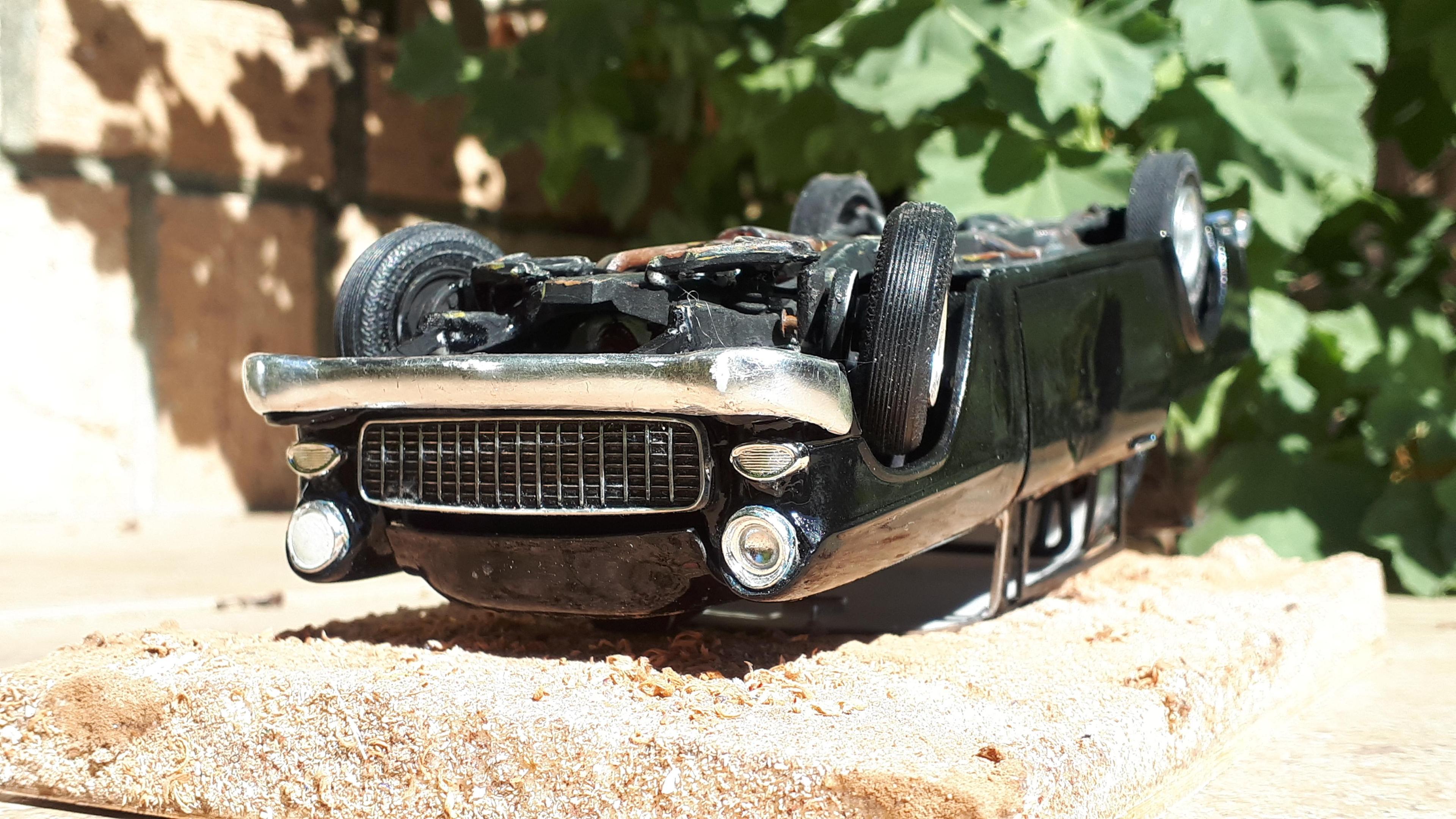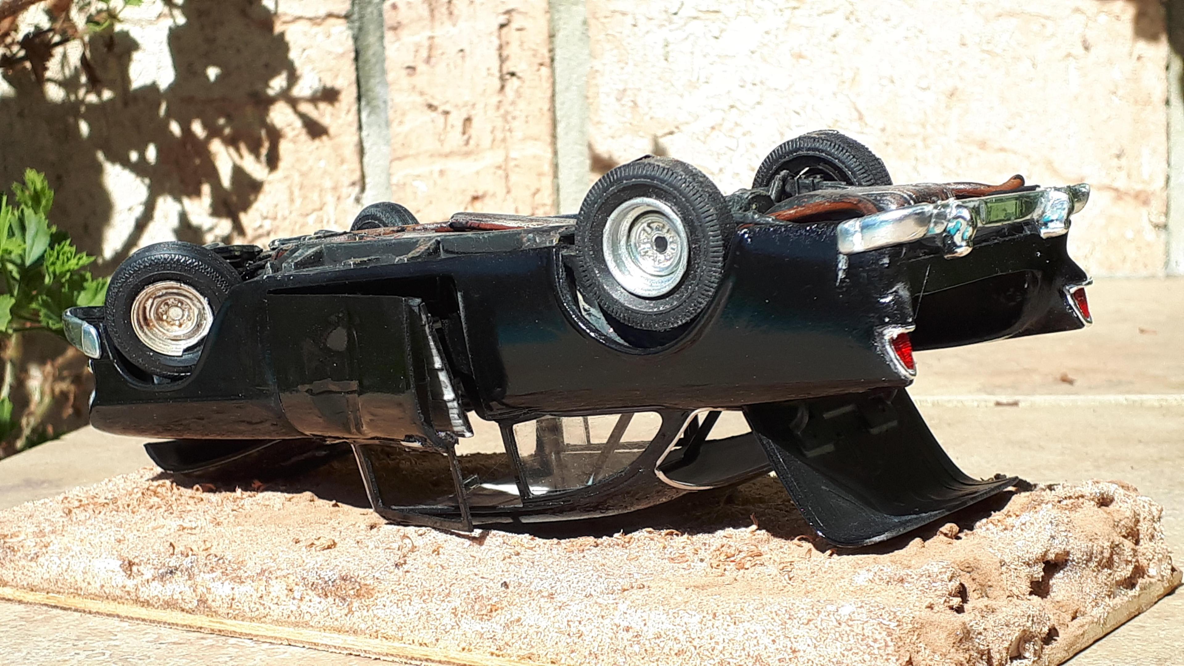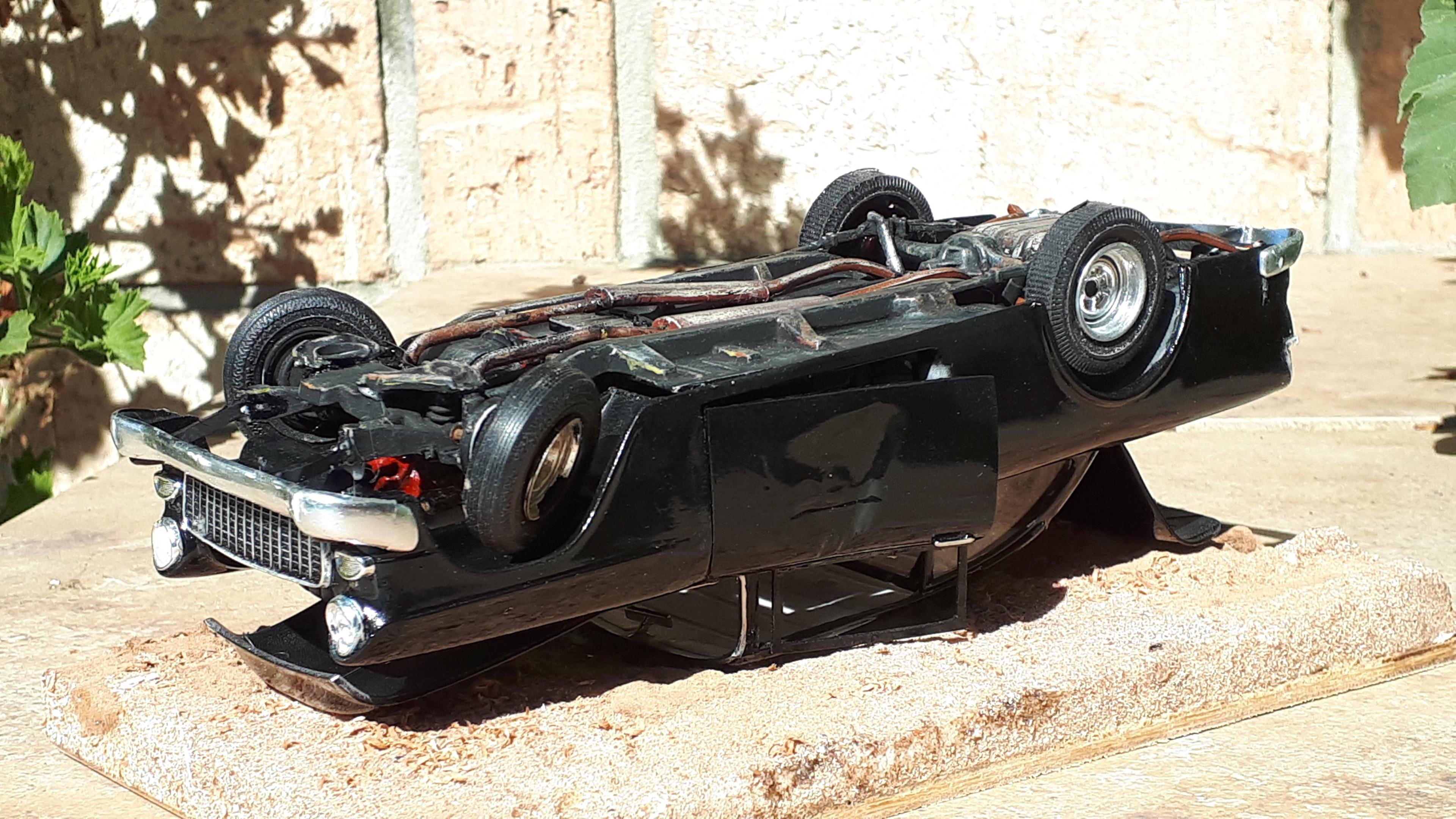 I mentioned our club's American Graffiti diorama when I posted my 61 Galaxie police car from the famous "ripped out rear-end" scene. At the same time I was also building a '55 Chevy for the rollover scene. It took a lot of freeze framing to get all the research information I needed. Compounding this is the fact that there are three separate cars in the scene. The drag race with Milner's coupe starts off with the movie "star car". The car rolling over is a second car simply bodgied up for its short moment of infamy and the final car is actually a 55 hardtop with pieces of painted timber wedged in place to look like a sedan. It obviously is not the car that is seen rolling over because the front fender, especially the right hand one, is still intact with a working headlight, after supposedly completing a heavy roll over starting on the right hand corner of its nose! I chose to build the thirds car but as if it was a true sedan, not a hardtop. I started with a very sad Revell '56 Chevy post sedan that my brother attempted to convert into an Australian Holden about 50 years ago. The conversion was clearly beyond our combined teenaged skill set and it has languished in a box ever since. It had broken A pillars but amazingly the door sills had never snapped and the chassis and steering was still intact. You can still see the orange diff and fuel tank that would have been very "on trend" in the early seventies! The highly detailed nature of these early Revell kits suited the bill perfectly for this model, as it needed to have opening panels and would be perpetually displayed upside down. I call it my "Doesn't Matter" model because, being displayed upside down and having suffered a rollover, I could overlook flaws that would normally stick out like a sore thumb. Briefly, I cut the ravaged 56 front clip off just in front of the cowl vent and the door hinge mounts, to preserve these details. I then carefully removed the front clip from an abandoned AMT 55 hardtop that I acquired somewhere and joined the two sections. The hood scoop is from a Monogram Early Iron series 40 Ford pickup with the details sanded off. I had an odd scrap of a rear 55 taillight section that I grafted into the LH side and used putty to modify the damaged rh side 56 quarter into a 55. The engine came from the parts box and as the rollover car was a Powerglide, I fabbed up a simple plastic tranny pan to glue straight onto the "four speed"- doesn't matter!. One door is shown damaged in the movie but the doors on the 56 were perfect and I couldn't bring myself to damage one so modified a rough Revell 57 Nomad door instead. The chromies are tatty ones from my parts box that don't even match but, hey, "doesn't matter"- they got damaged in the rollover! I also glued thin plastic around the windshield opening to simulate the flange that the rubber grips onto - I do this a lot on my speedway cars as well as it subtly hints at the body being a real steel car. The final paint was very cheap hardware store black enamel '-"doesn't matter" - which actually looks a lot better in real life than in the photos. Being a movie car I didn't want it too nice anyway. Rather than use heat to damage the rolled over roof, I made a simple base out of packing foam with a depression in it to accommodate the original roof - who knows, I might want to restore the car one day! The car has been displayed twice now and will have its final outing in December at our annual hot rod show. It looks the part and best of all, was made almost entirely of otherwise unloved parts. Definitely a case where the whole is greater than the sum of the parts! Cheers Alan