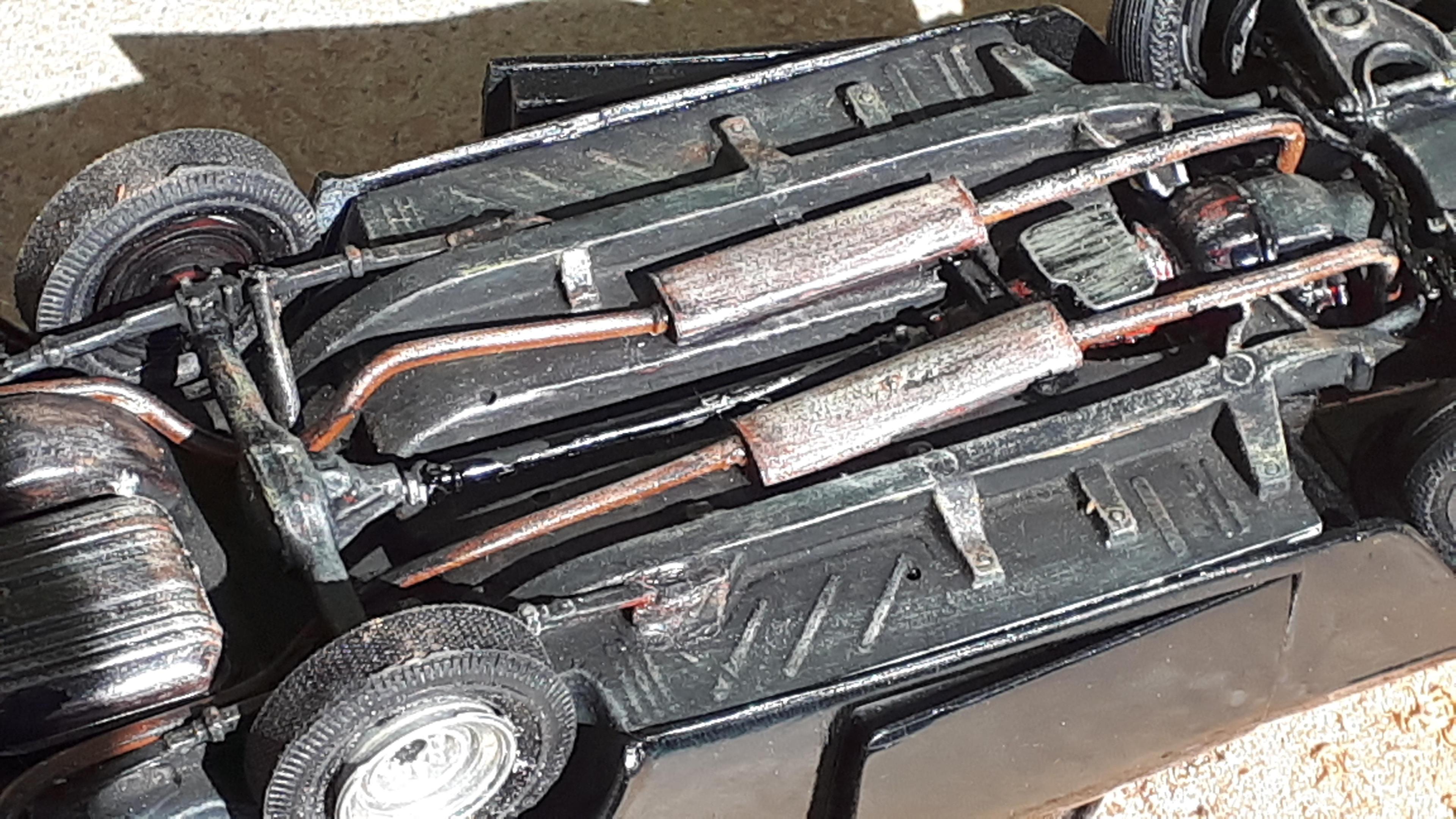 First off, I think Pete's paint job just lifted the bar for all of us! Wow, is that going to look amazing. Had a slow and steady day today. The pillars are repaired and the doors are hung so tomorrow I will get the pillars repainted and put them aside to dry. I dropped the chassis onto the fender unit this evening and spent a long time working out how to run the exhaust. As I did so, I realised how close the layout of the crossmembers is to my own 1:1 in the garage - and the mufflers have ended up in nearly the same spot. The real ones are actually canted slightly so that they tuck up under the valance panels but on the model flat above the frame rails will work fine. Letting them set nice and solid overnight before connecting up the pipes. Those mufflers are off the ZZTop 33 coupe, again, almost identical to my real ones except both my outlets are offset, not one end central like the model. Finally put a decal on one door before I head for bed. It may not stay on the car - it was ultra fragile and started to tear but worse still, had a film underneath. I have been known to wash that film off but it will never happen on these ones. I have used some Micro Set ( but no Microsol afterwards ) and will see if it dries clear in the morning. If not, they come off. Cheers Alan