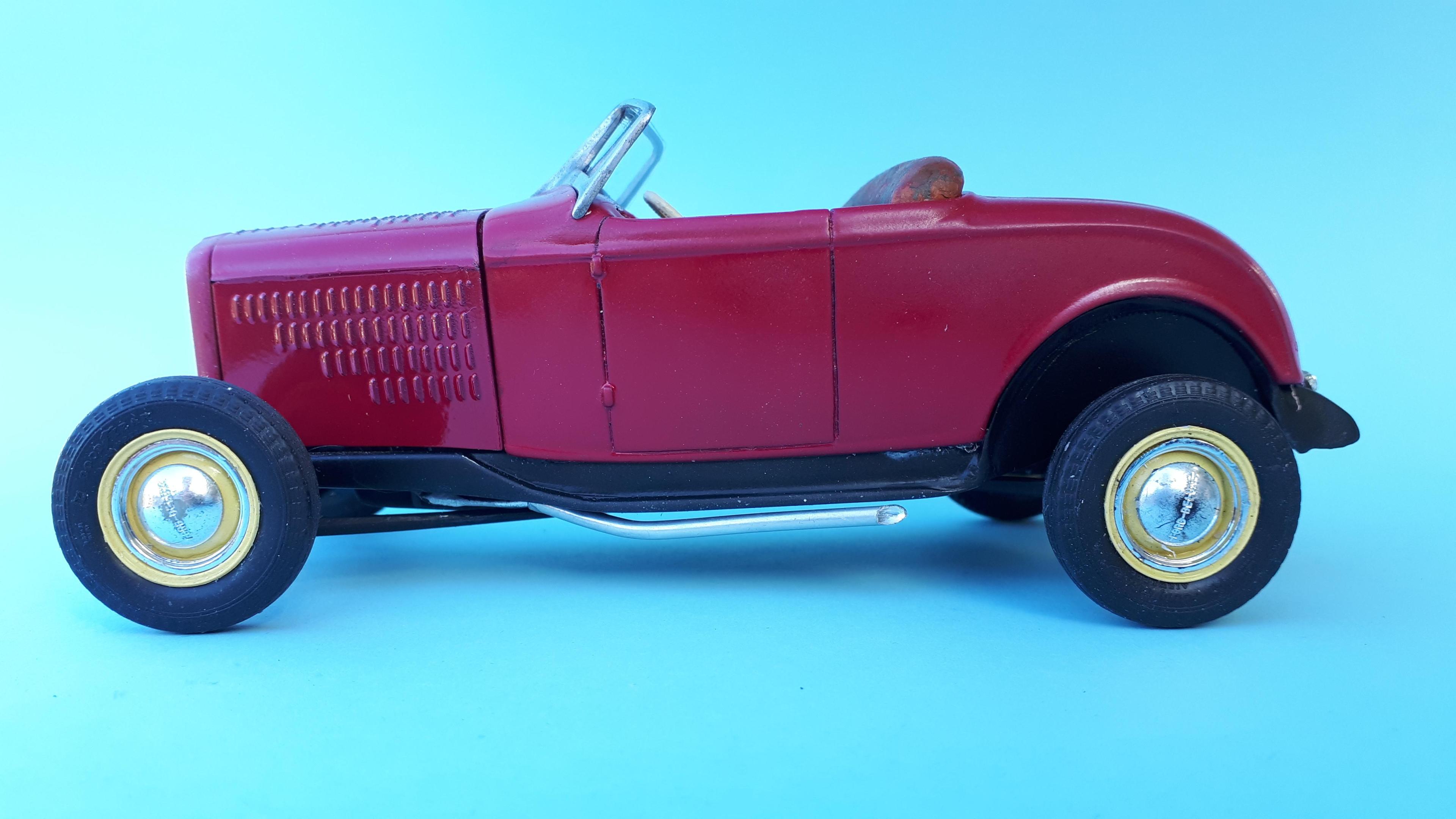 This build started with a Jimmy Flintstone resin body of a chopped 29 Model A Tudor, bought through stiffkitty on eBay many years ago. The thick body discouraged me from going full bore into detailing the interior and now that it is finished, you can hardly see anything in there anyway. The resin body has scratchbuilt firewall and wheel wells from aluminium printer's plate. The chassis is an almost stock Deuce hiboy frame from the Revell Model A coupe and roadster kits, using the blown small block Chevy that comes in the kit. I did add a fabricated X member using Evergreen rectangular section styrene.The rear wheels are from a first issue Double Dragster kit and I think the Firestone slicks came from a first issue 57 Chevy kit. The front wheels are also from a Double Dragster. The rear axle and spring are from a Red Baron kit. I chose a cheap auto shop spray can enamel ( Aussie Export brand) purely for the colour but it has taken years to dry and I can still leave fingerprints on ( not in) the surface way too easily. Tis not a great paint job and it has rubbed through in spots so I will call it patina and move on - but I won't be using that can of paint again! The style is traditional but in all likelihood it is a contemporary fairgrounds type cruiser. Most of this chassis was built from the parts remaining after building the channelled version of the Revell 1930 coupe. The rear axle and radius rods, rear shocks, wheels, tyres, Moon tank and seats came from the parts box, illustrating just how easy it is to get two cool models out of the one box if you have a decent stash of parts. I'm really glad I bought about ten of them! Cheers Alan