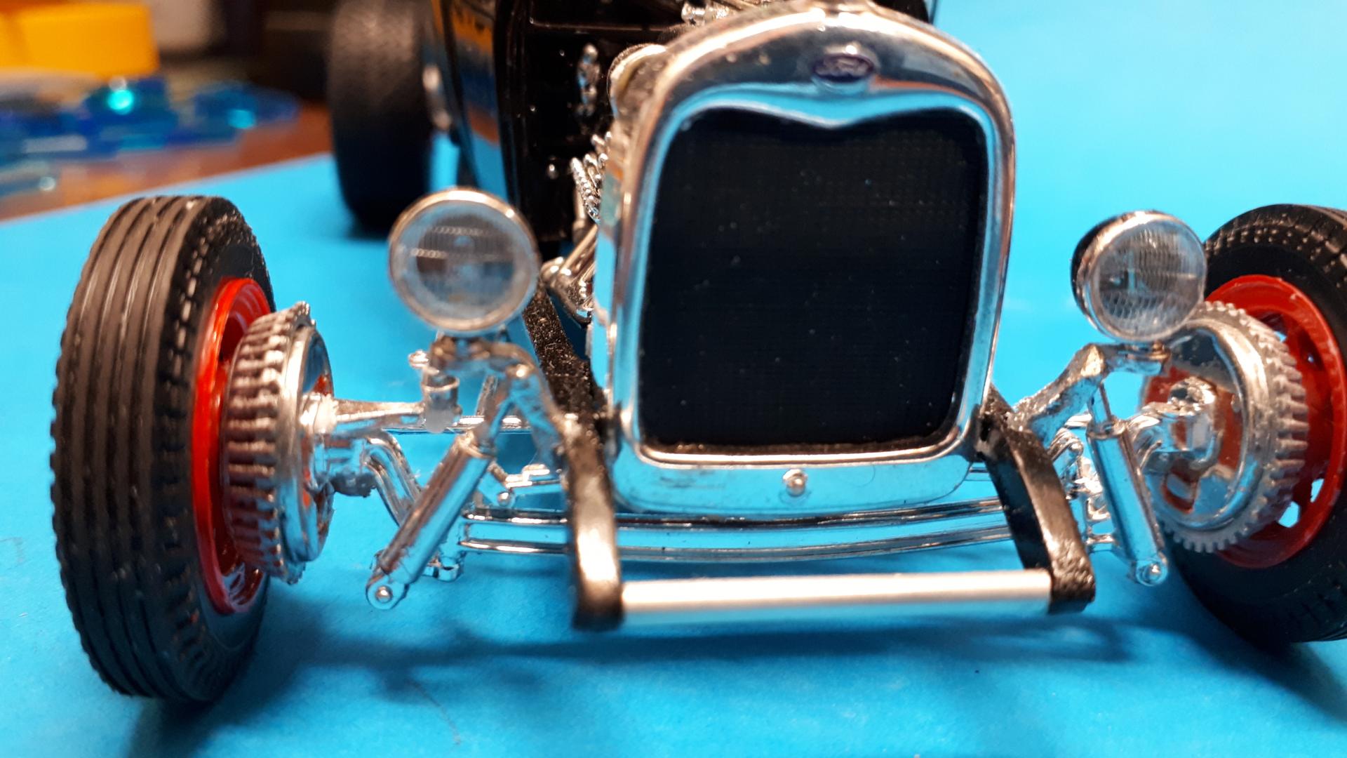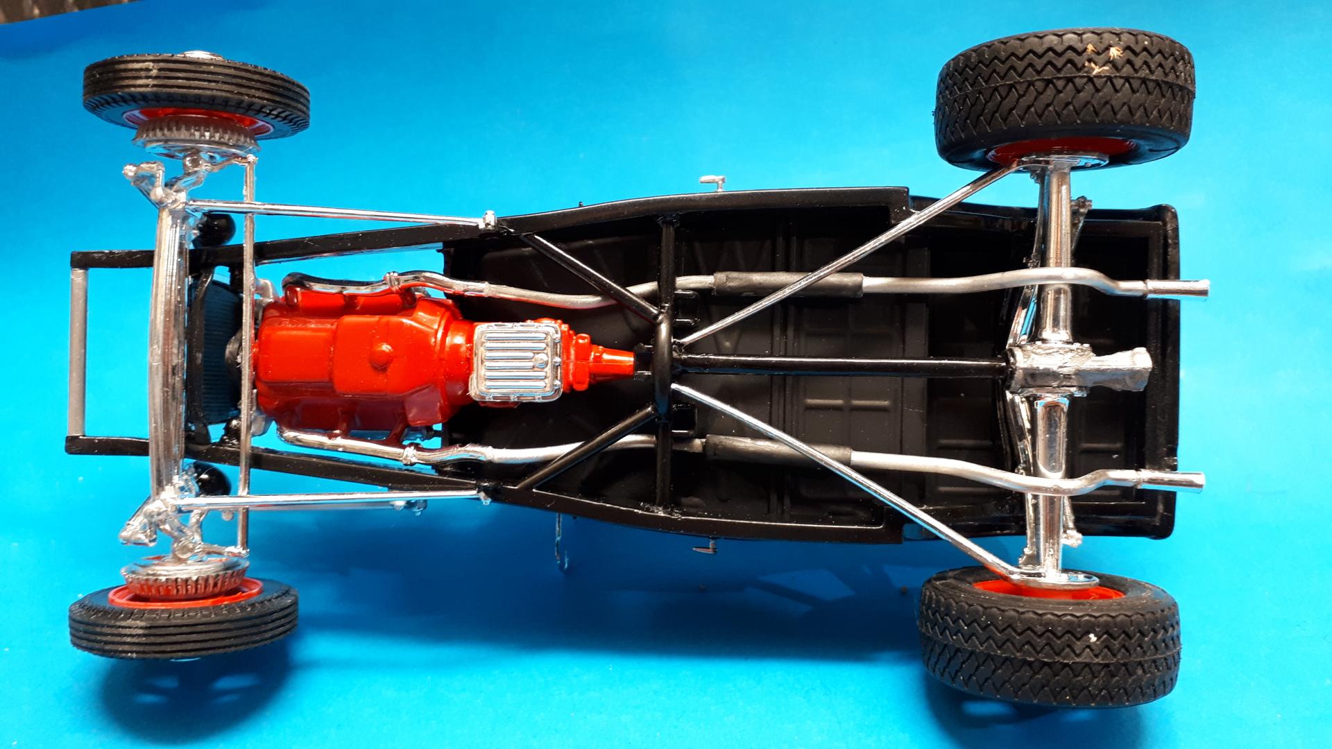 It is basically the stock kit frame with a few significant changes. The rear crossmember from an AMT 29 frame has been used to replace the fabricated crossmember that Revell used. I then used the axle tubes, spring and radius rods from a Revell 31 Model A Tudor kit, with an unknown resin quick change 3rd member. The front engine mounts were replaced with small stubs to accept the engine crossmember from the Revell 32 Tudor flathead that I used in its entirety. Two tubular braces were added to the stock gearbox crossmember. The top of the front spring crossmember was carefully sliced out to allow the spring to sit lower and the front surface of that same crossmember was filed as flat and thin as I dared, otherwise the grill shell was going to sit far too far forward for my liking. Finally, I filed down the rear surface of the AMT grille shell, again to allow the radiator to sit over the axle centreline as closely as possible. To my eye, this is really important otherwise the whole axle/grille/headlight arrangement is going to be compromised. I had plenty of spare AMT grille shells and radiators which gives a much crisper result than trying to paint a perfect black radiator on the Revell one piece grille.