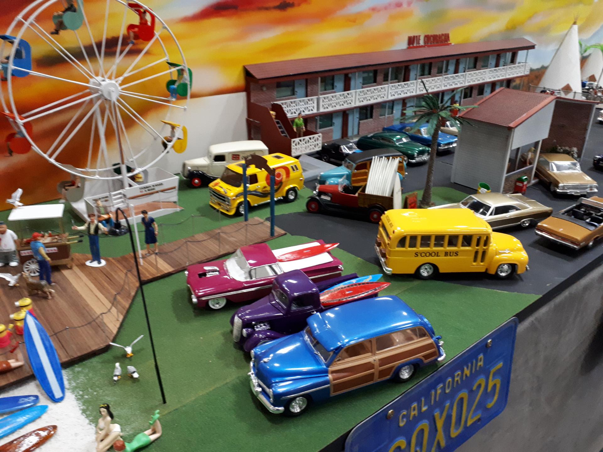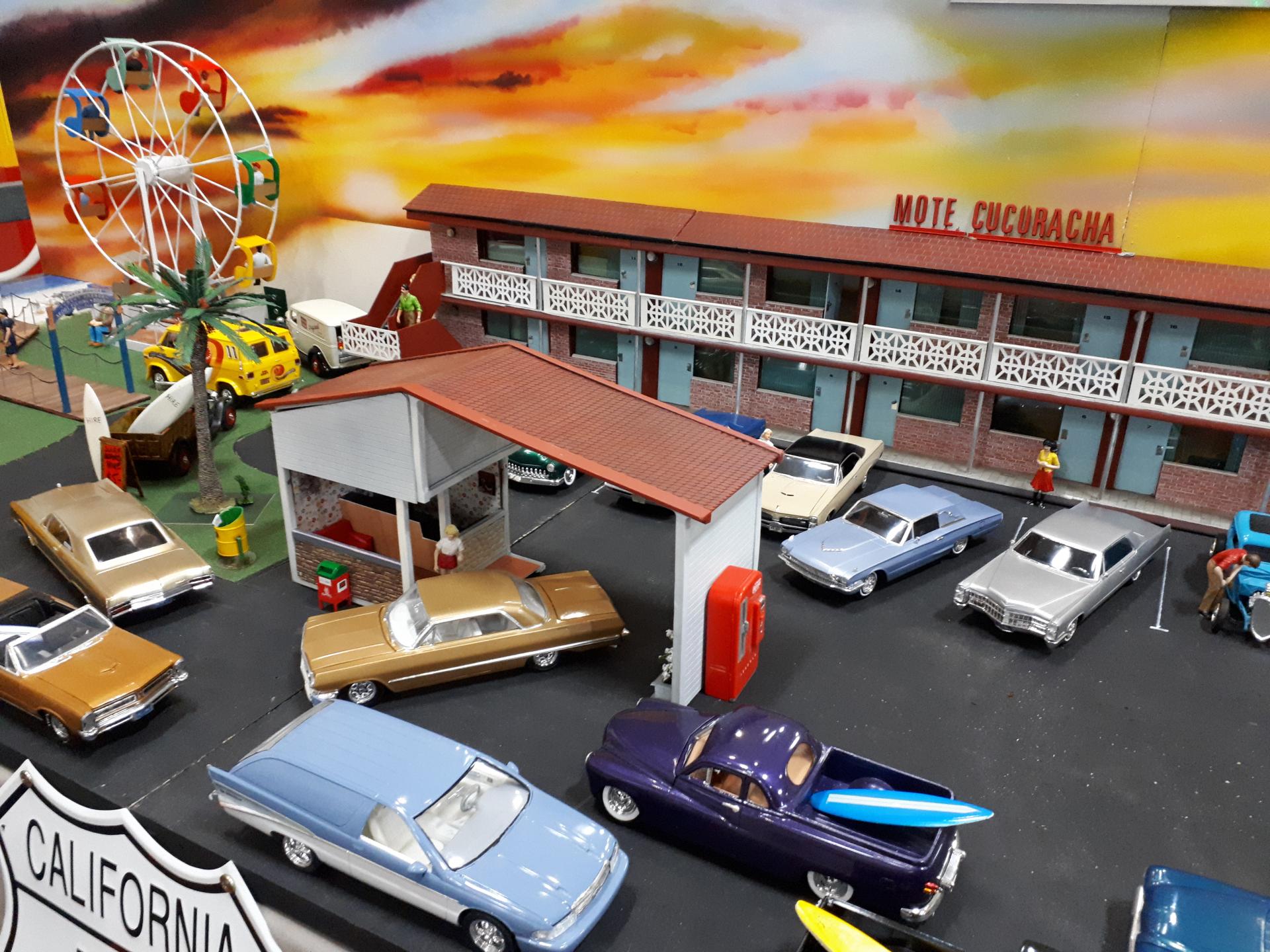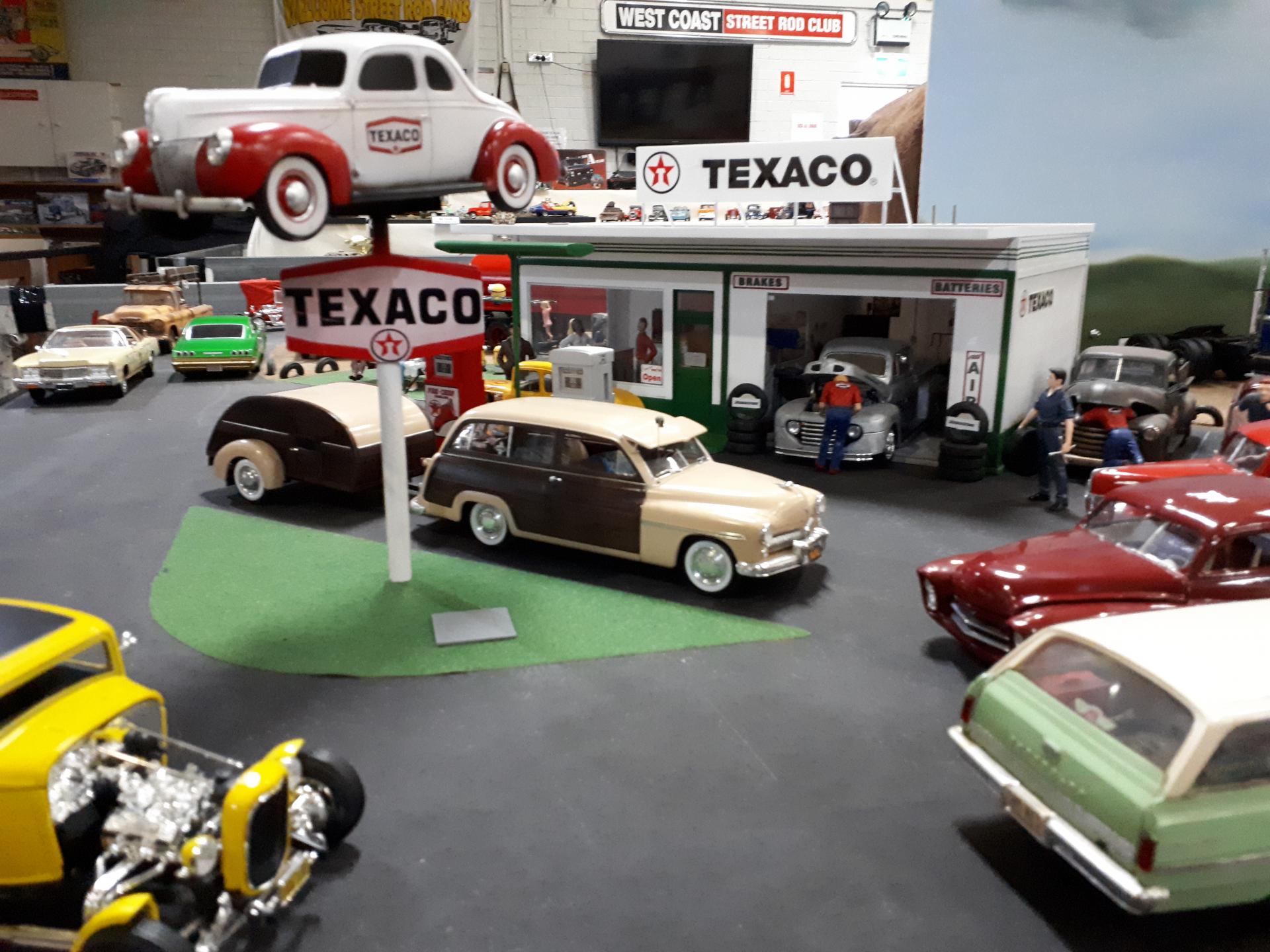For the past five or six years the members of Perth and Districts Model Club here in western Australia have been collaborating to build giant dioramas to display at the annual Hot Rod and Street Machine Spectacular, the Super Model Car Sunday NNL and the WASMEX model show. This year we chose to do a representation of Route 66 with vignettes to represent typical features of each state along the way. The main culprits were Rob Rattray DIner, Gemini Rocket Man, Cadillac Ranch, Texas Gift shop, Rock shop and main cordinator, director and cattle prodder for the whole deal Alan Barton BP Garage and Motel Cucuracha Brodie Puleo Texaco Garage Tony Ashton Wig Wam Motel, Santa Monica Pier Grant Elliot Caves and tourist shop and Railway Crossing Nick Car yard Ian Catchpole Train Yves Zuber airbrushed backdrop, all 40 or so feet of it!