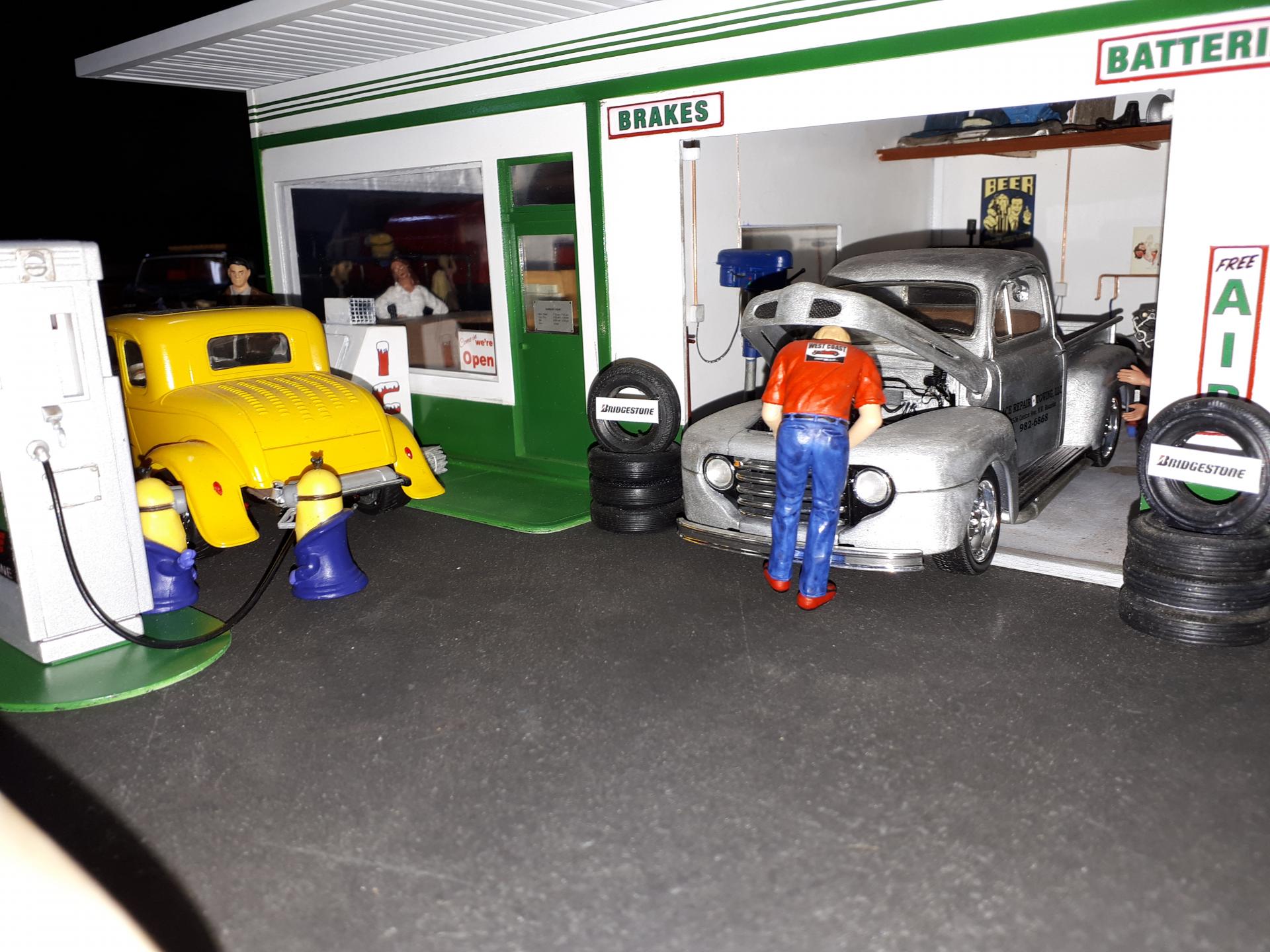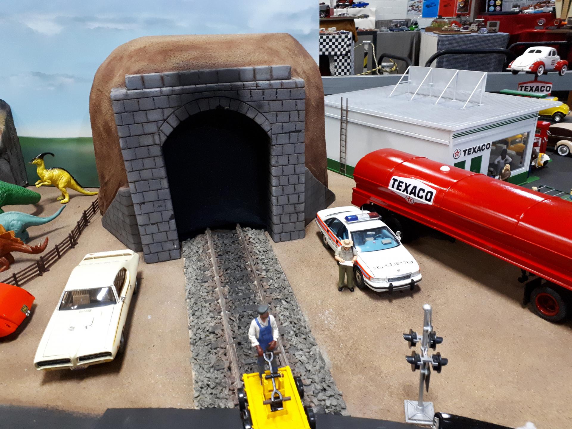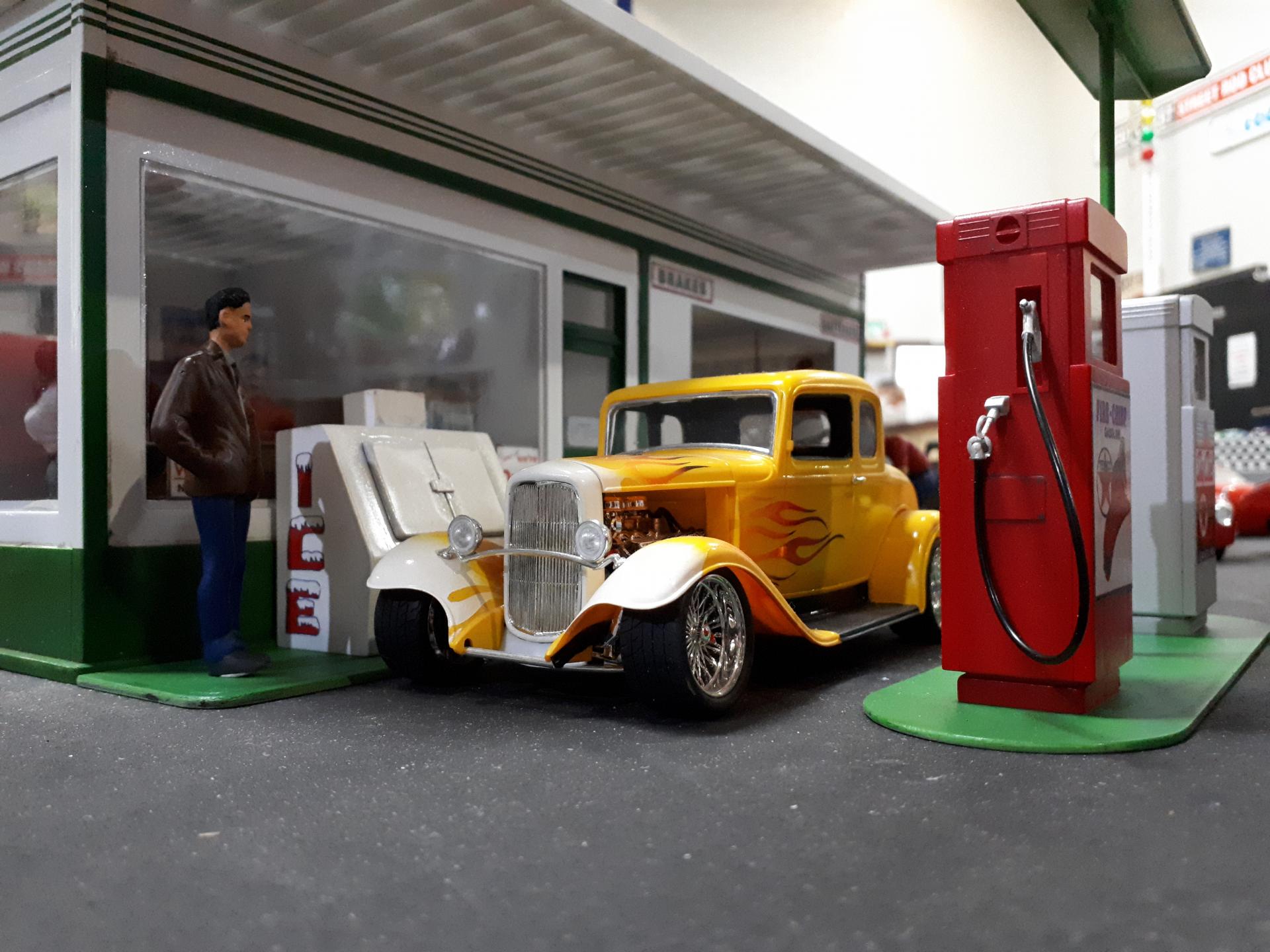 For the past five or six years the members of Perth and Districts Model Club here in western Australia have been collaborating to build giant dioramas to display at the annual Hot Rod and Street Machine Spectacular, the Super Model Car Sunday NNL and the WASMEX model show. This year we chose to do a representation of Route 66 with vignettes to represent typical features of each state along the way. The main culprits were Rob Rattray DIner, Gemini Rocket Man, Cadillac Ranch, Texas Gift shop, Rock shop and main cordinator, director and cattle prodder for the whole deal Alan Barton BP Garage and Motel Cucuracha Brodie Puleo Texaco Garage Tony Ashton Wig Wam Motel, Santa Monica Pier Grant Elliot Caves and tourist shop and Railway Crossing Nick Car yard Ian Catchpole Train Yves Zuber airbrushed backdrop, all 40 or so feet of it!