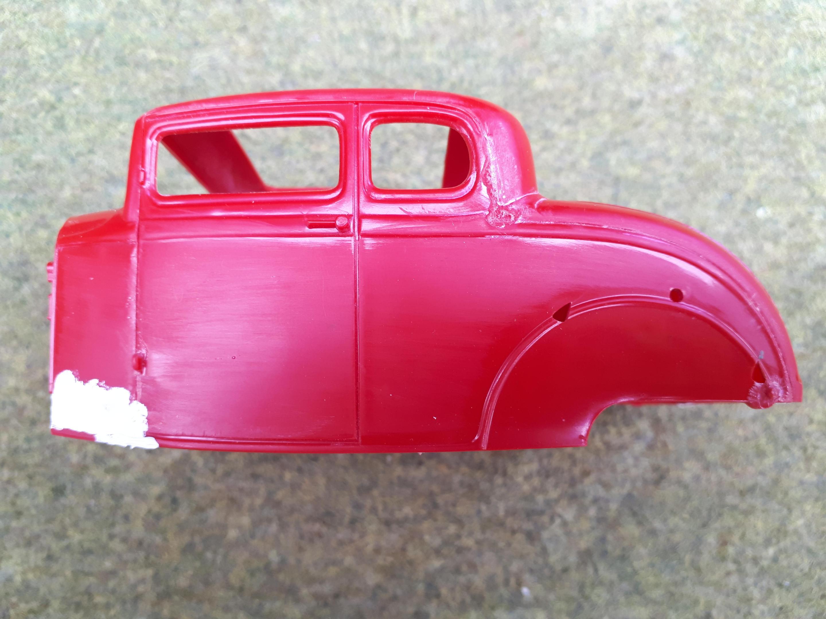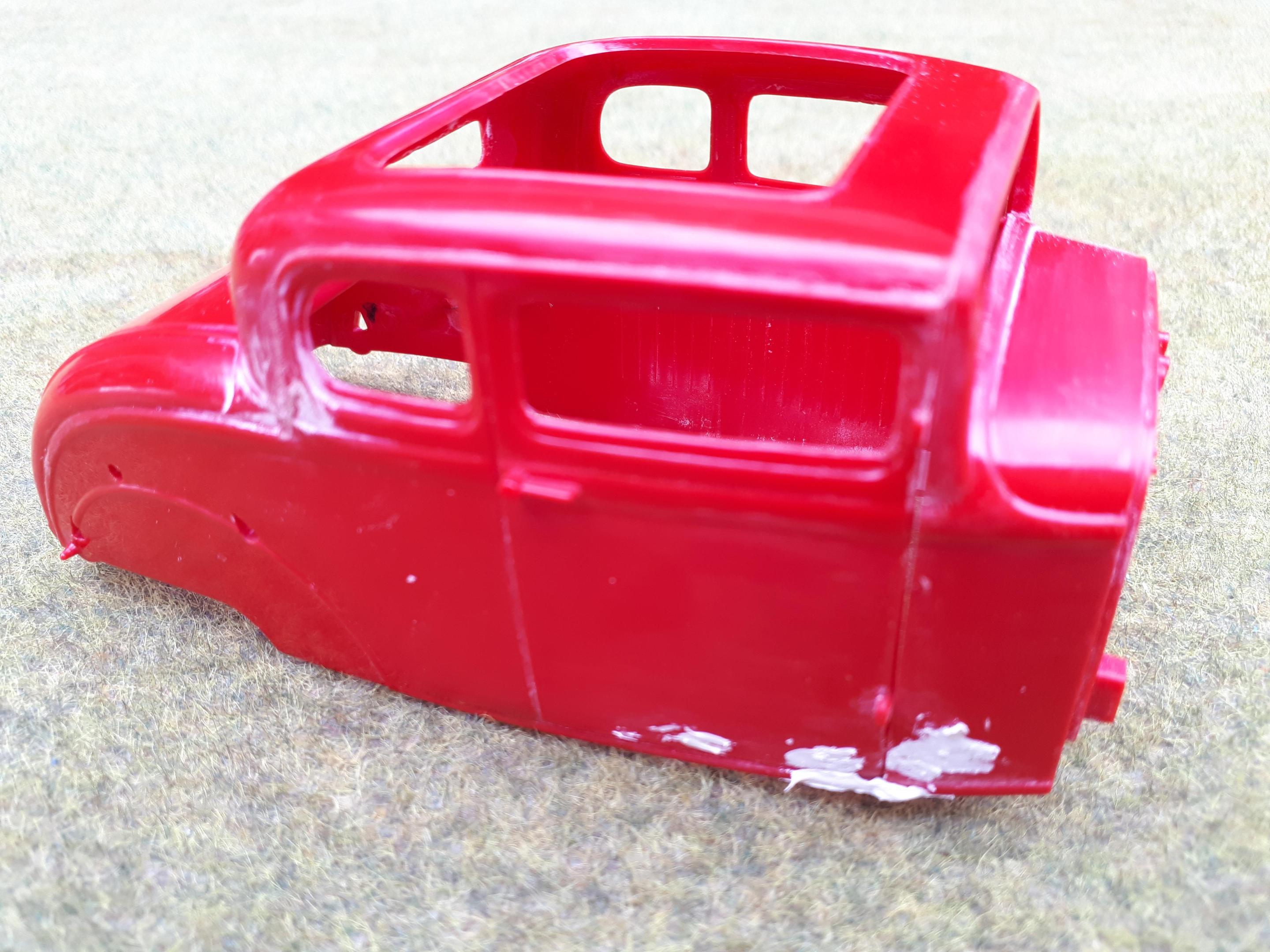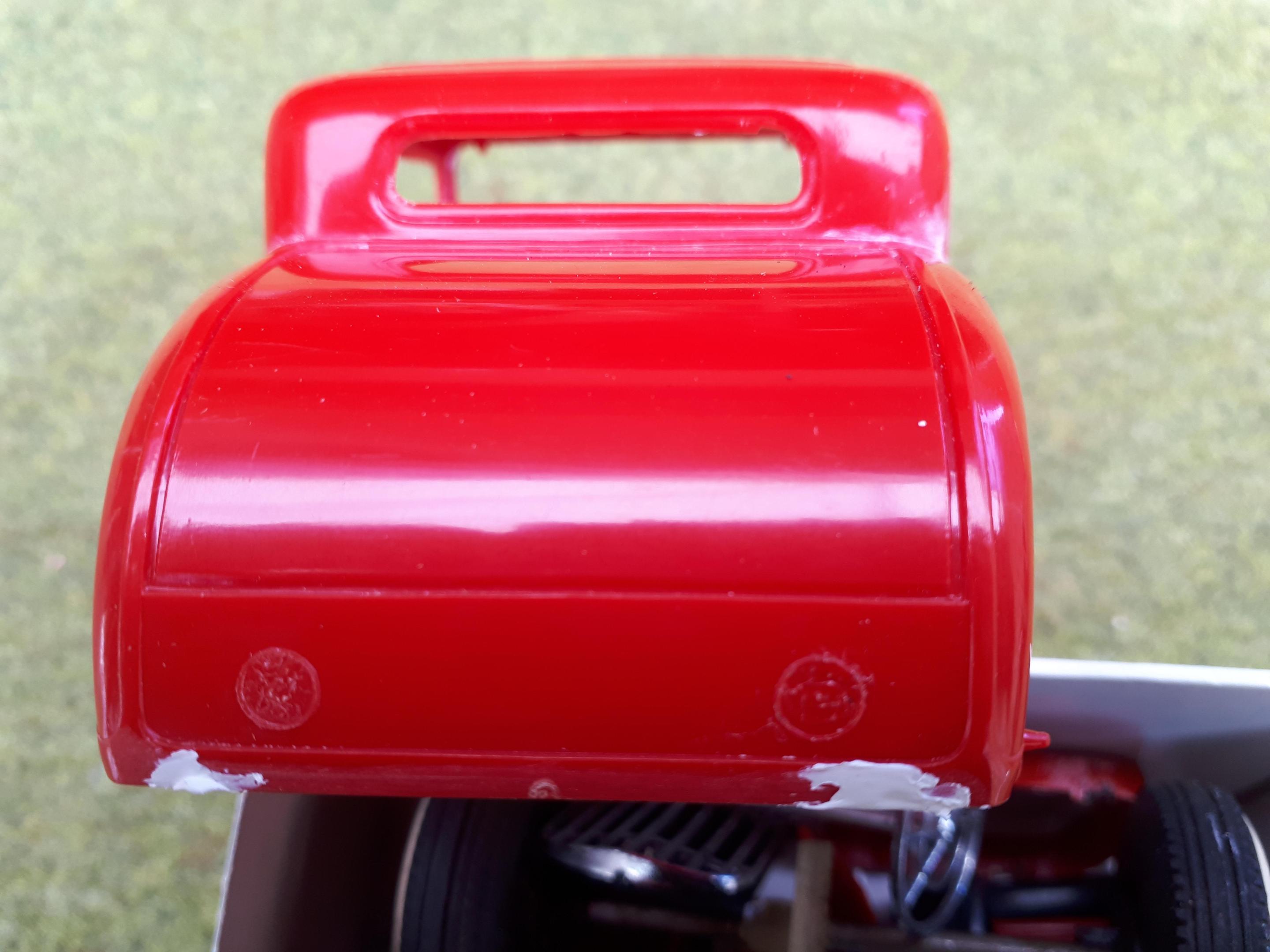 Truth be known I started this project several decades ago, not long after the AMT 34 Tudor came out. At the time I was very unhappy with the progress of my chop so it was put aside. From time to time I reworked it a bit more but it went back in the box each time. Earlier this week I started to look at it again and dug out my original references. Acclaimed Calgary modeller, Vern Sholtz built a replica of this car about thirty years ago but it was sent to a contest and never returned, a great shame considering the calibre of Vern's work. He gave me copies of his reference material and since then I have found two more magazines and a thread on the H.A.M.B. that provide more information. Although this car is very famous it was not around for long so there is not an endless supply of photos of it, especially in colour. My intention is to build it as accurately as possible but make educated guesses on the items that cannot be discerned from available photographs. The first photo is about where I left it a few years ago. Yes, it is a ridiculous chop! That's how it was. I had thought the rear of the driver's compartment was opened through the roof but realised that was incorrect so that has now been corrected. The stock hood sides were removed and replaced with new smooth sides made from flat styrene. The original car had a one piece lift off fibreglass body, the very first one in drag racing and I will be replicating that a feature. The door hinges and the firewall have to be removed as well. One change I would make if I was starting the car today would be to use the fender unit from an AMT 34 5 window coupe. This is because the fenders are closer to the correct stock appearance than the skinny ones in the Tudor kit but I'm not going back now! Cheers Alan