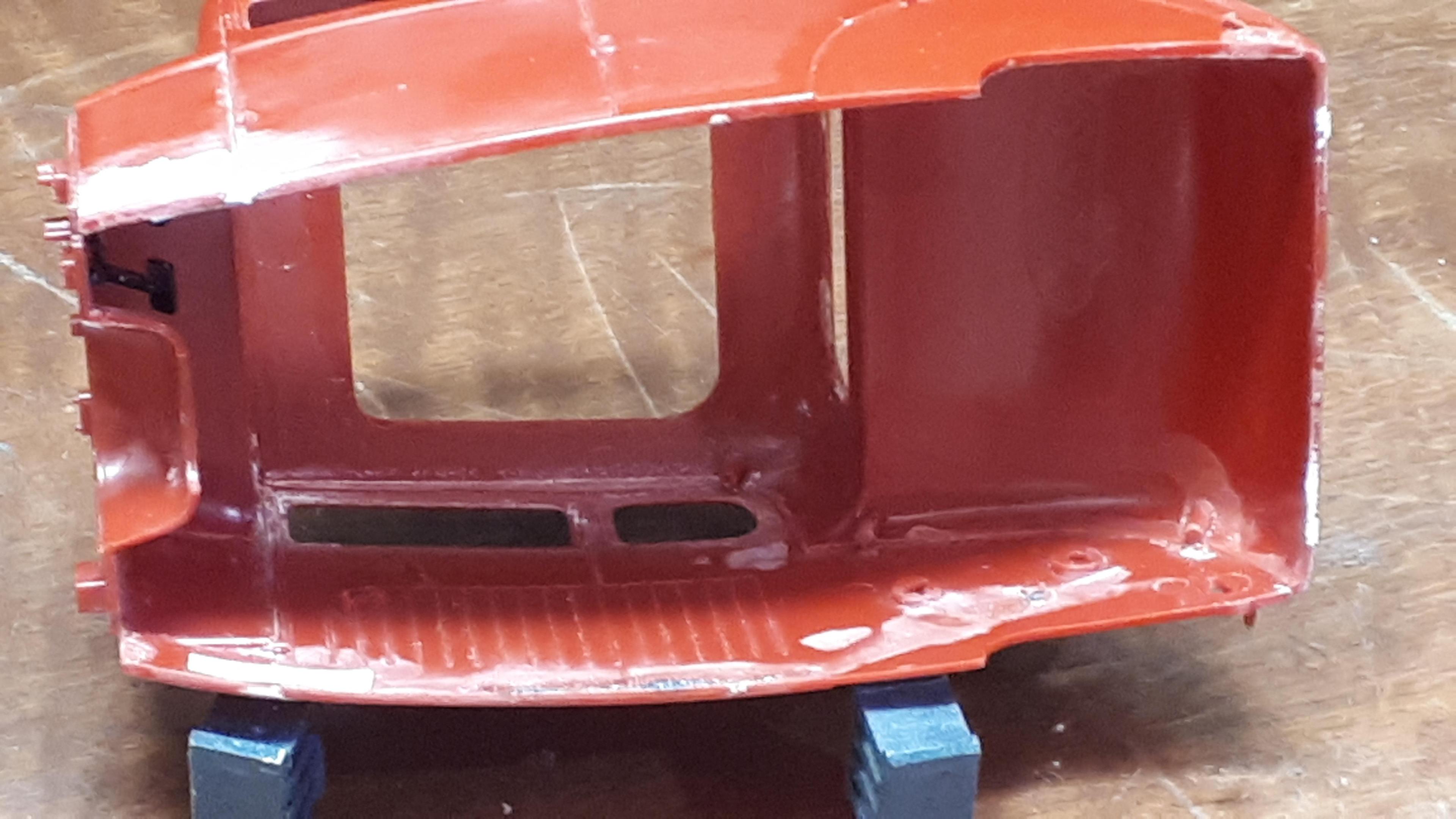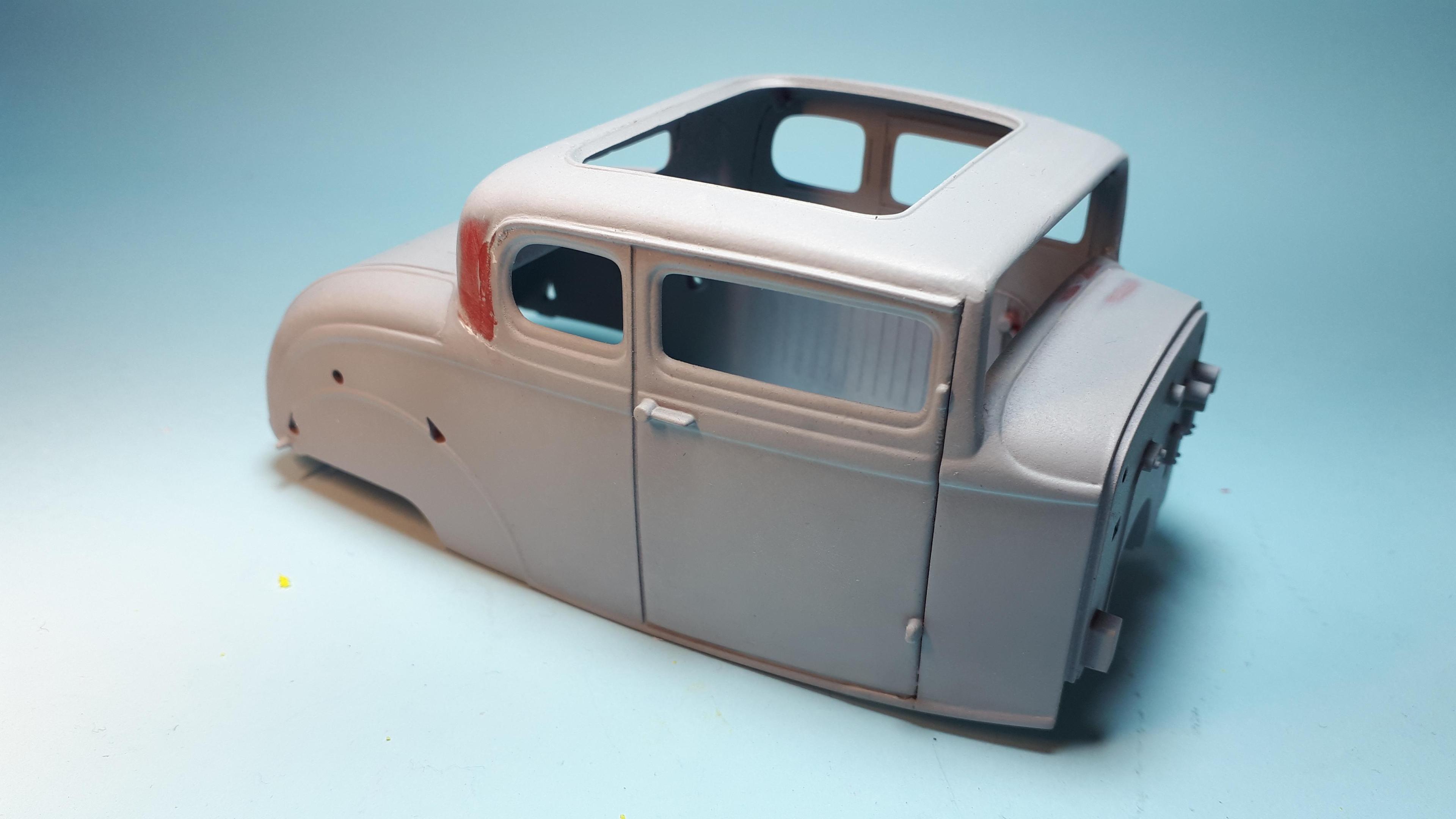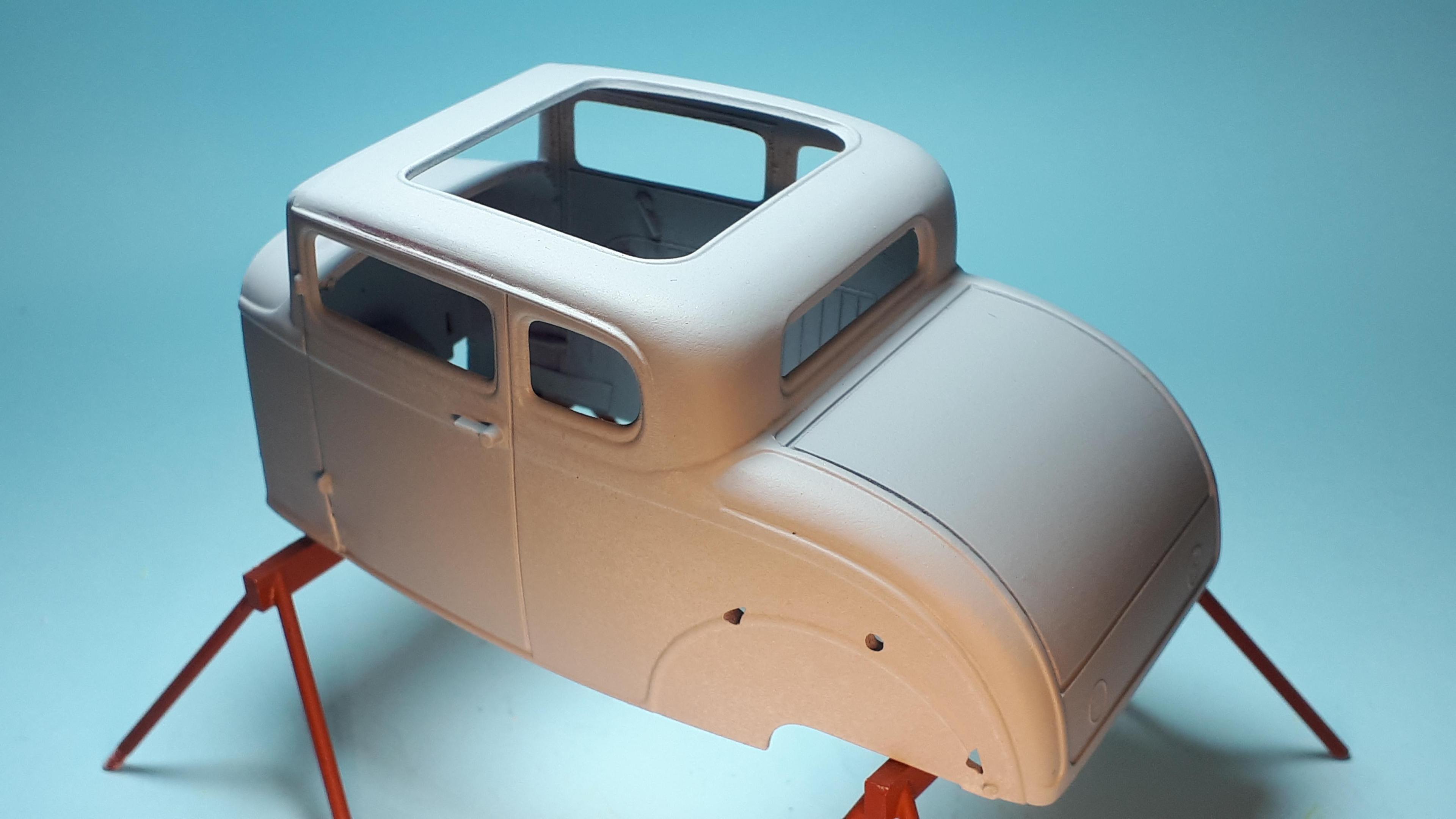 Truth be known I started this project several decades ago, not long after the AMT 34 Tudor came out. At the time I was very unhappy with the progress of my chop so it was put aside. From time to time I reworked it a bit more but it went back in the box each time. Earlier this week I started to look at it again and dug out my original references. Acclaimed Calgary modeller, Vern Sholtz built a replica of this car about thirty years ago but it was sent to a contest and never returned, a great shame considering the calibre of Vern's work. He gave me copies of his reference material and since then I have found two more magazines and a thread on the H.A.M.B. that provide more information. Although this car is very famous it was not around for long so there is not an endless supply of photos of it, especially in colour. My intention is to build it as accurately as possible but make educated guesses on the items that cannot be discerned from available photographs. The first photo is about where I left it a few years ago. Yes, it is a ridiculous chop! That's how it was. I had thought the rear of the driver's compartment was opened through the roof but realised that was incorrect so that has now been corrected. The stock hood sides were removed and replaced with new smooth sides made from flat styrene. The original car had a one piece lift off fibreglass body, the very first one in drag racing and I will be replicating that a feature. The door hinges and the firewall have to be removed as well. One change I would make if I was starting the car today would be to use the fender unit from an AMT 34 5 window coupe. This is because the fenders are closer to the correct stock appearance than the skinny ones in the Tudor kit but I'm not going back now! Cheers Alan