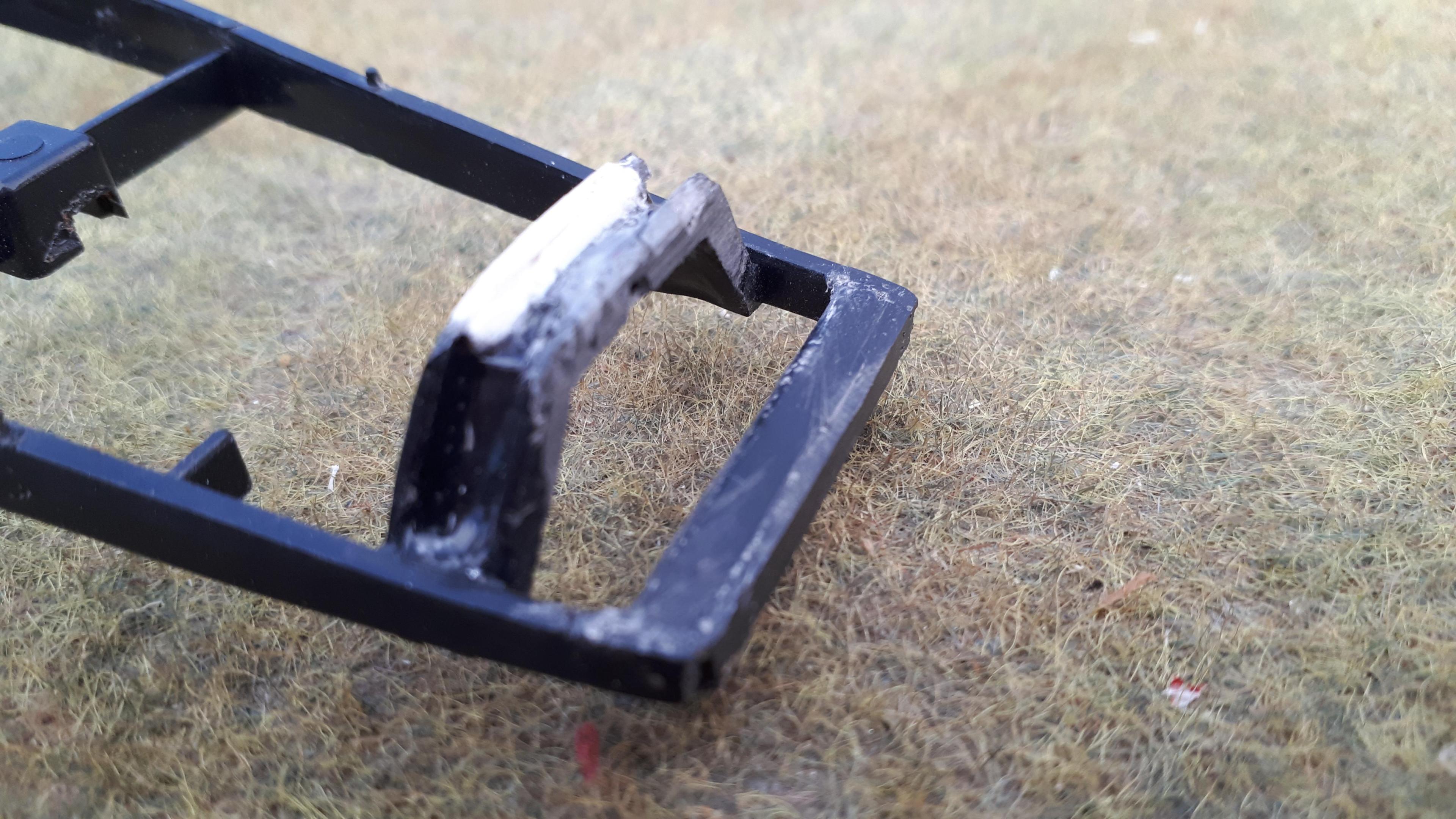 In between lots of puttying, sanding and priming I have been working on the frame. The AMT Parts Pack Allison will obviously become the powerplant. Thanks to Ace Garage Guy's comments I have removed the reduction box from the rear of the engine. I have also removed the frame horns in front of the crossmember and added small triangular shaped pieces of styrene to form up engine mounts for the Allison. The original car employed a humongous 14inch diameter by 17 inch klong torque tube to try and control the torque steer of this monster. After hinting in vain through my scraps box, my wife unearthed a Guterman's plastic thread spool that scaled out perfectly, right down to having a flange on one end! This was cut to size and fitted to the rear axle - I later removed it because it will be easier to glue it squarely to the engine if that is done first. I have also started to construct the very crude roll cage that Jim used to protect himself. As best I can tell from photos the front legs were joined to some sort of strong firewall rather than directly to the frame as you would expect - that will be tonight's job! Cheers Alan -