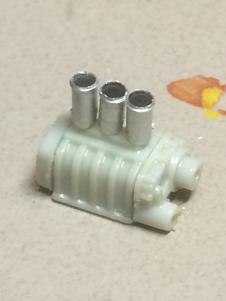 ...and with the injector base I built. It's a piece of sheet styrene cut to size with three pieces of styrene tube cemented to it and again the rectangle filled so it looked right. I had some small 'seed beads' that I'm using for the banjo bolts on the side. The fuel lines will be glued to butt up against these. Then, the front fuel manifold block was made from another very teensy piece of styrene with three pieces of small brass tubing cemented to it. There will be another seed bead cemented to this block for the inlet, and an arm made to connect to the pivot rod that goes thru the ram tubes. You can see the hole in the one that's on there for mock up purposes. The manifold is done in primer grey, the blower in a light flat grey, manifold block in flat black and the fuel delivery block with a Sharpie. As always, comments and observations welcome