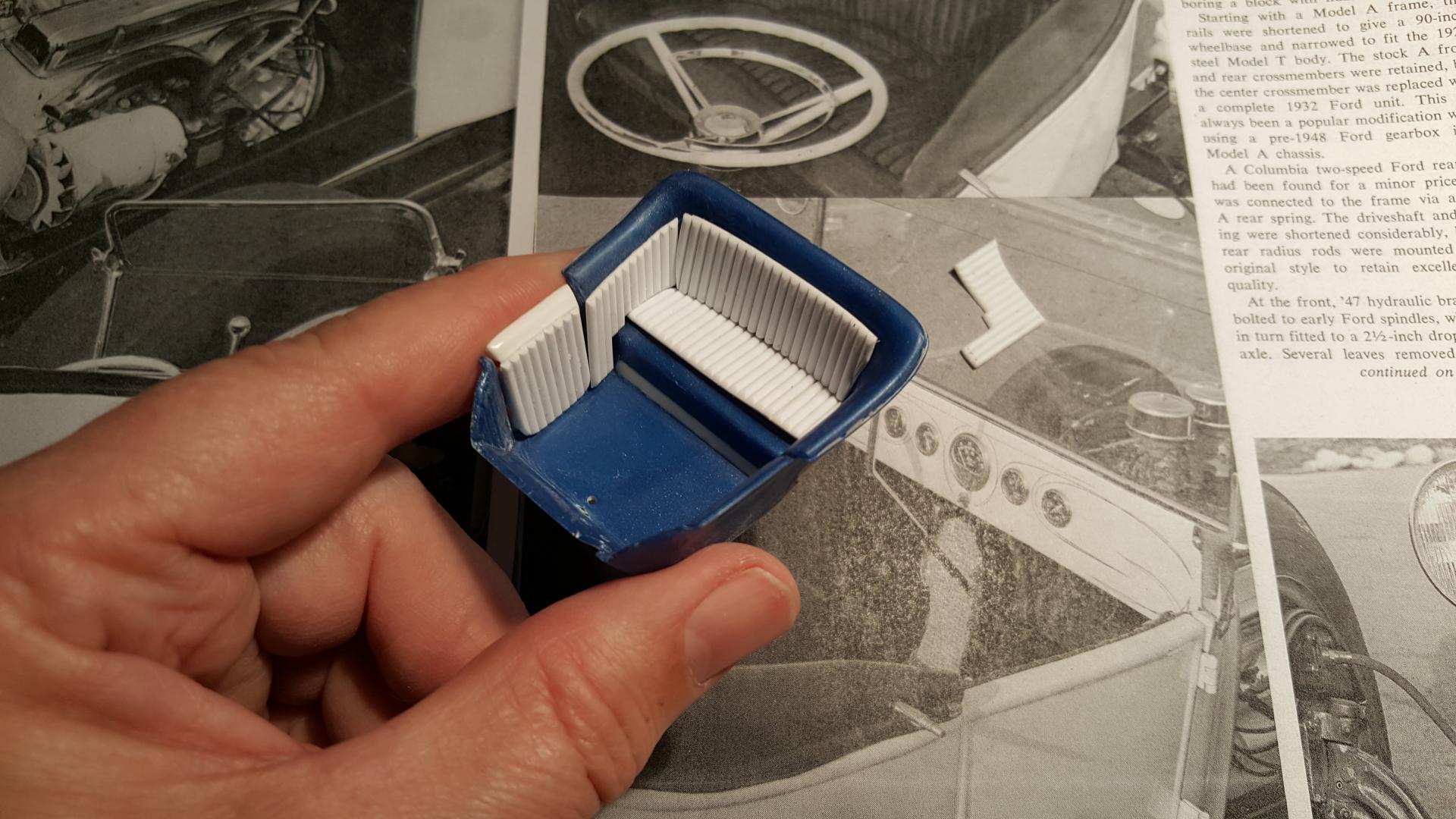 The Columbia Two speed rear comes from the Revell 40 Ford kit...or was it AMT ? Either would suffice. ( I checked my build notes...it came from AMTs '41 stock Woody kit ) The T Bucket body is from the old AMT '25 T re-release kit ( not the Revell Custom Car Parts 23 T Bucket as I previously wrote ) Body required some minor modifications. An ancient re release of the Revell "Tweedy Pie" in "Rodfather" form furnished an interior, the seat will be re upholstered in tuck and roll format with half round Plastruct strips.