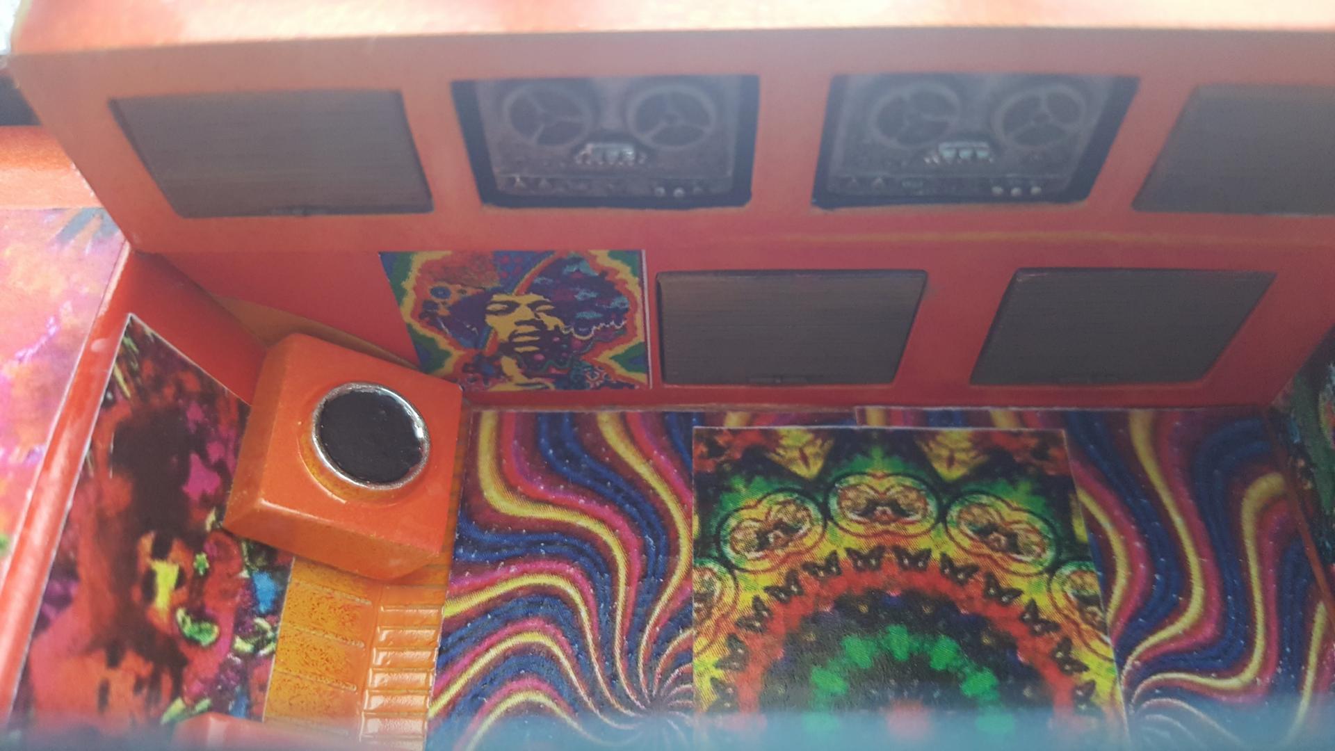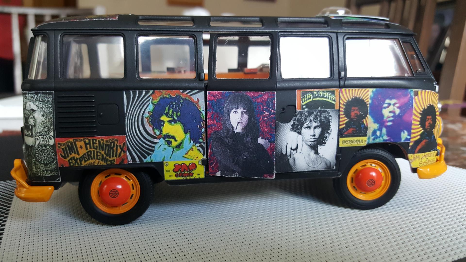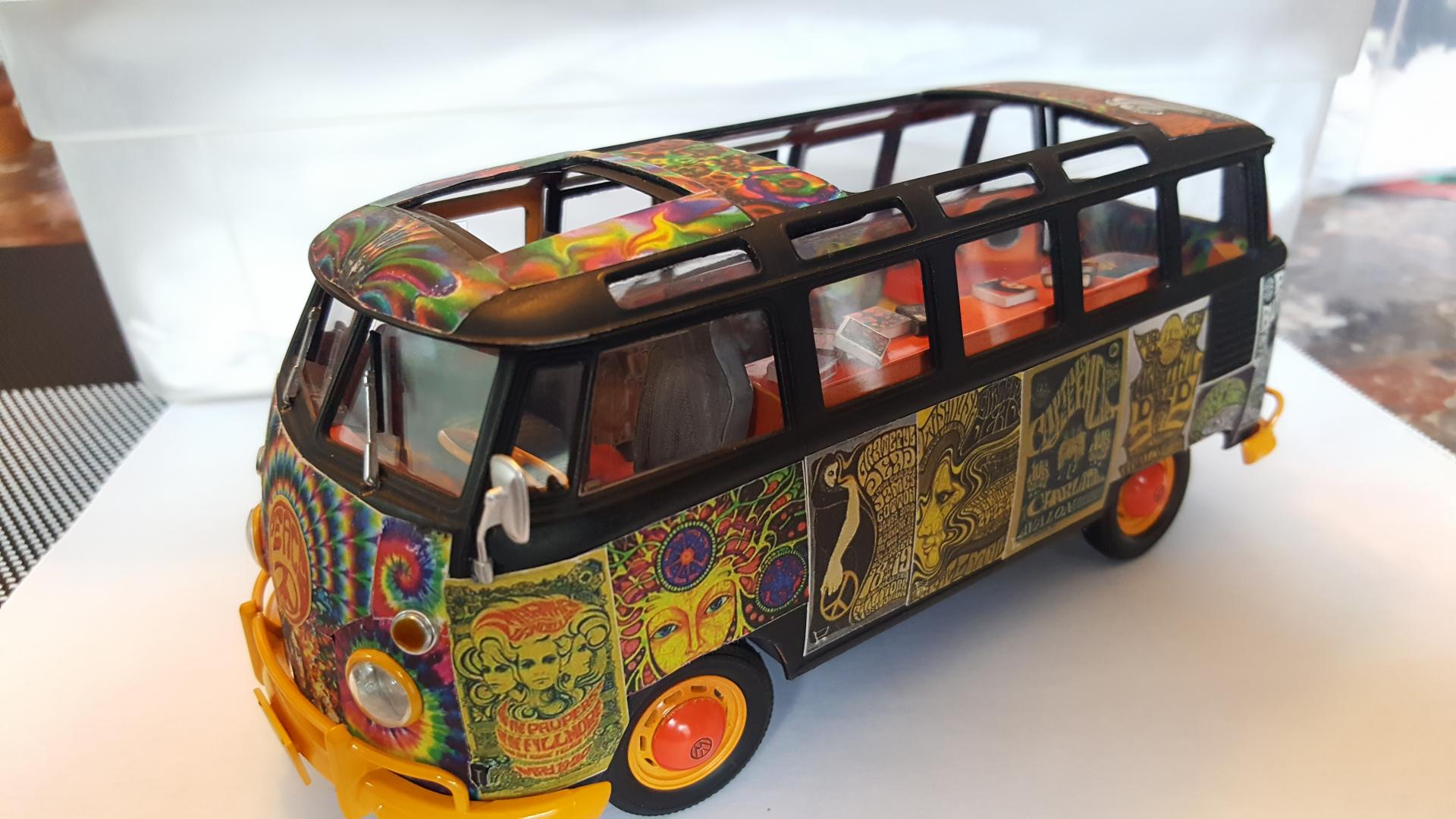 This past winter I realized that Woodstock was 50 years ago this summer, so I dragged out a project that I had started years ago ...the Revell release of the curbside Hasegawa (one piece body) 23- window VW van kit. I opened the trunk lids and side doors, primed the body with Krylon Black Chalkboard paint, and proceeded to wallpaper the heck out of it with rock concert posters and hippie art work...accessed from the internet and printed out on a quality photocopier then wallpapered with diluted Elmers glue. I installed the engine and bucket seats from a Revell VW bug, scratchbuilt a reel to reel tape deck wall unit from Evergreen sheet, and included little scale tape reel boxes. While a little over the top and not exactly a scale rendition of what you might've seen heading for Hippie land back in the day...it was fun.