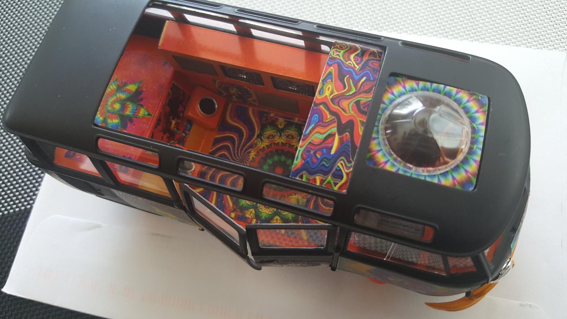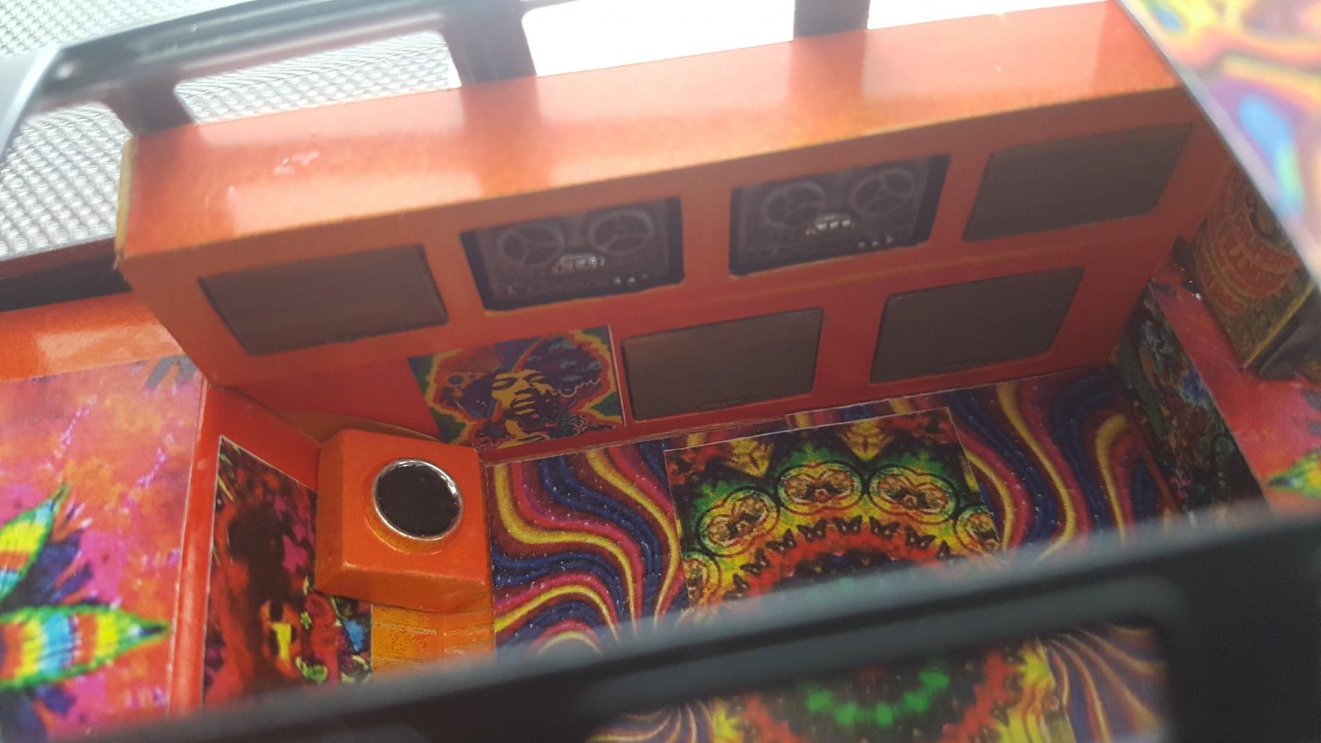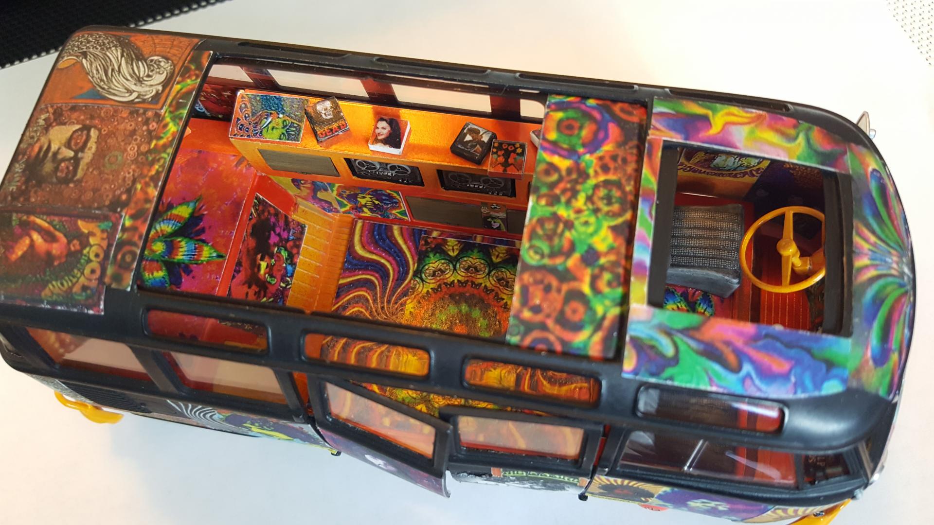 This past winter I realized that Woodstock was 50 years ago this summer, so I dragged out a project that I had started years ago ...the Revell release of the curbside Hasegawa (one piece body) 23- window VW van kit. I opened the trunk lids and side doors, primed the body with Krylon Black Chalkboard paint, and proceeded to wallpaper the heck out of it with rock concert posters and hippie art work...accessed from the internet and printed out on a quality photocopier then wallpapered with diluted Elmers glue. I installed the engine and bucket seats from a Revell VW bug, scratchbuilt a reel to reel tape deck wall unit from Evergreen sheet, and included little scale tape reel boxes. While a little over the top and not exactly a scale rendition of what you might've seen heading for Hippie land back in the day...it was fun.
