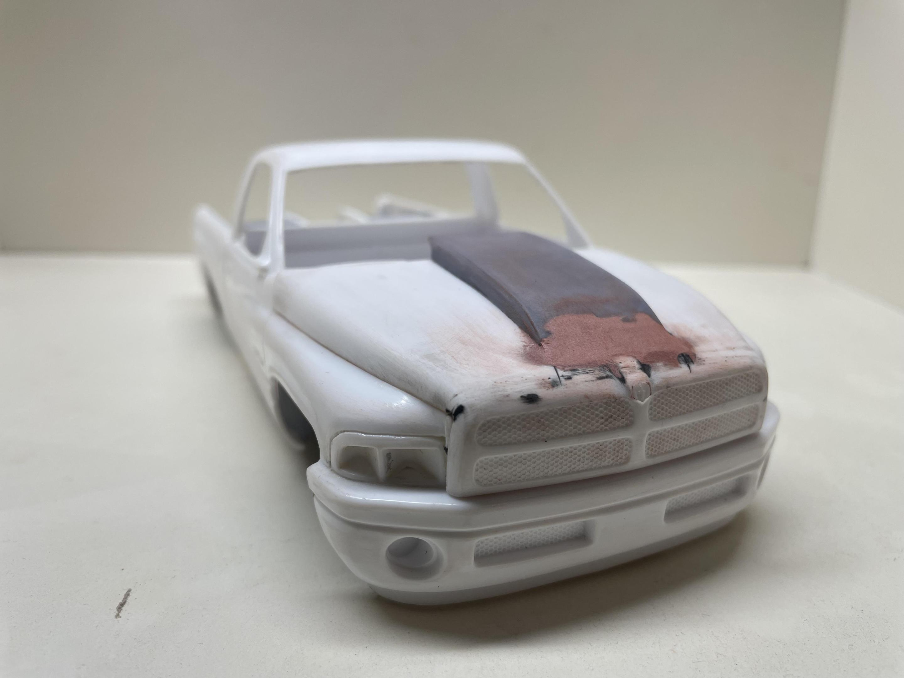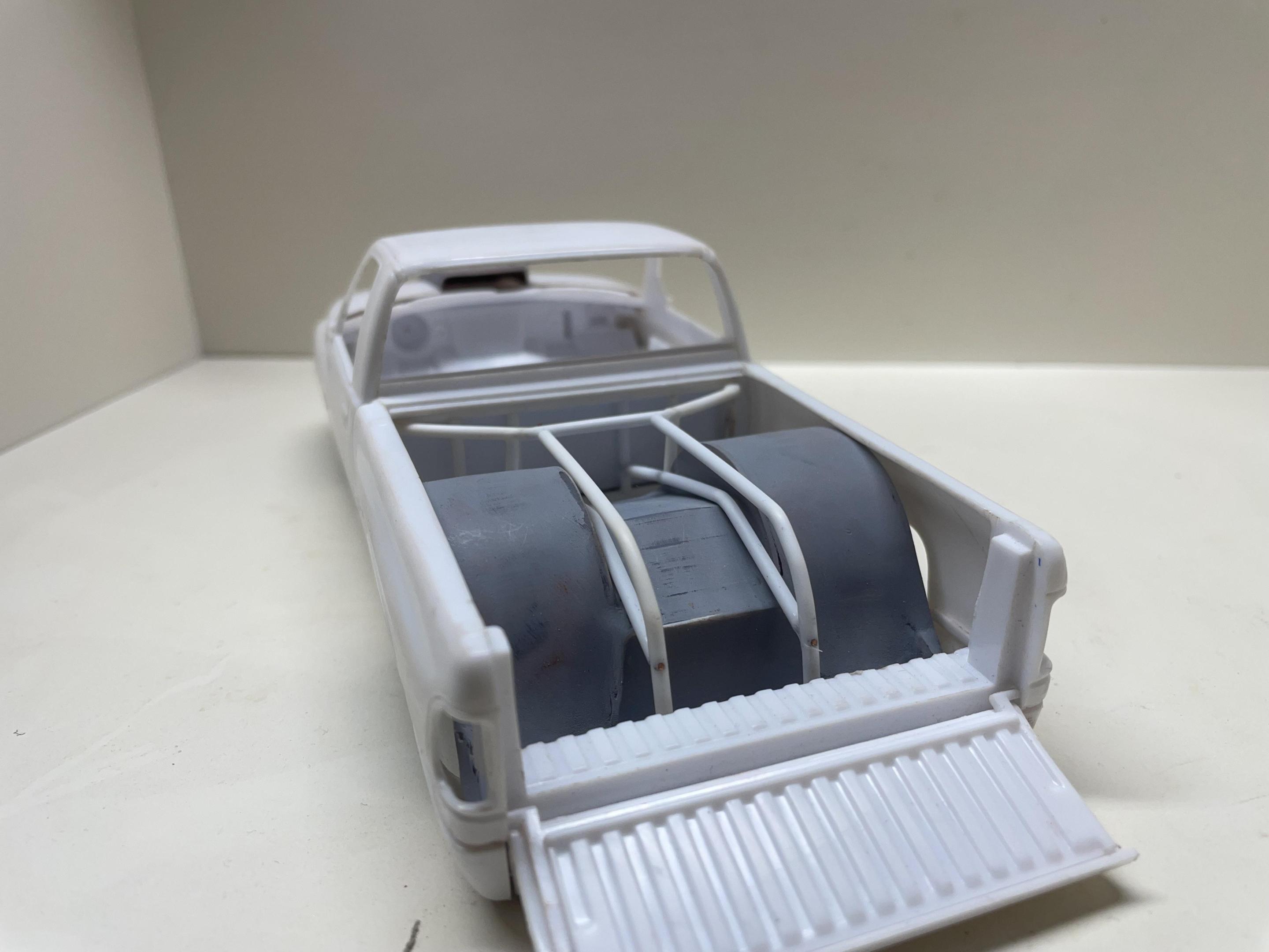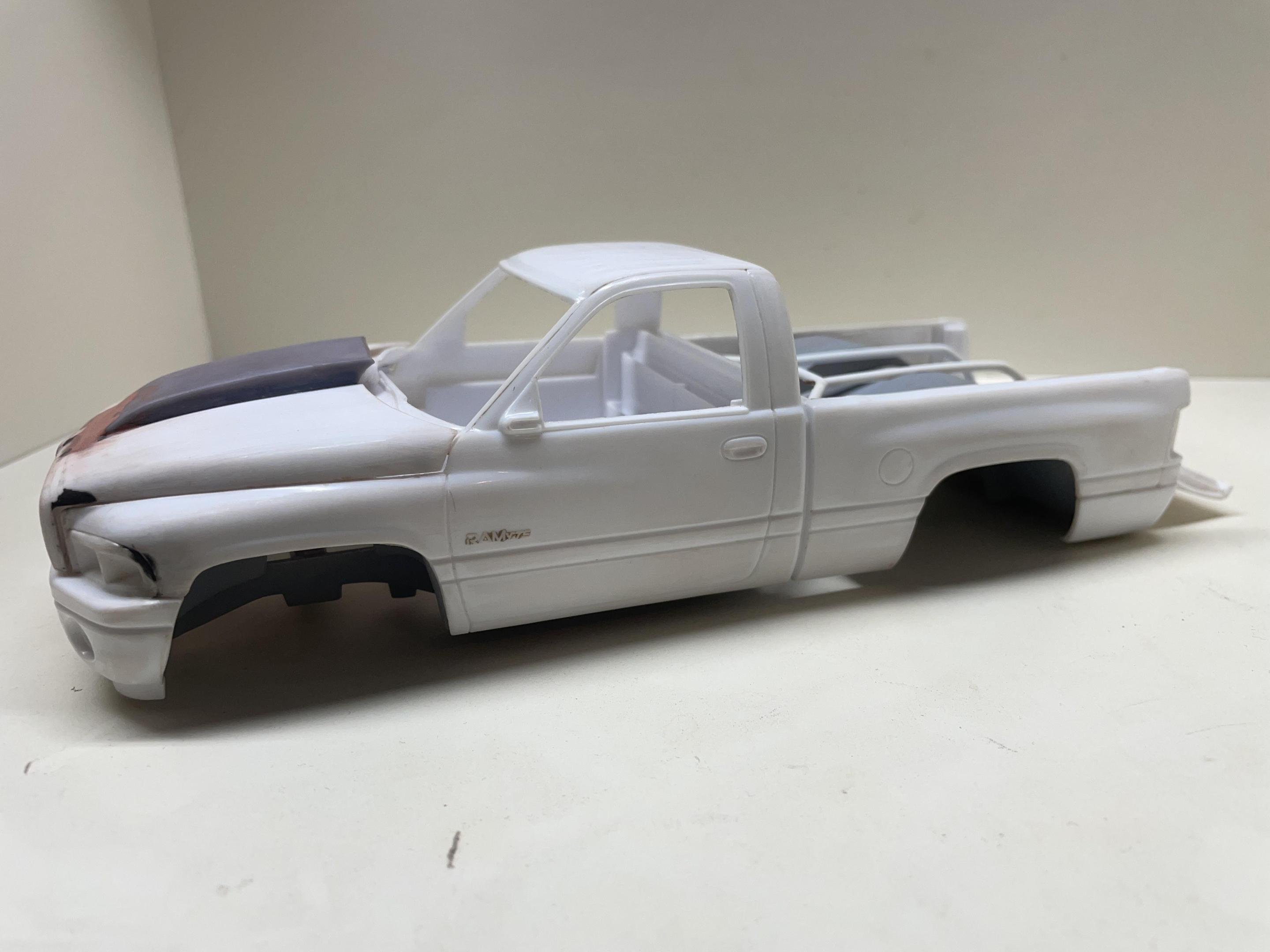 Hey builders, just a couple of photos on my build. First time trying a project build like this and even if its not being built right i'm having a good time with it. So we started this kit with pro street in mind but started hacking away at it as if i was building a promod with no idea which is which, i cut out the rear box out and cut out the back of the cab thinking i was going to build a tube chassis but still no clue where to start. This sat on the bench for a while and at the same time was learning 3d printing, so i 3d printed a back half of my own design to learn as i go, it came out alright but was very rudimentary to say the least, it was brittle, lacked detail and sat on my bench for a while to, finally said i'm going to use it, cut the frame and attached it, i made it work and i cleaned it up best as i can and learned from it. So i made some more parts and test fitted and am still moving forward. Made a 4in cowl hood and cleaned up the kit hood also. This hood fit the kit like BLAH_BLAH_BLAH_BLAH, had to be cut up and moved forward a blittle bit and dropped down at the same time to close the huge gap between bottom edge of hood and top of bumper and this is where we are at right now More to come as i progress, have a good one builders.