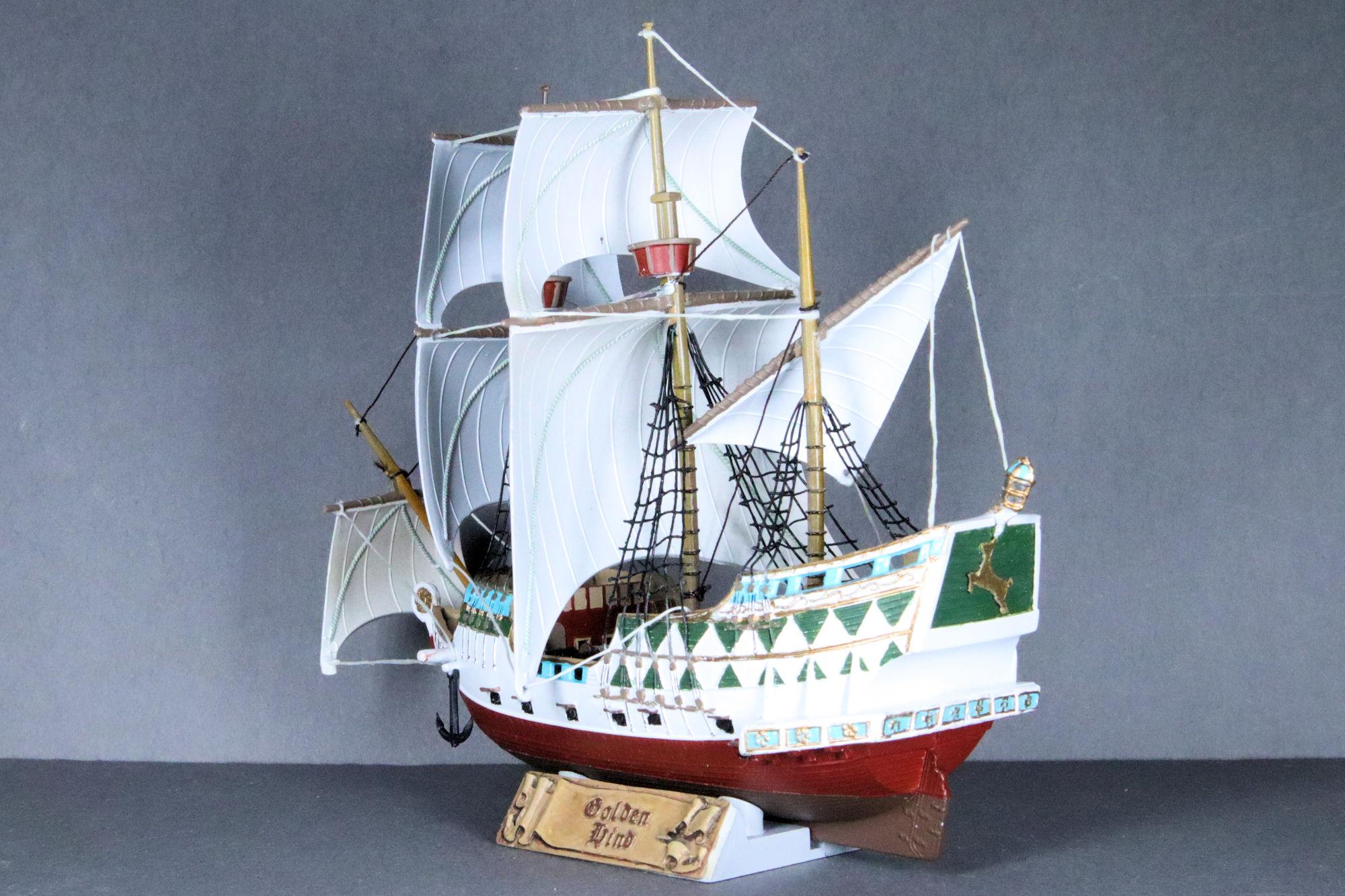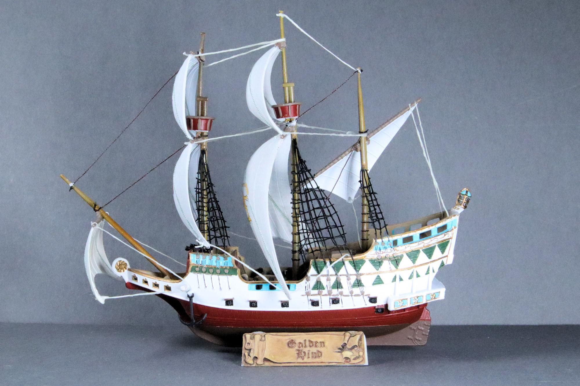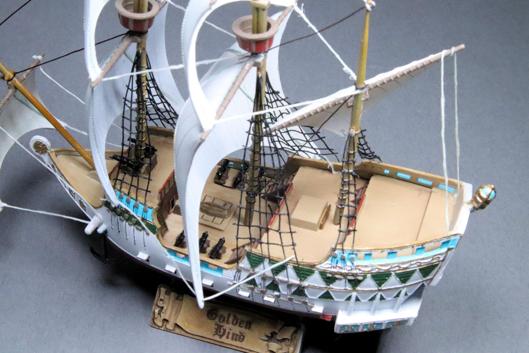 Hello Everybody! This kit is supposed to be a rendition of the Golden Hind captained by Sir Francis Drake in the 1570s. The actual ship which inspired this kit no longer exists but a few replicas have been built and this kit holds little resemblance to any of them. The kit seems to be based on an entirely different style of ship. It's probably the standard base master from which all the other ships in Lindberg's series were derived. Needless to say, I'm not particularly concerned about the historical accuracy of this build. For those who may be interested I have a complete WIP thread that details the whole build process. That being said, on with the show. This kit was more of a challenge than it had a right to be. Using wire and string, I fabricated the ratlines to replace the clunky plastic ones that were missing from the kit. The deer silhouette on the stern is cut from photo paper and painted gold. There are a few other photos I want to post and I still have to get my traditional Display Case shot. So until then, thanks for taking the time to look and please feel free to post any comments you may wish to share. David G.