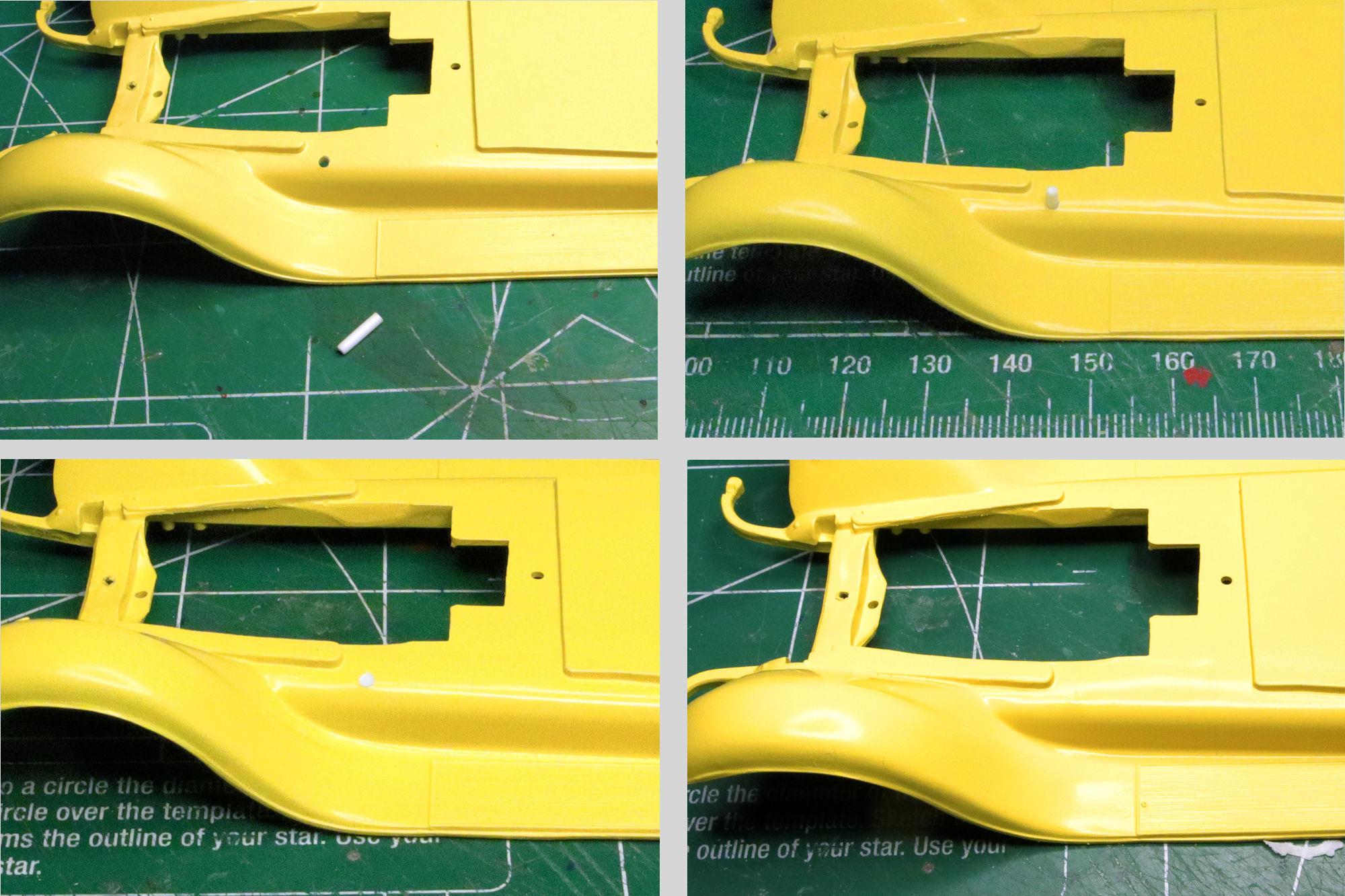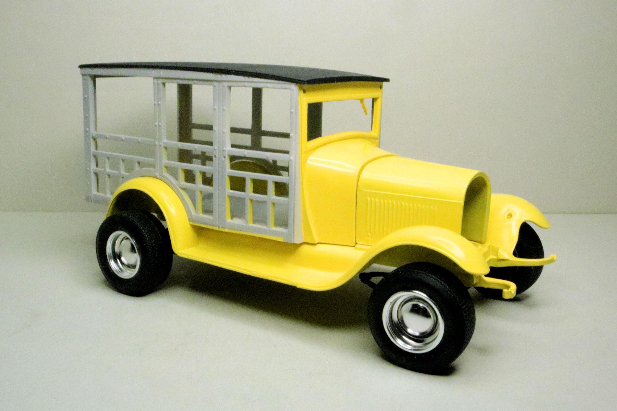 Hello Everybody! I know it's been a little while since I last posted anything to this build thread but I have been working on it. After the first coat of yellow I realized that there was a hole in the running board apron that is meant for the stock spare wheel mount. I'm not building stock so it must be filled in. After spraying some yellow on the body, it's time for another test fit mockup. I really want to display this one with the hood off showing a nice beefy classic hot rod motor. I found one that I think may suit the need. It's the unused optional Dodge Red Ram engine from AMT's 1929 Ford Model A Roadster. I built that kit a few years ago and went with the stock version which left the optional engine available. Unfortunately it's a little lacking on detail and this half-assed starter really needs to go. One of the reasons I chose the Dodge engine is because it was about the only parts box motor I had with a manual transmission... that and the blower. The transmission on the Dodge engine turned out to be too short to allow the engine to fit properly to the Woody chassis so I'll be doing what I was hoping to avoid by selecting this engine, swapping the transmission. After doing a little prep work to get the new engine ready, I decided a test fit was in order. It looks like we have a problem. The starter bump on the transmission bell housing doesn't line up to the mounting location on the engine block! I suppose I could ignore it but I don't think I will. It's time to look for another engine. It's kind of a shame that I won't be using this engine. Prep work aside, I was really looking forward to using this one. In spite of its shortcomings I think it could have made a good looking engine. Oh well. As they say, back to the drawing board. As always, thanks for taking the time to look and please feel free to post any comments or questions you may have. David G.