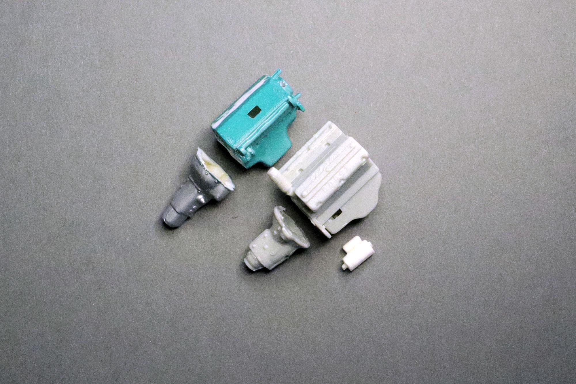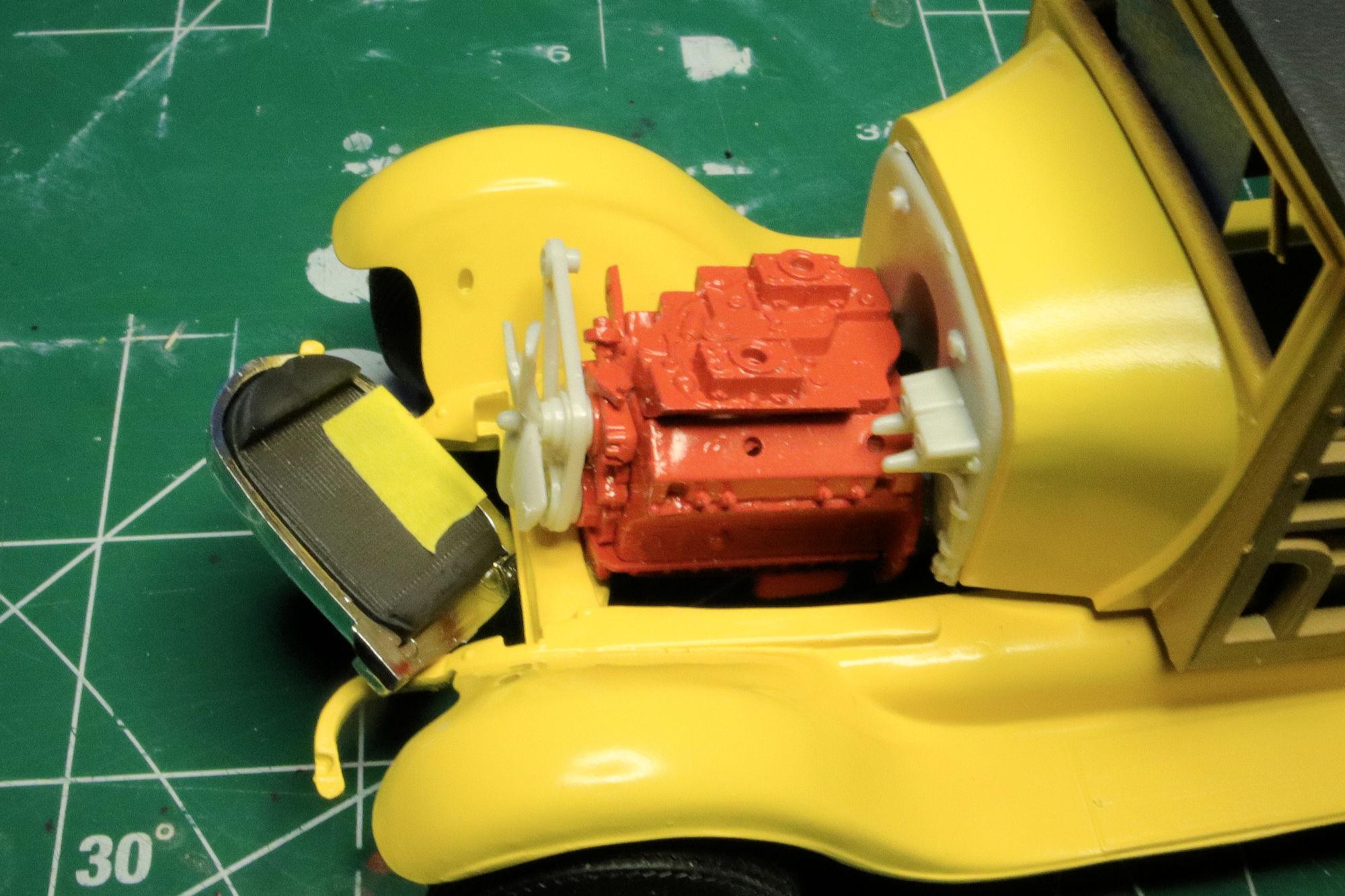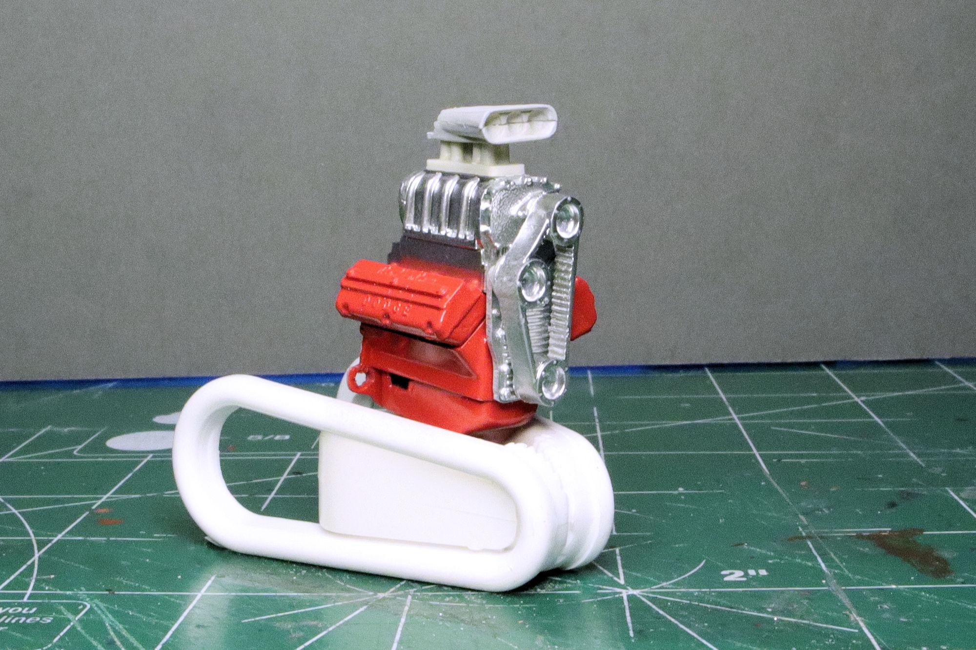Thank you Greg. No, where the starter bump is on transmission is too high in relation to the engine block. It would place about 1/4 of the starter inside the cylinder bank. Thank you much Alan, that yellow certainly does seem like a good color for a hot rod. I really do like the Red Ram but I've moved on from that one. The one I found to use in place of it is the dual carb Max Wedge from AMT's '49 Merc. It has much better casting detail and without the blower it should allow me to put the hood on if I choose. And it feels like more of a daily driver engine than the blown Hemi... it's a little more realistic, I think. Thanks, David G.