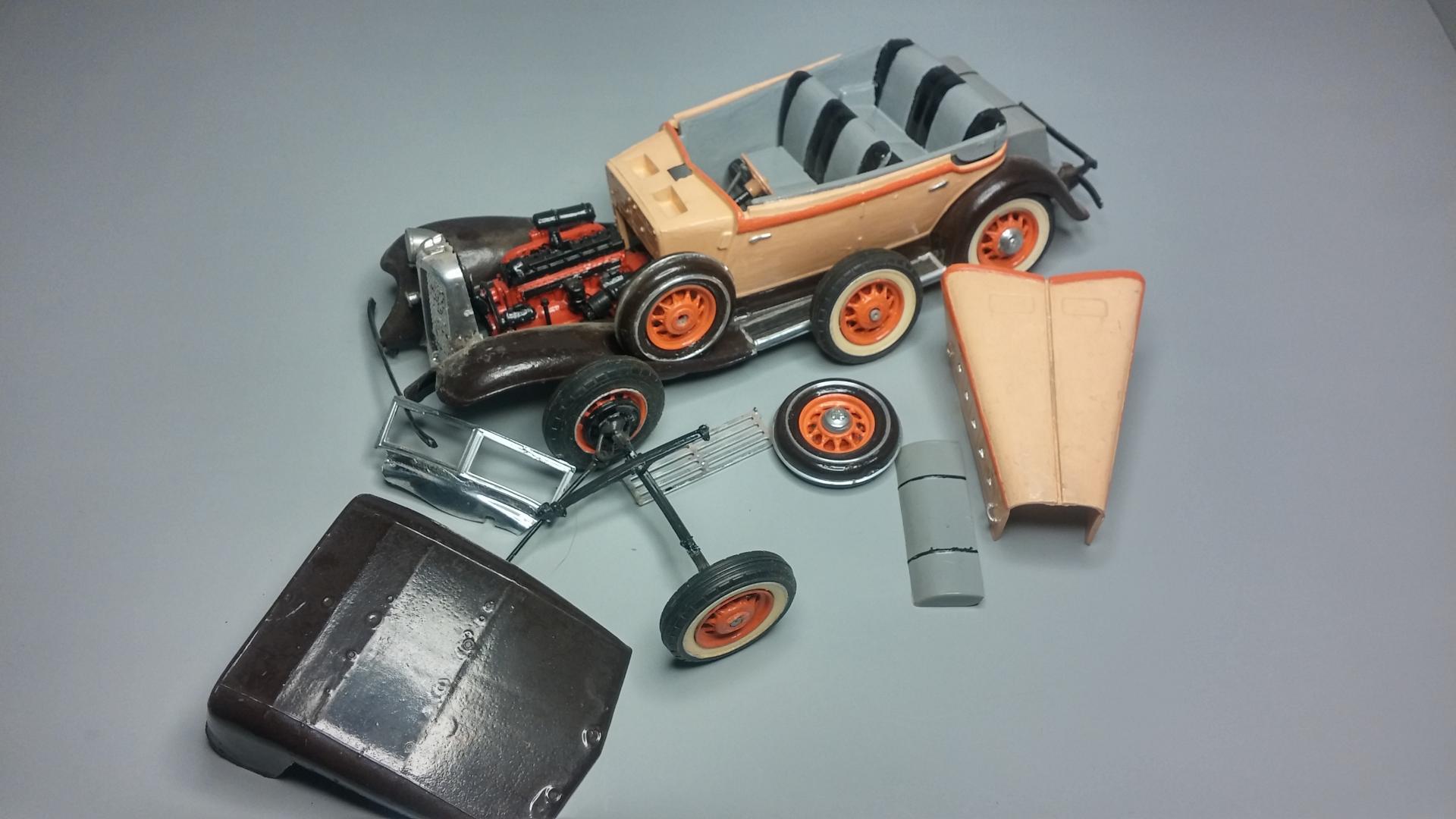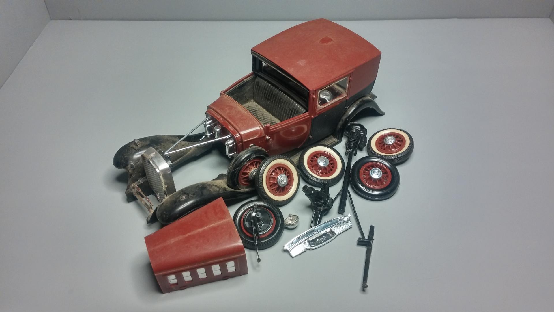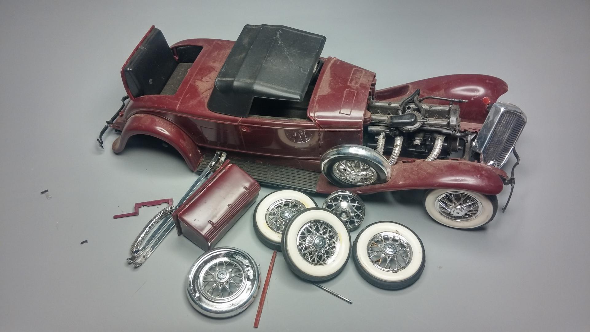 I wanted something to bash on that I didn't have to care too much about how it came out in the end, so I grabbed a Duesenberg SJ Roadster from my junk yard and tore into it. I have no idea where I'm going to go with this. My only plan is to bring it back from the dead, hence, the "Zombie Roadster". I don't know if I'm going the direction of a barn-find survivor or an actual Undead Duesy. Of course, I'm open to suggestions. Here's where I start. Some disassembly required. Using wire pins in an attempt to straighten and reassemble the frame. The frame has a bit of a bow to it. I'm not sure if I'm going to mess with that. That's all for now. Thanks for taking the time to look and as always, please feel free to offer suggestions and comments. David G.