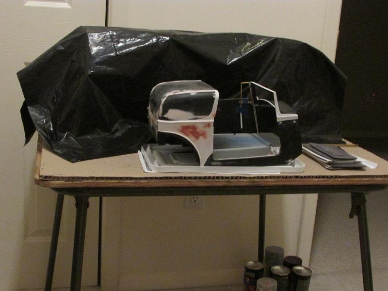 12. A little rehab... Slowly over the last couple of days I got back to doing small things. Boy it feels great when working but I pay a price after... I started slowly with a masking project on the rear body work. No rush, so I took a day for that. As the temps warmed to the 50F, I shot two build primer coats and one mist guide coat in black then an overnight dry. This in an effort to perfect the sweep panels and get them flat. The roof will remain masked so that the fabric covering bonds to raw plastic and not paint. That's quite a way off. Sanding tomorrow to get flat and find any low spots. Getting crazy, I tackled a nit pick job of perfecting the windshield opening to match the brass frame. I cut thin strips of .030, .020 and .005 styrene to build the curvature at the bottom center. A little sanding and back and forth fittings blends them into a gradual curve. The frame is a now a press fit snug but when painted, I will relieve the paint build-up and make it a light press fit. A smear of Bondo may be needed across the front edge - will see when I get some primer on that area. Sure feels good to get back to the bench...