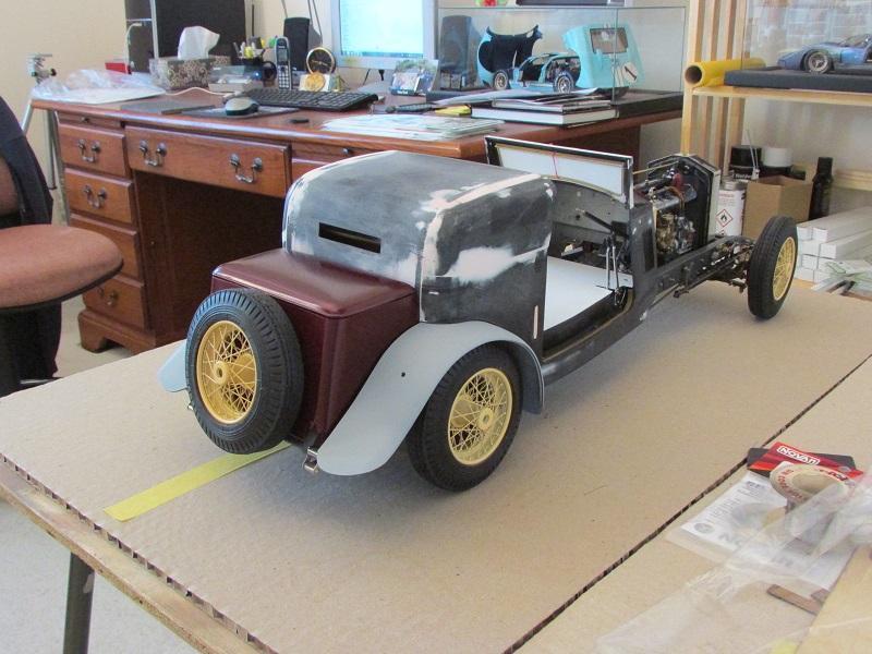 The roof was pie-cut; 13mm at front edge, 4mm at the back. It's all in the thread but probably too hard to dig out. I wanted to kill the 'coal scoop' look from Pocher. The rear glass is untouched, just lower due to the cut. That's why the trunk height was cut about 6mm too. This is much closer to Gurney cars. The back of the rear seat comes up to the bottom of the rear window. I did in fact cut 6mm from the bottom edge of the upholstered seat back after the roof chop. looks all very proportional now. No wearers of period hats will sit there. Only slightly reclined, scantily clad, slinky starlets and '29 flappers. Dude, this is my bucket build so don't harsh my dreams. Yes, the roof will be covered in deep red gabardine with Marvin's beautiful landau irons. First the beltline must be designed to sweep front to rear. The fabric will not have the exaggerated dip ala Pocher but will be lower on the body side because of the chop. In fact the top won't look so radically cut when its bottom edge is defined lower. Spent a lot of time studying this. Style is everything. Loren didn't build his collection around cars he could wear a top hat in. PS - Your eyes are far less out of whack than mine are... Nice thought but I need the length of that board to continue the largely horizontal look of all the lines. Also, it gives me a chance to make chromed brass step strips as further accents.