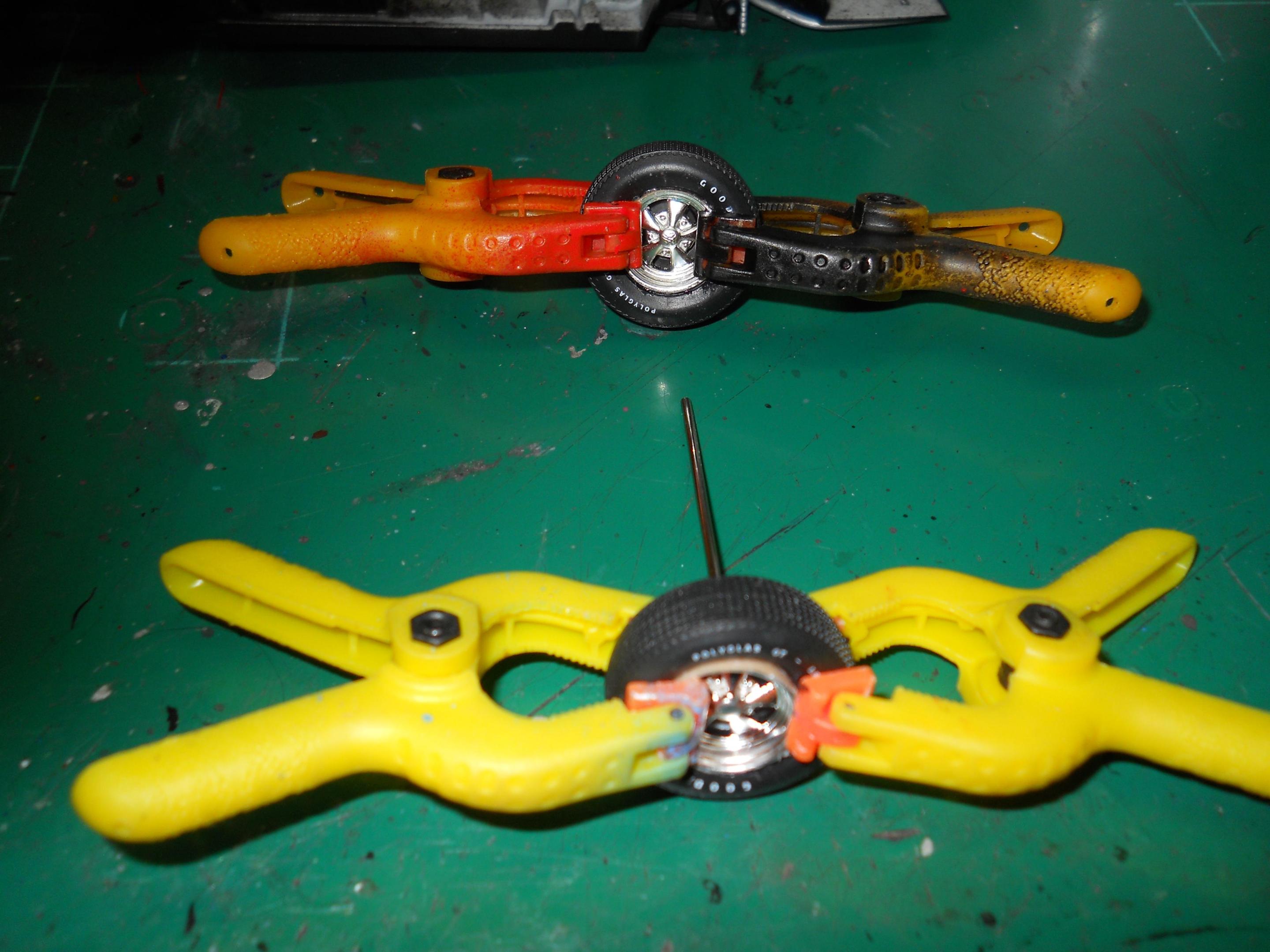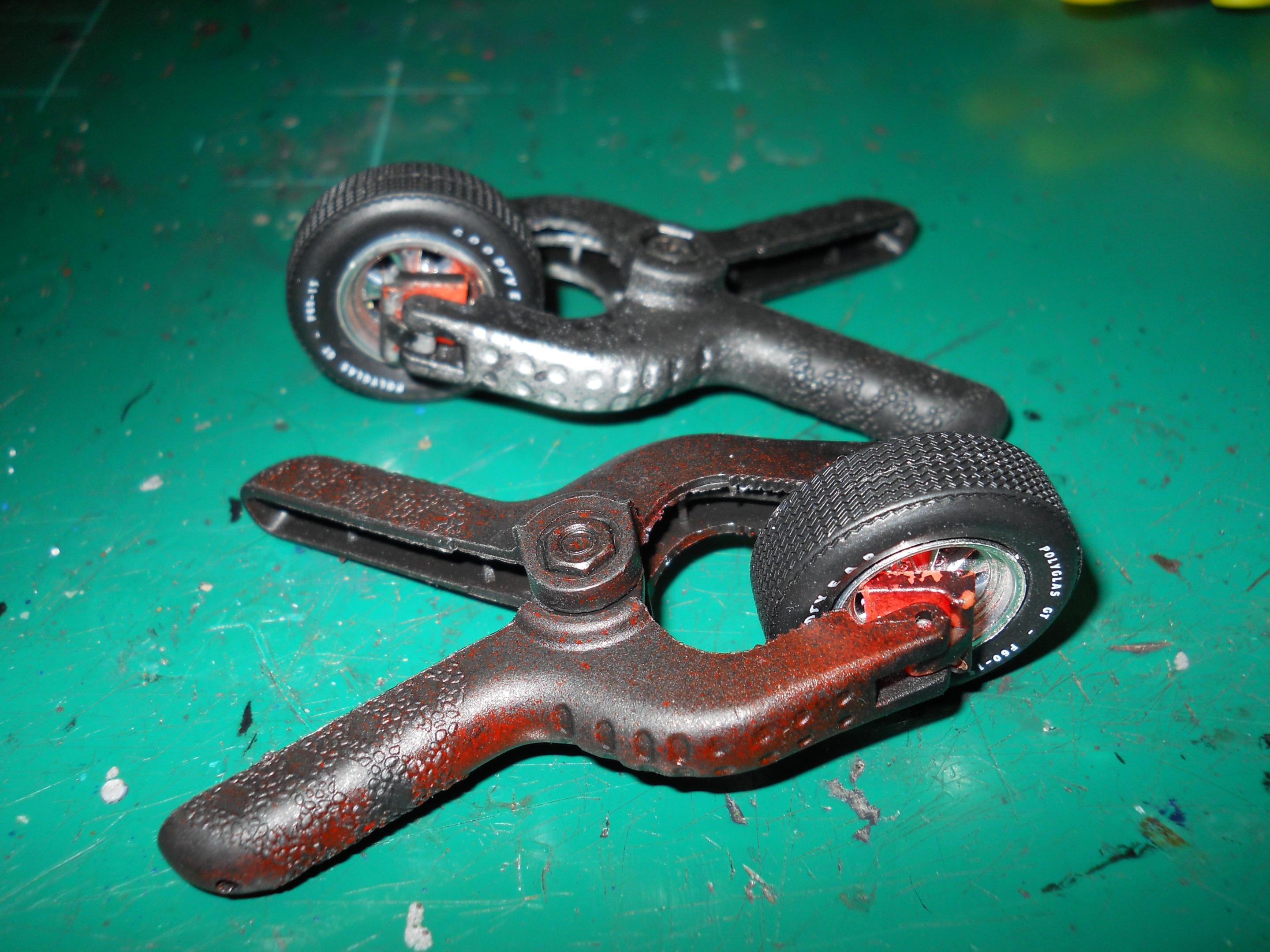 Well, my good camera took a dump and stopped working today. I went and got my wife's camera and she left the batteries in it for over 5 years. I had to clean the contacts very well. The wheels and backing plates are one and I will have to shorten the metal axle for the rear axle housing. There must be a guy in China who pumps out these things all one length as I have to trim them! I went and found my chrome tubing and made some chrome exhaust tips.