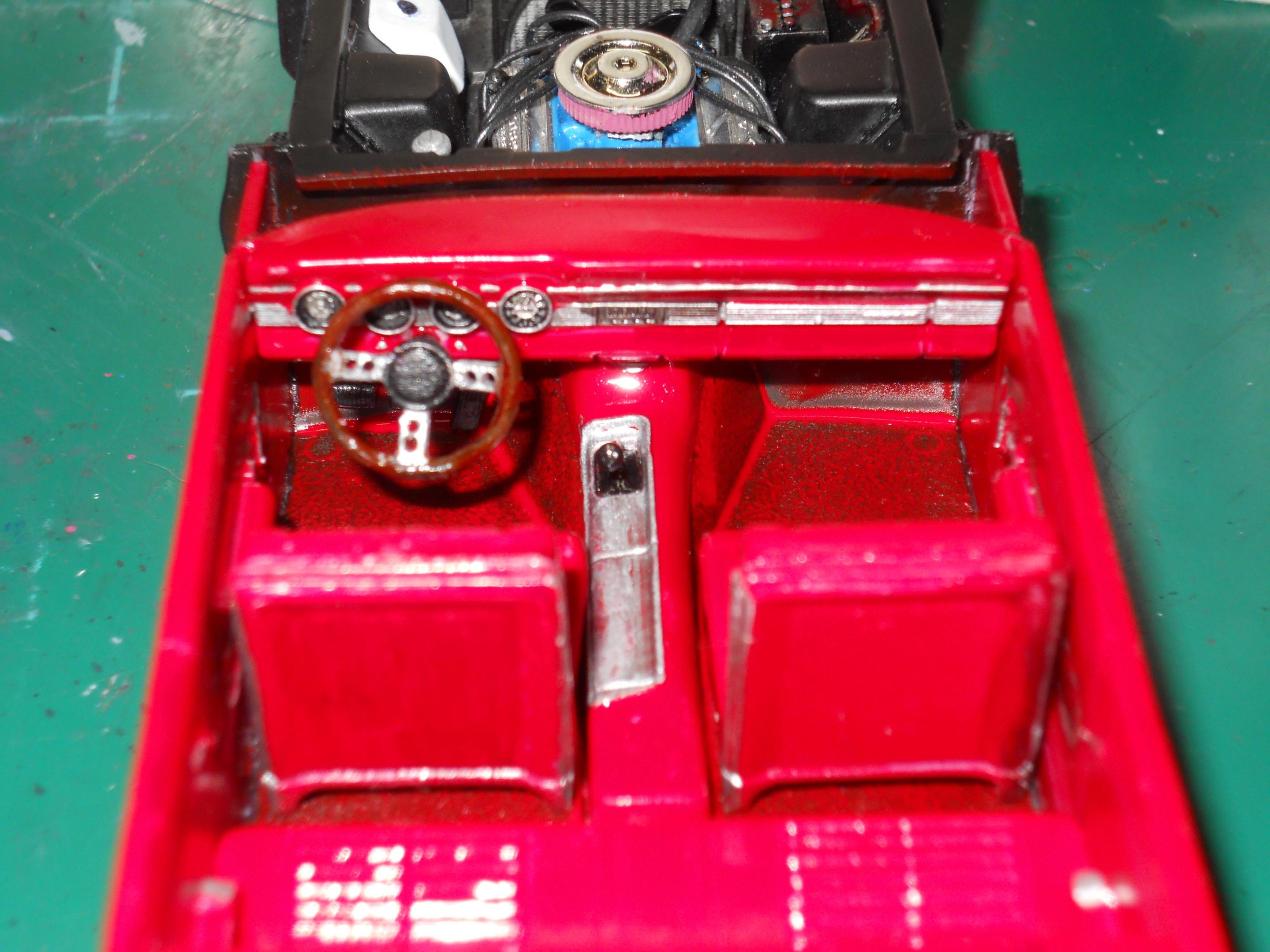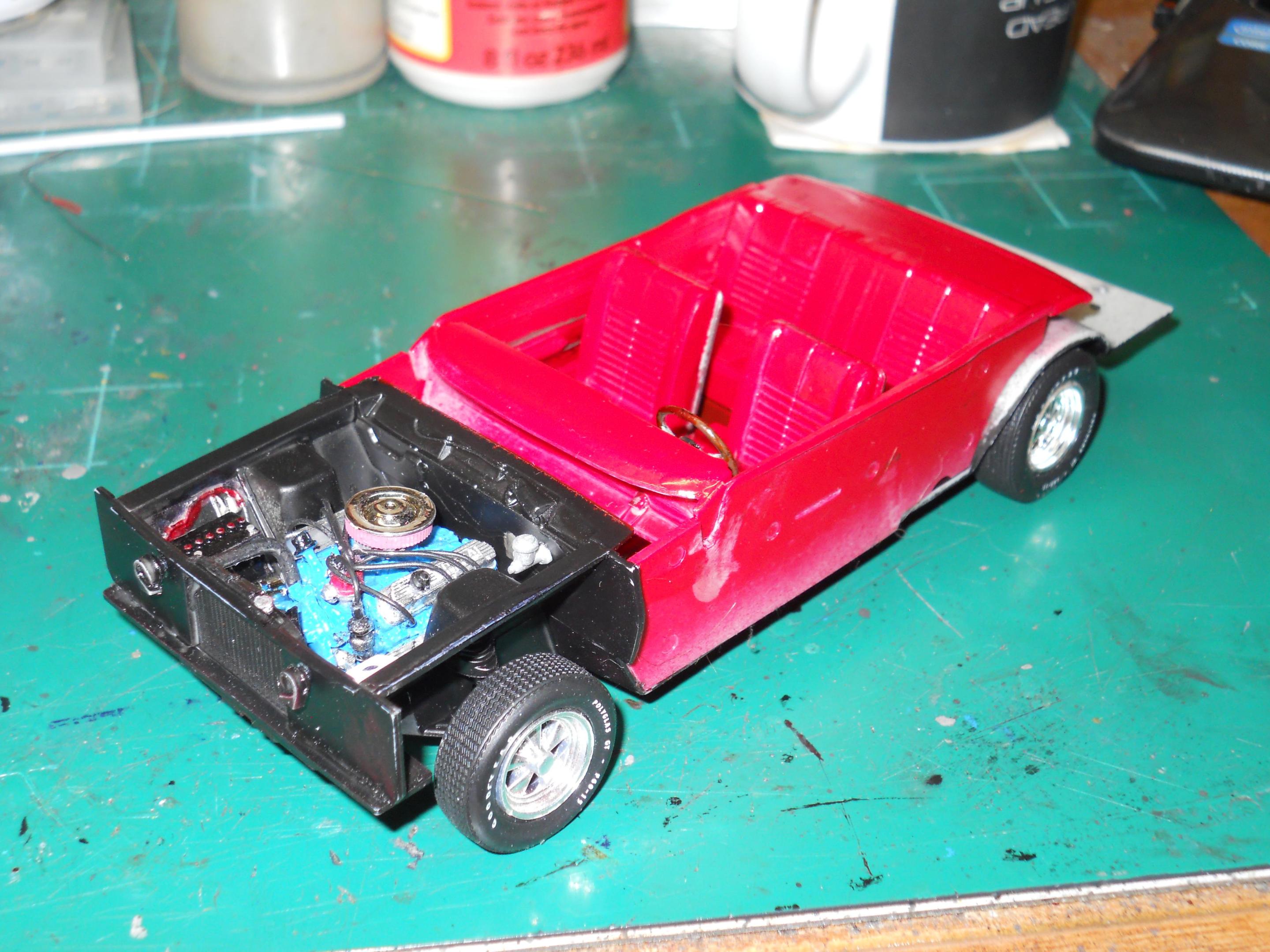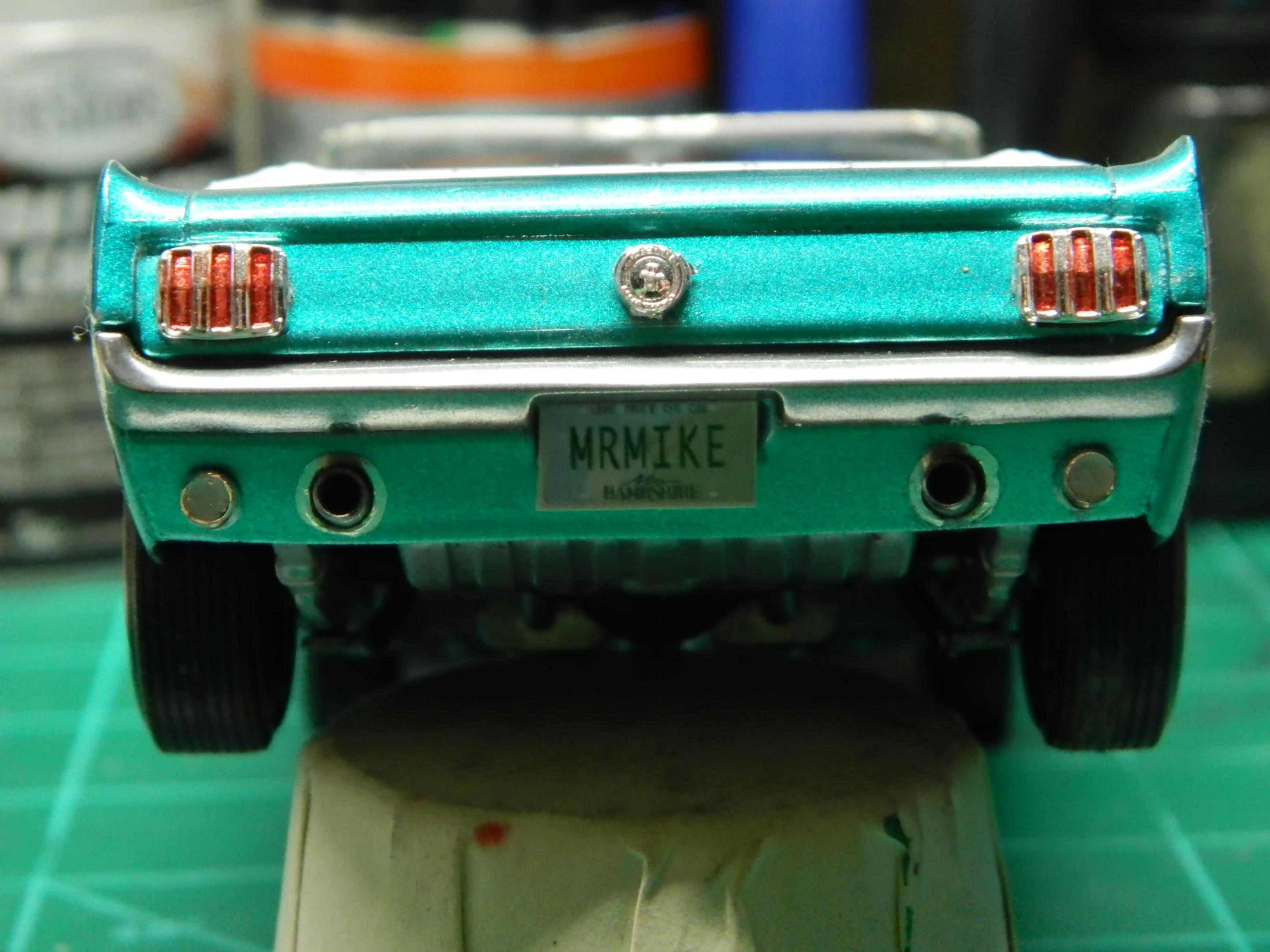 My '65 Mustang Convertible were I tried removing the bumper guards and added the through-the-rear-valance-panel exhaust tips. Painted with Model Master Bright Calypso Metallic with a white interior.