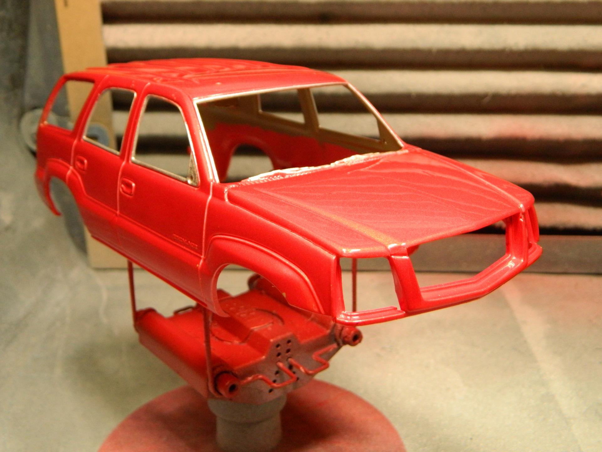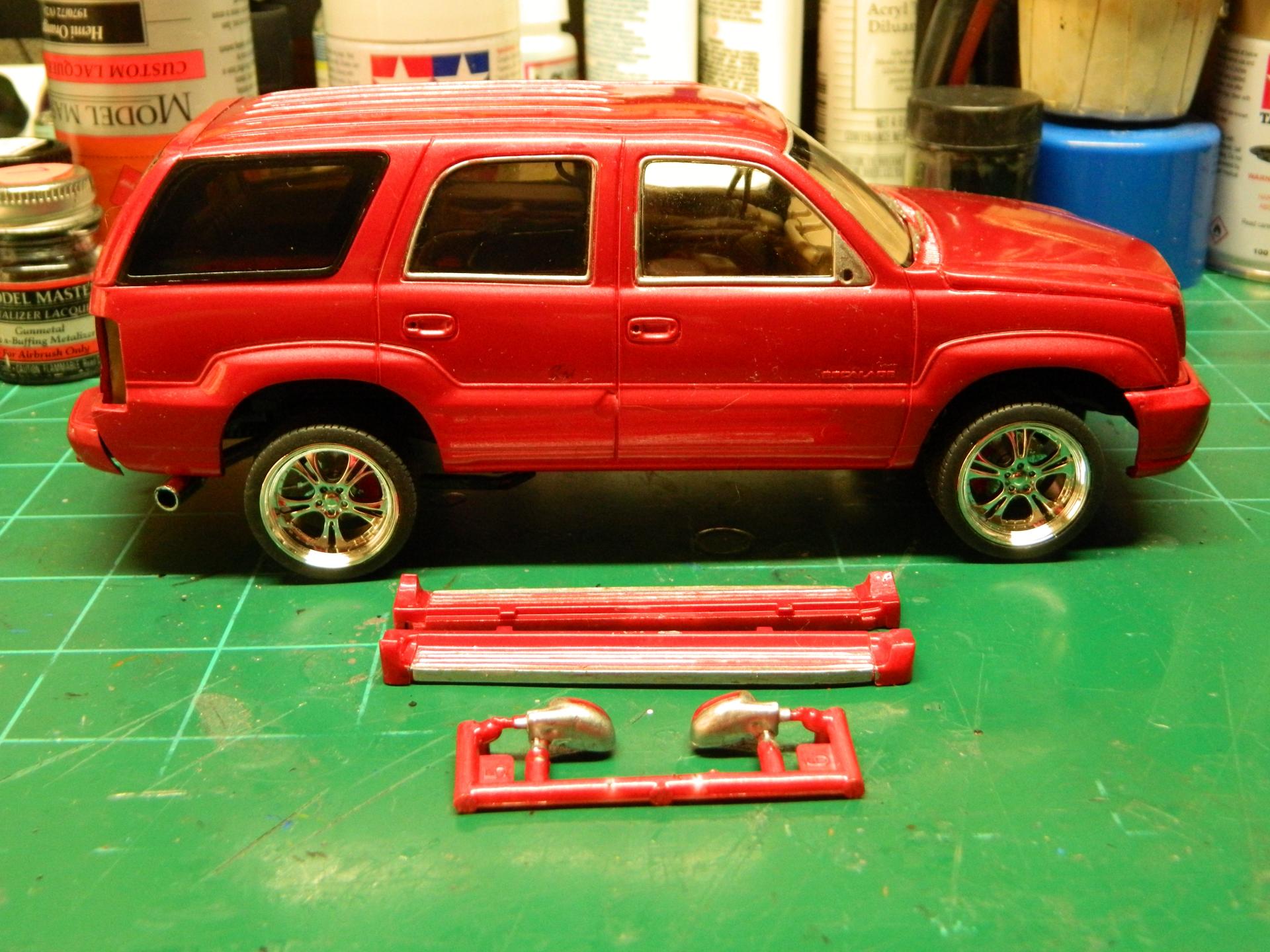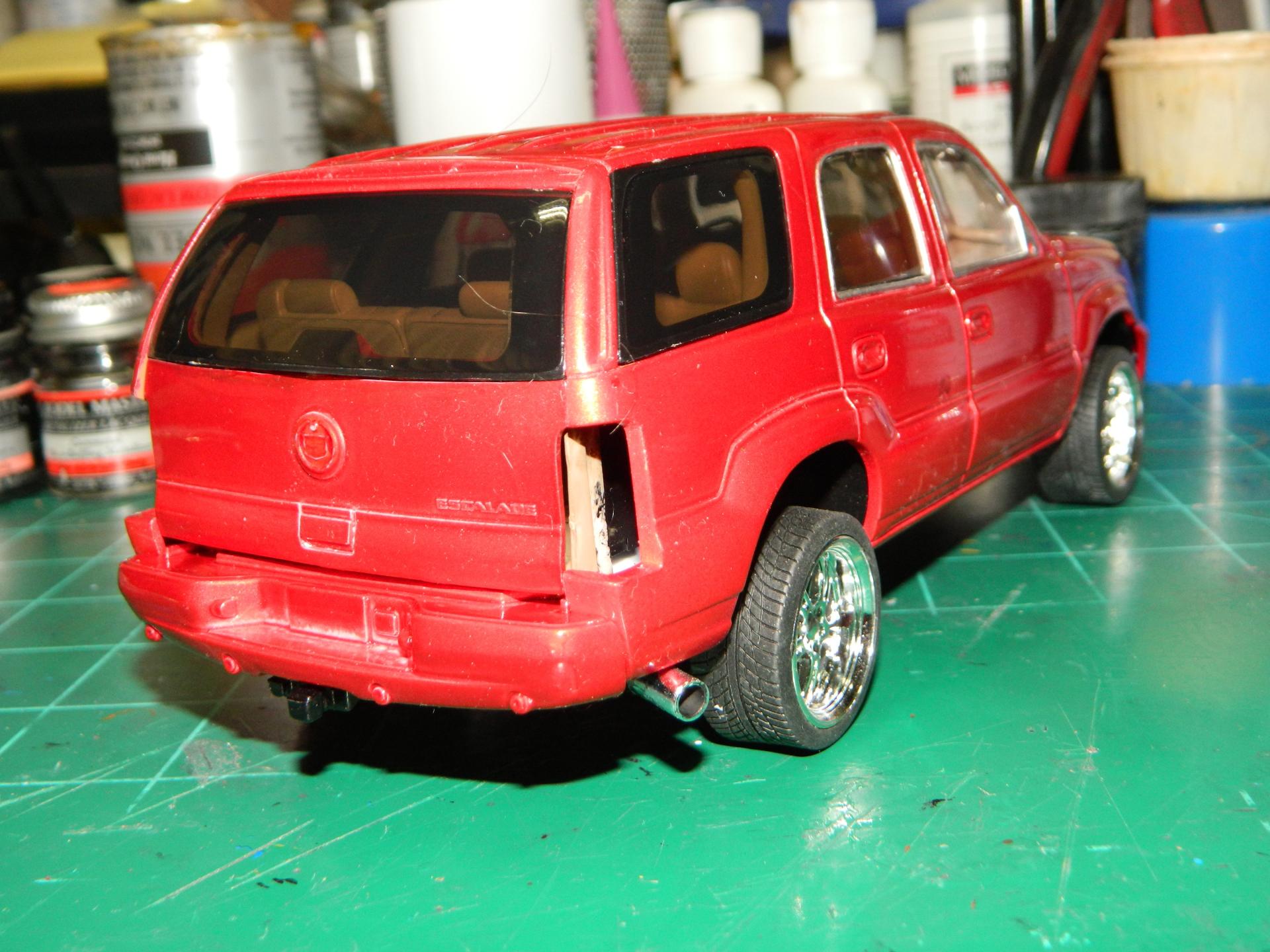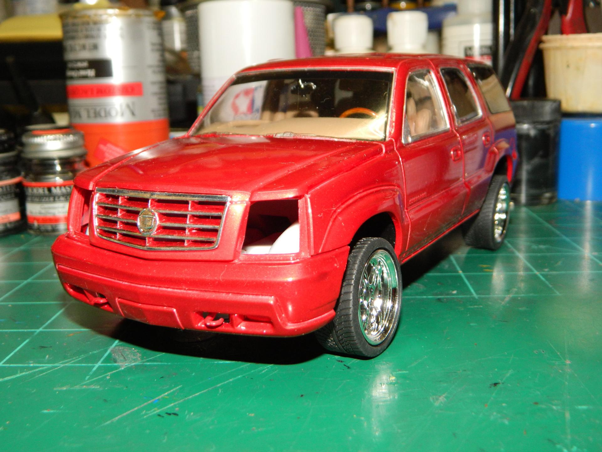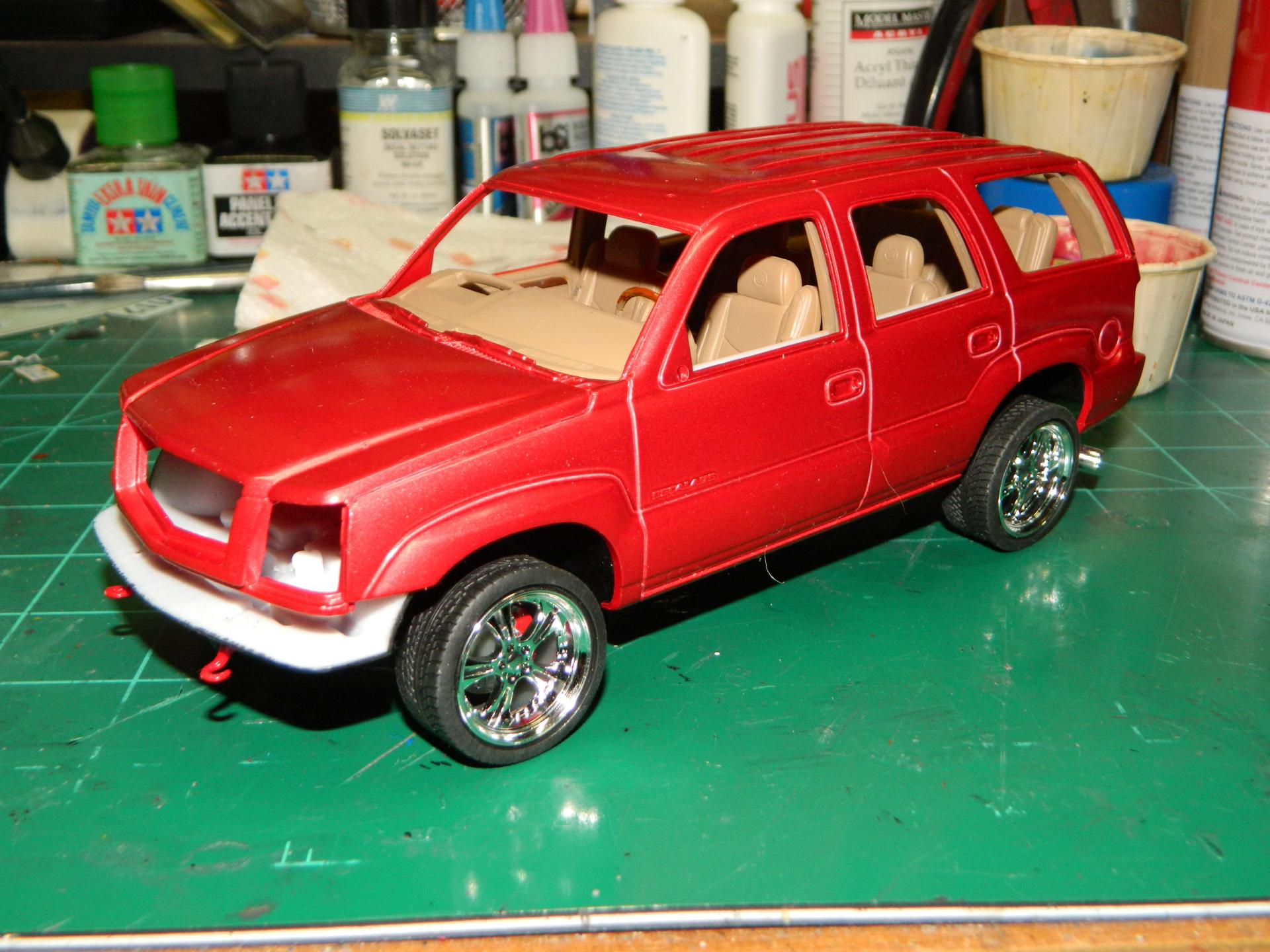 This is my 2006 Cadillac Escalade painted with Tamiya TS-18 Metallic Red with a Tamiya AS-15 Tan (USAF) interior, raised suspension and Pegasus Phat Daddies wheels and tires.
