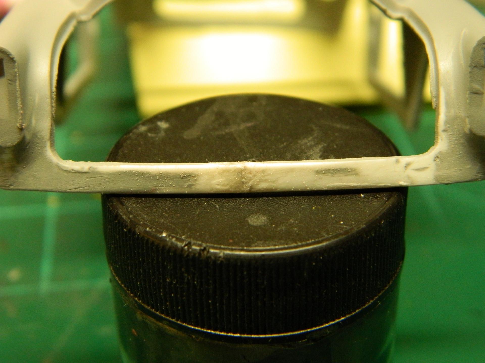 I decided to try and fix the front of the hood. I added a strip of styrene to the forward edge with some Tamiya Extra Thin Cement and started to file and sand the upper edge of the strip into a bevel. Now, to see if I can match the angle I need for the hood.