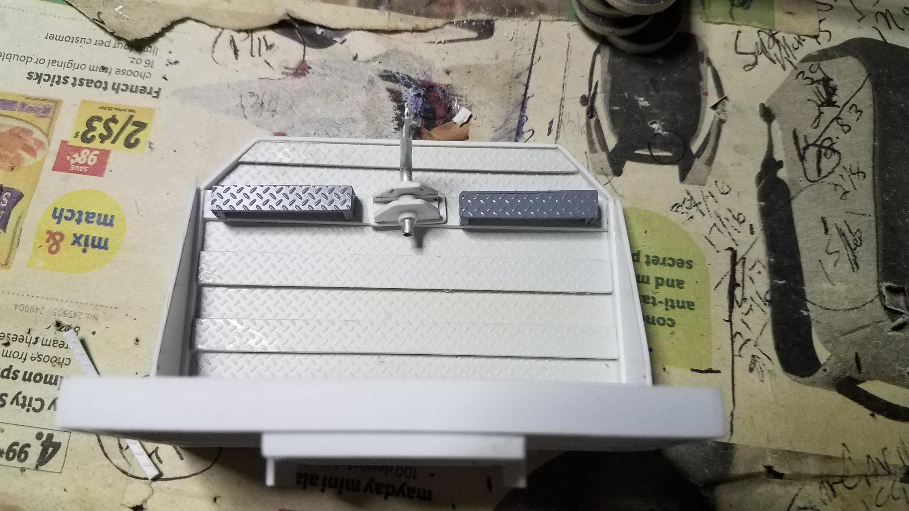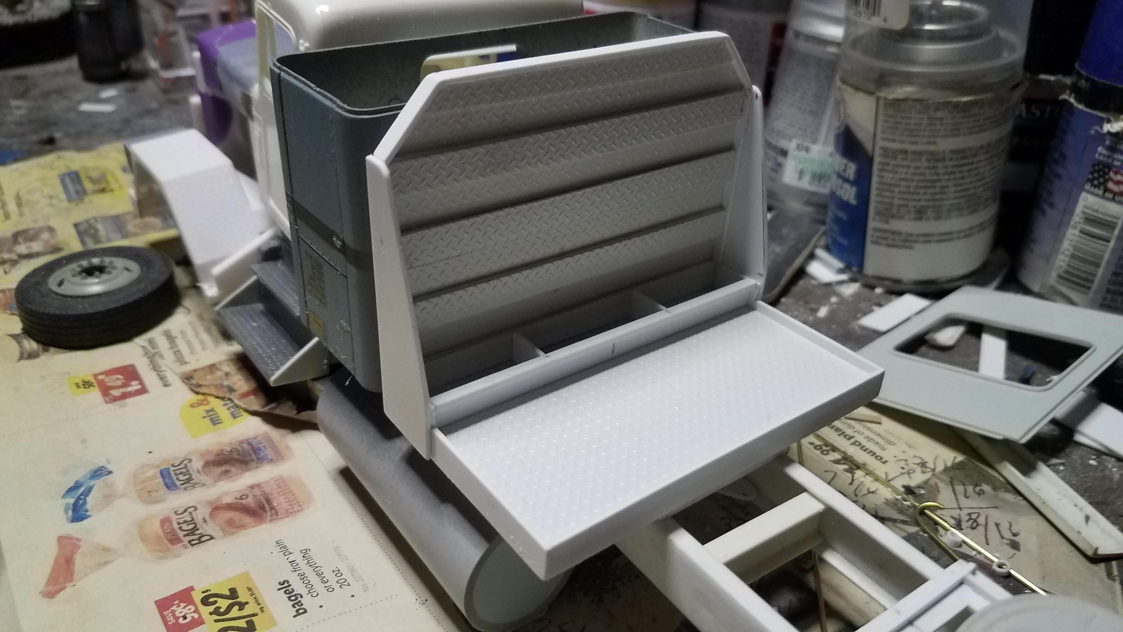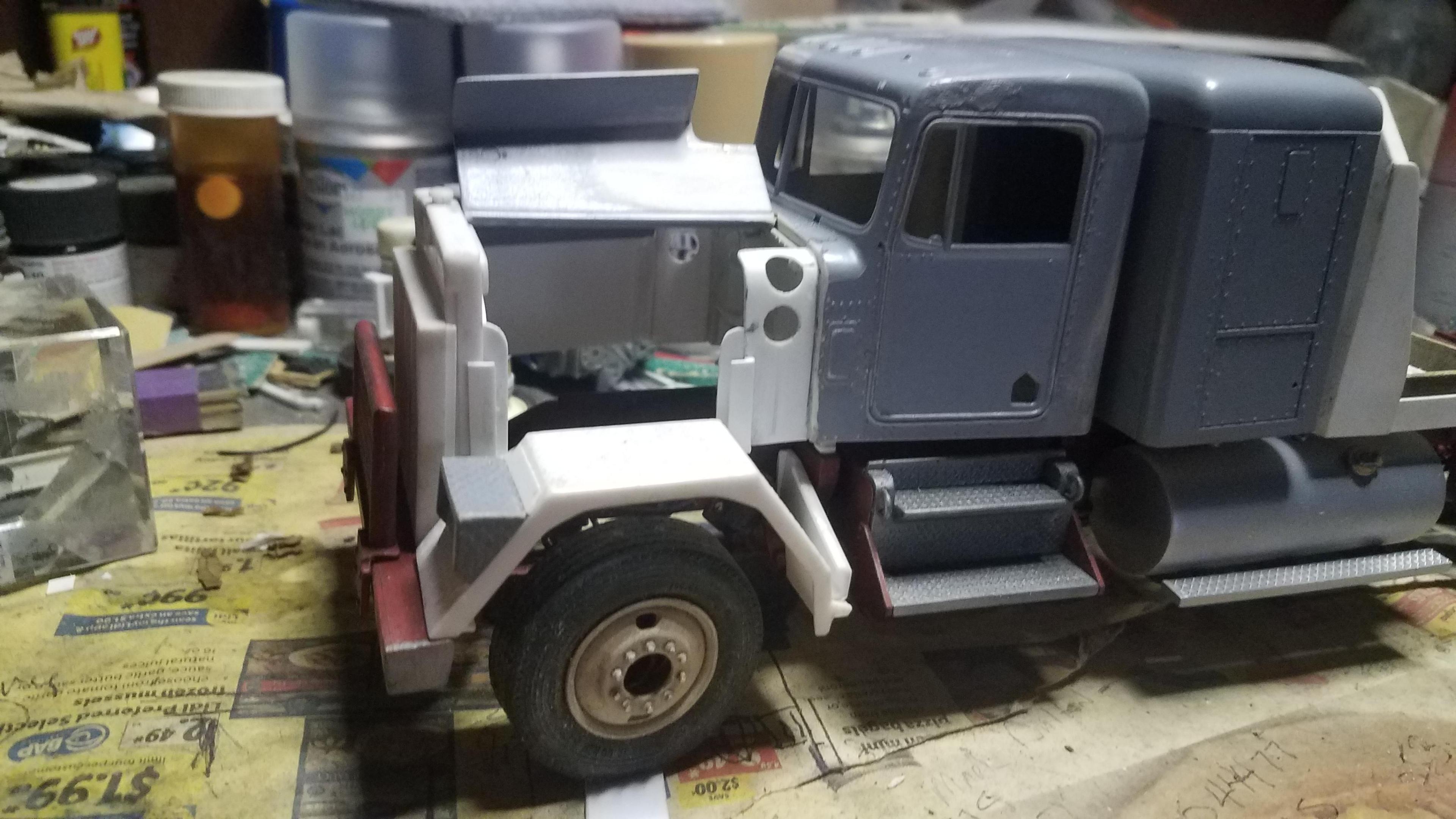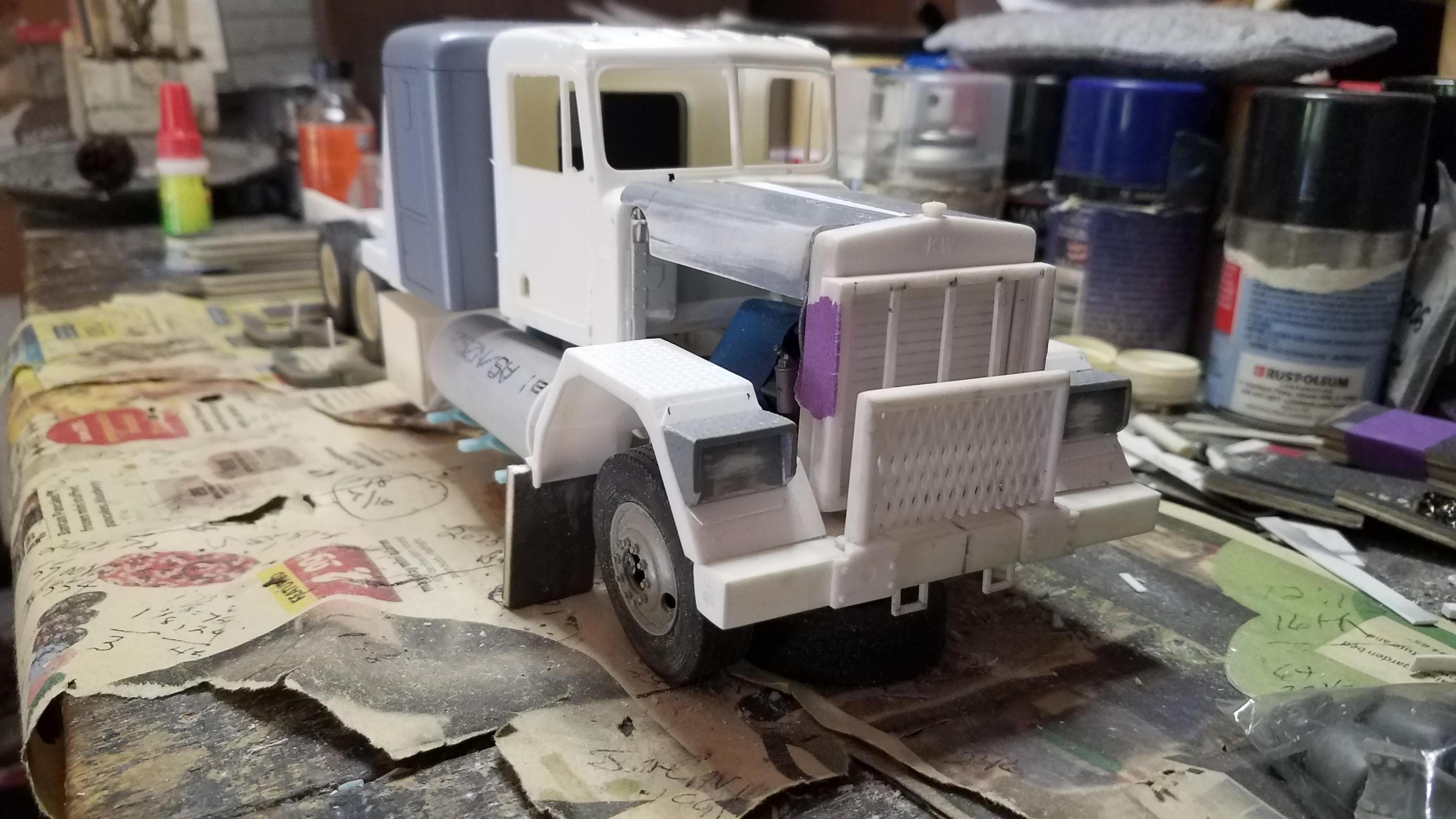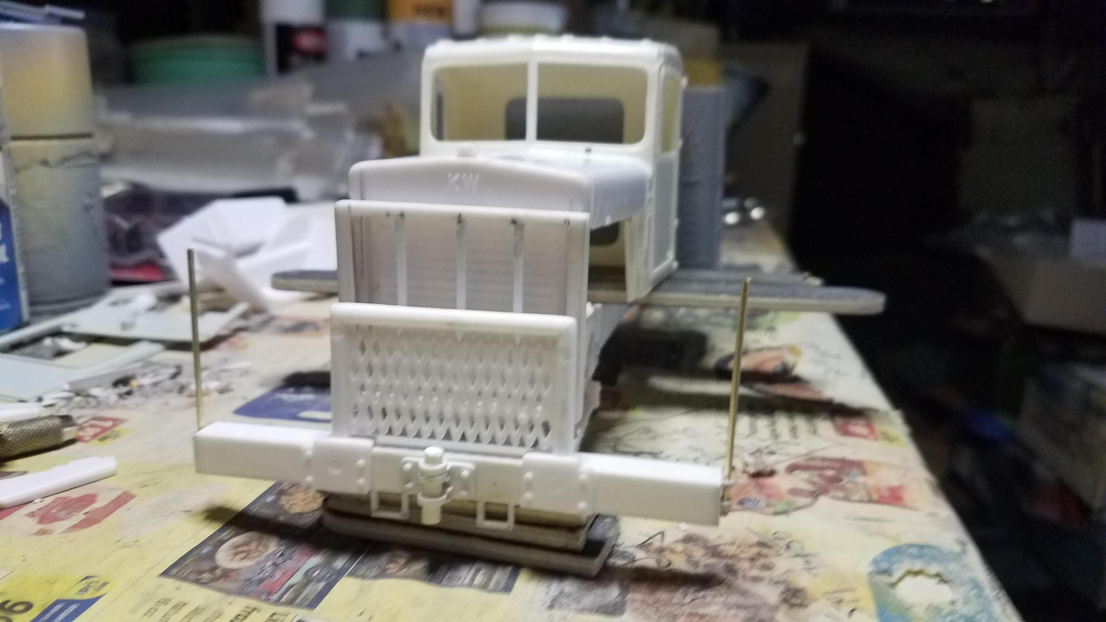 24. Got started yesterday. Took Dr. Dremel to the radiator surround and opened the front and added the radiator core from the amt kit. Did the same with the grille and put the slats back in flush since I may put a winterfront on. Built a new box bumper rather than try and fix the kit one. Added sissy sticks and built a new tow ring. Cleaned up the moose guard and got rid of the hooks.