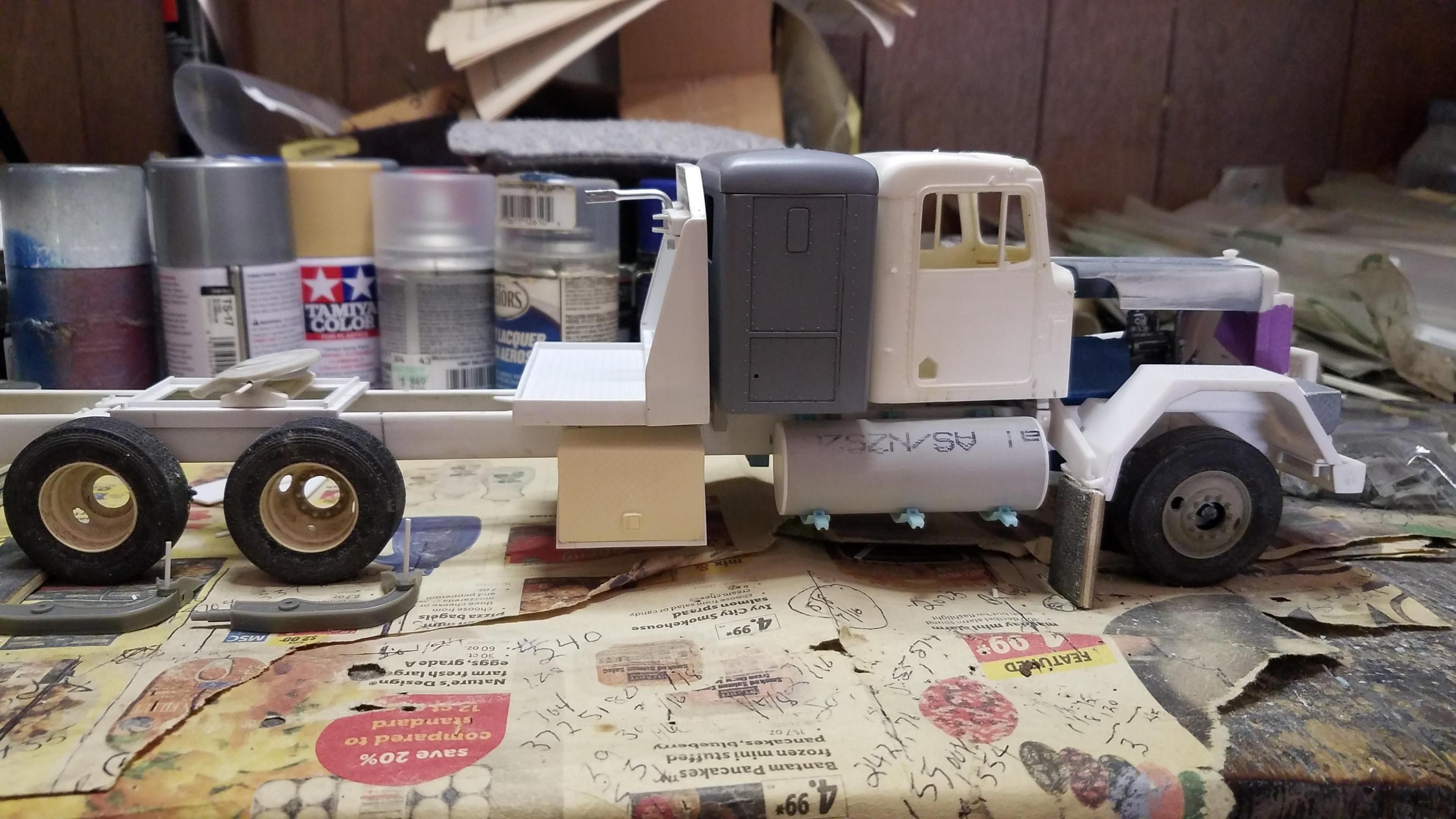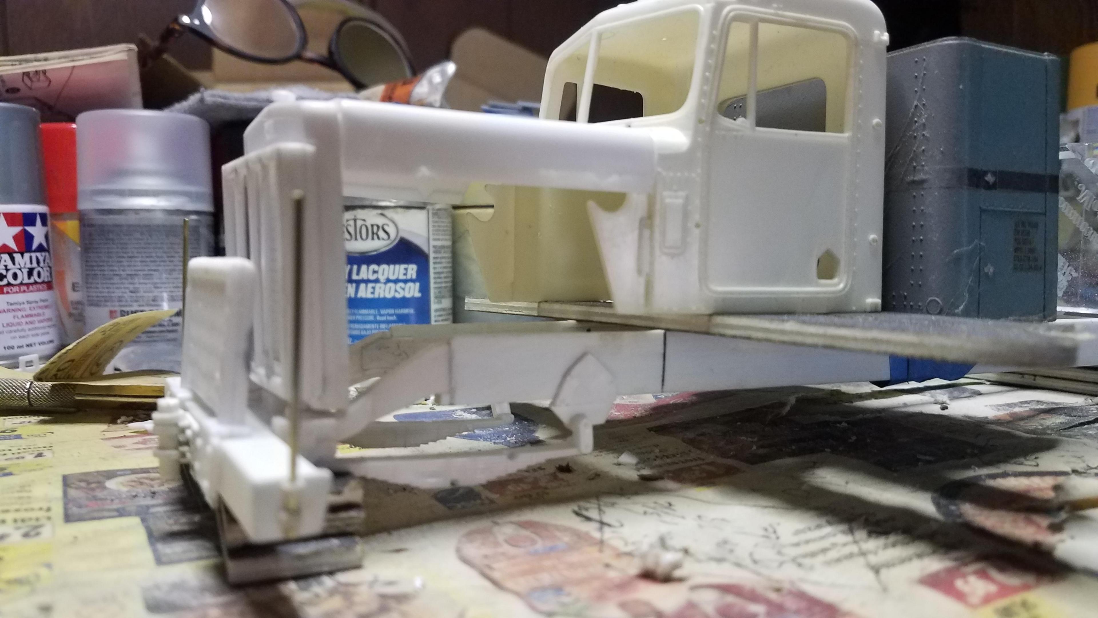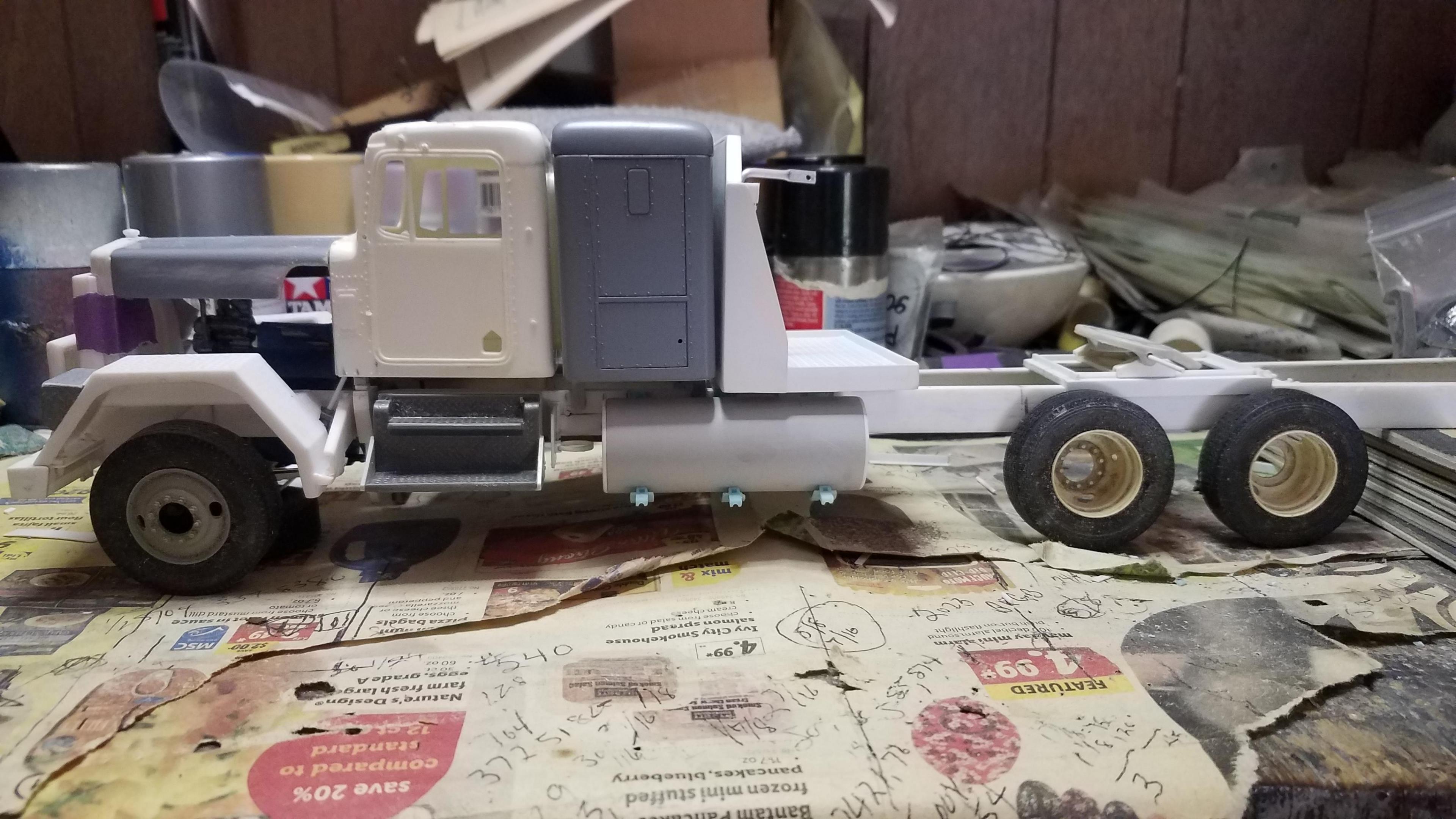 19. Built cab mounts, some Kenworth crossmembers and some others to hold the rear suspensions. Got part of the 5th wheel built primarily to hold the frame together since nothing is glued. Basis interior is started. All this is enough to get the cab, hood and radiator level. Next is cutting the hood and building hood slats and the cab cowl.