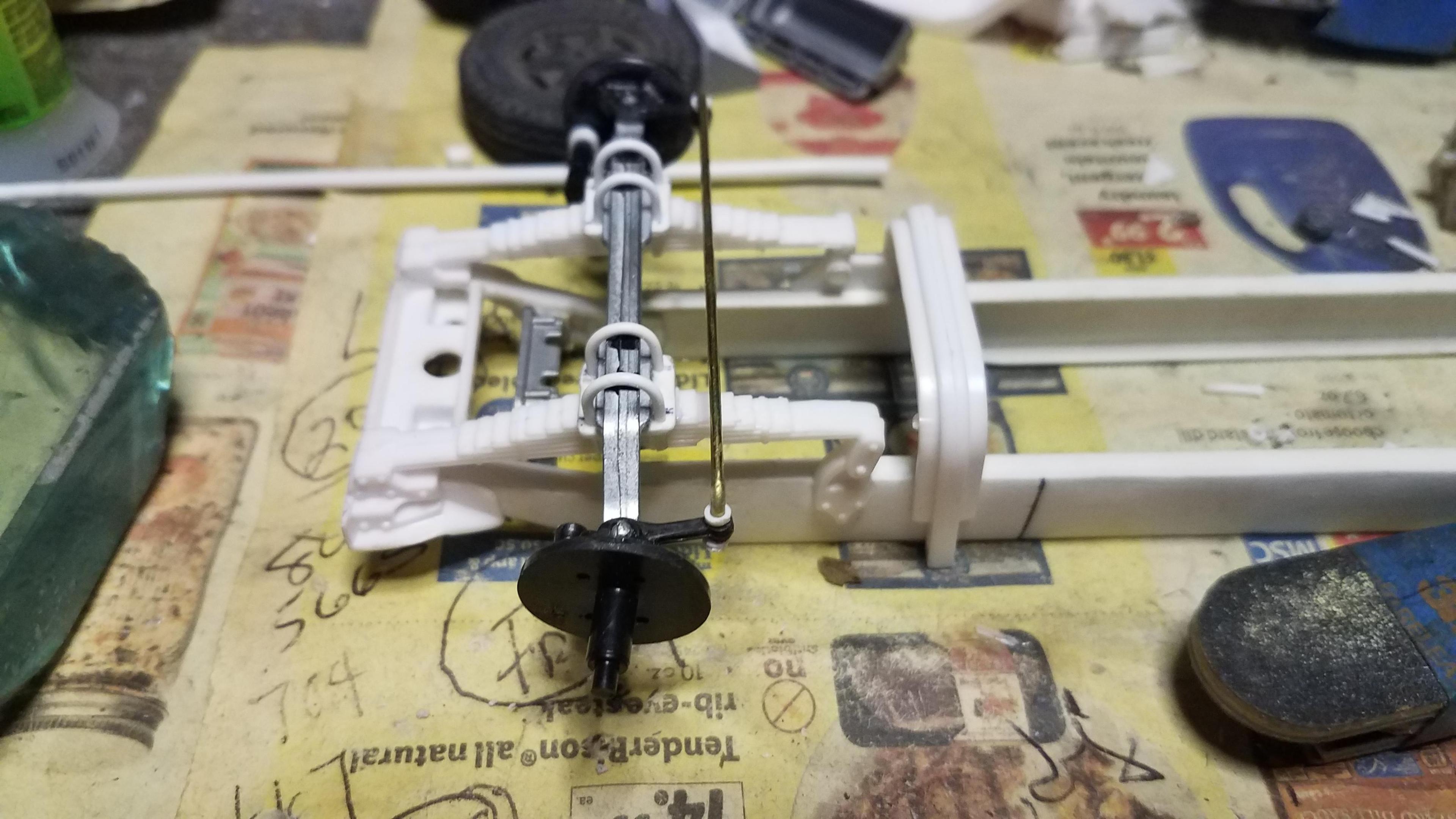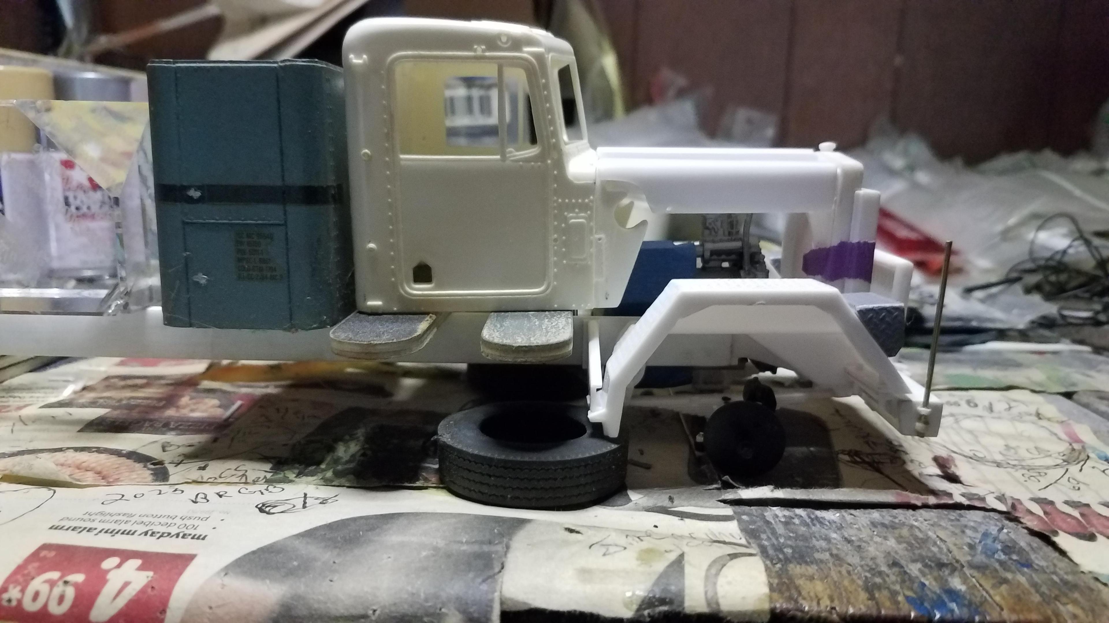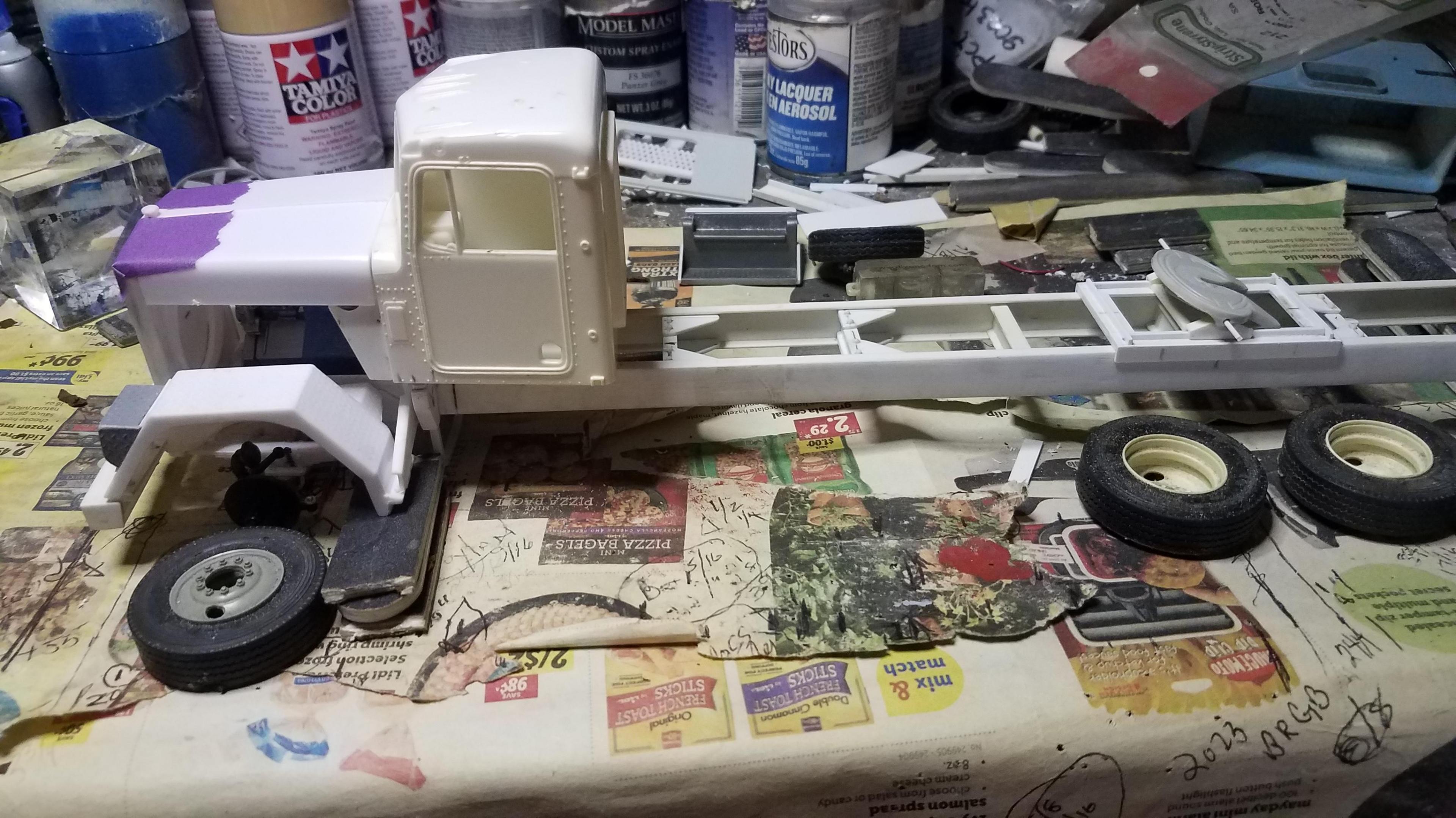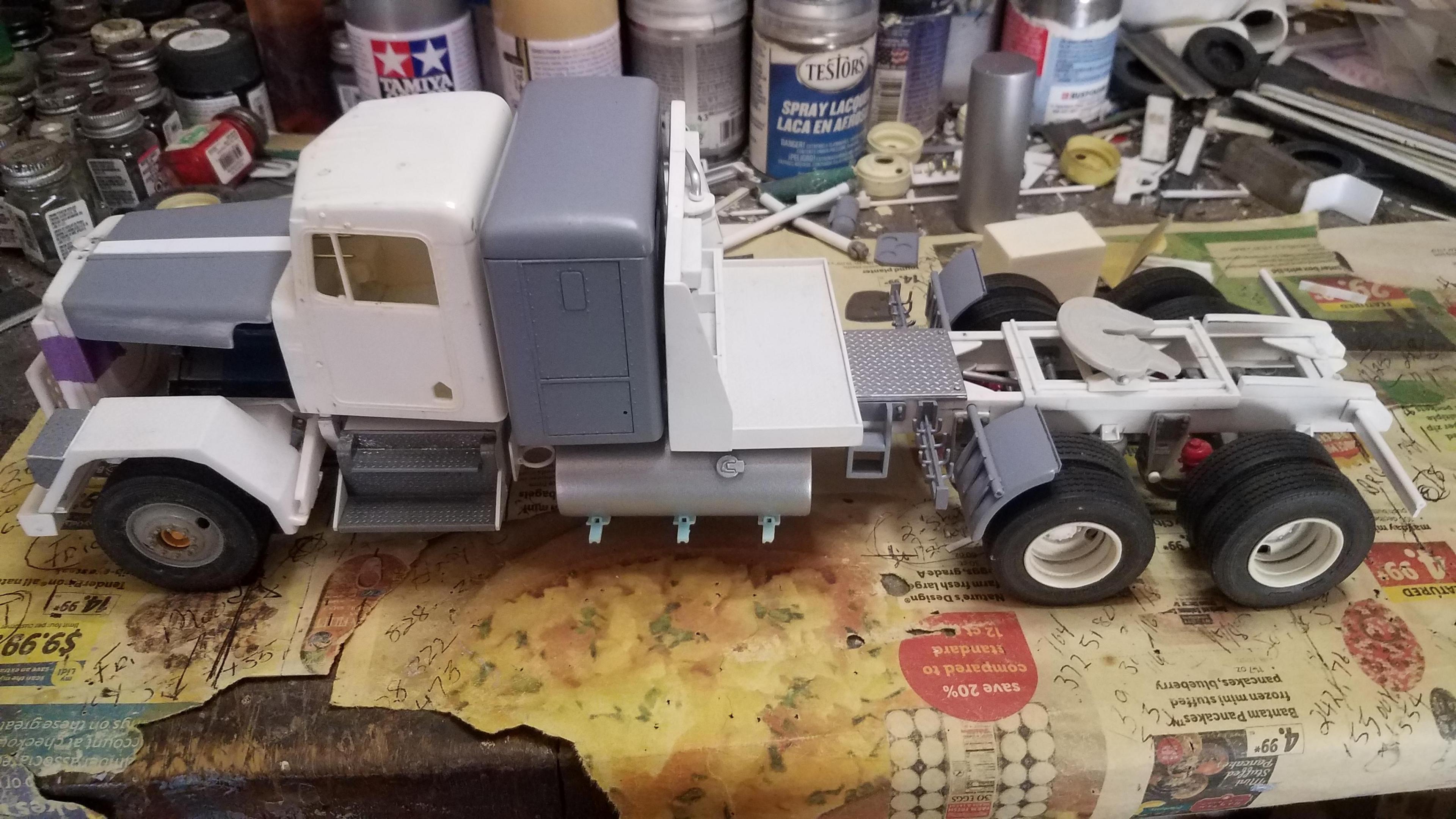 19. Built cab mounts, some Kenworth crossmembers and some others to hold the rear suspensions. Got part of the 5th wheel built primarily to hold the frame together since nothing is glued. Basis interior is started. All this is enough to get the cab, hood and radiator level. Next is cutting the hood and building hood slats and the cab cowl.