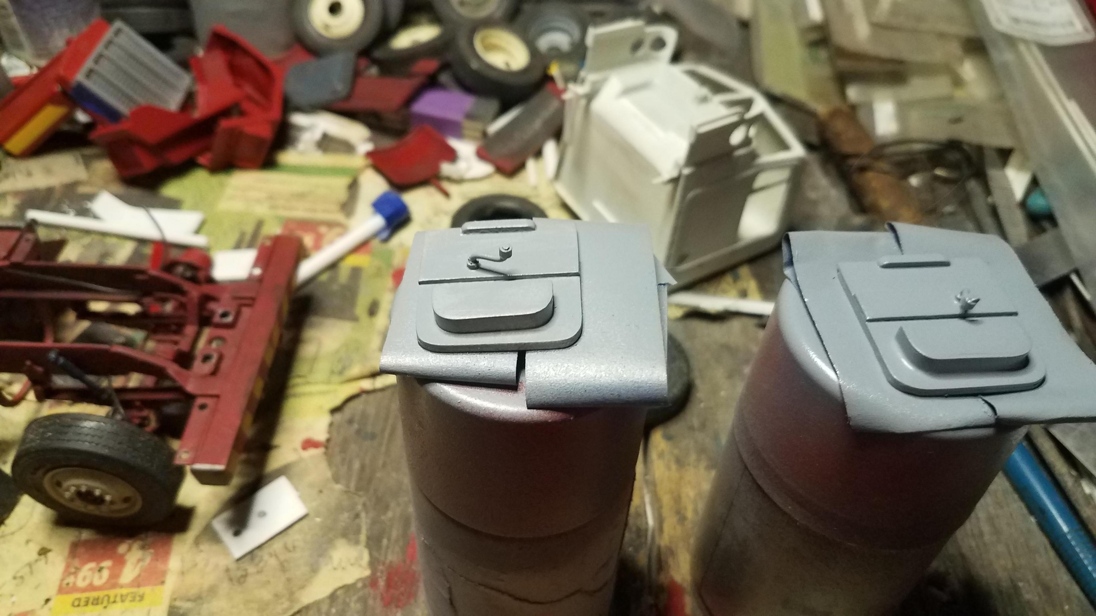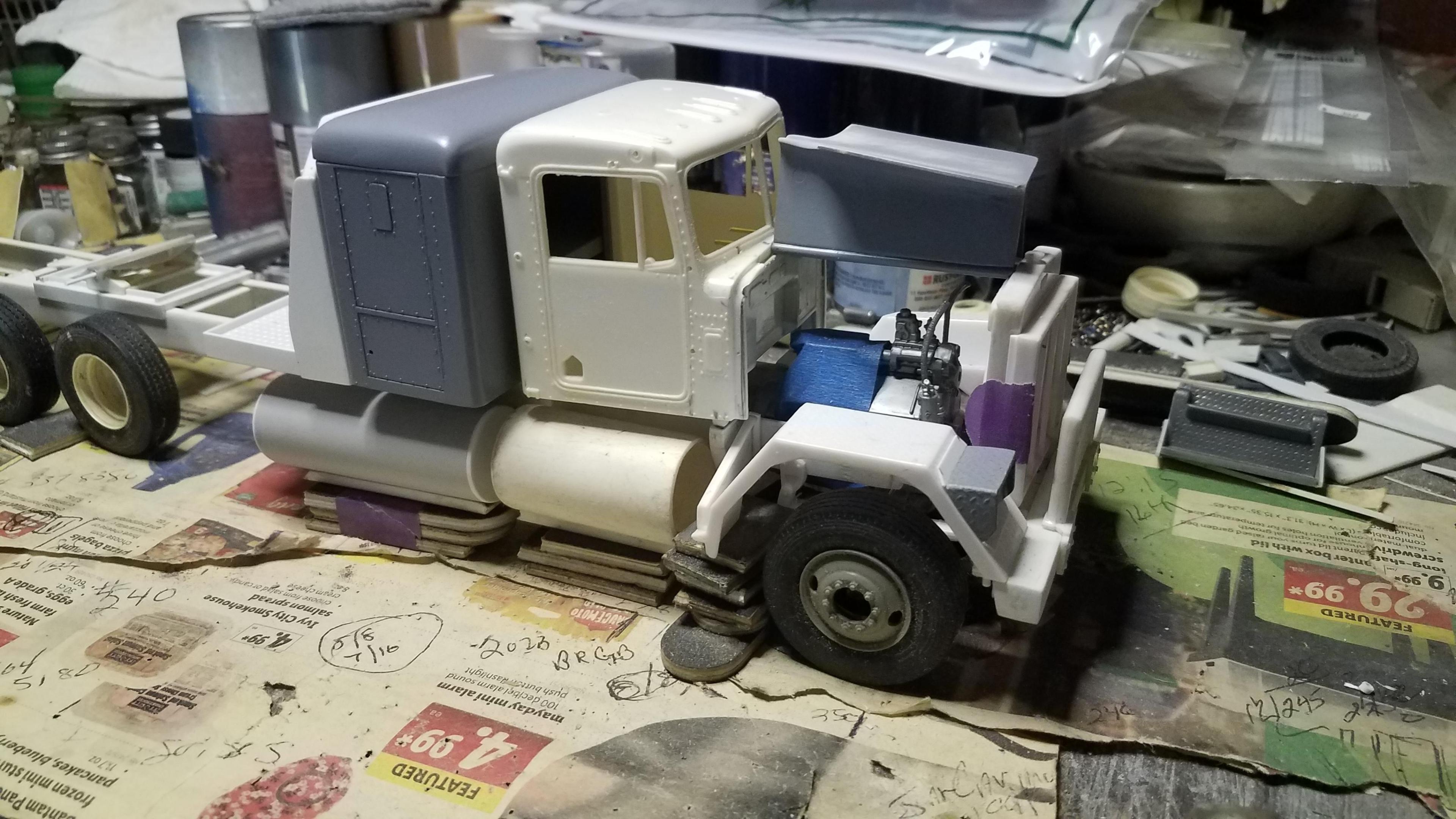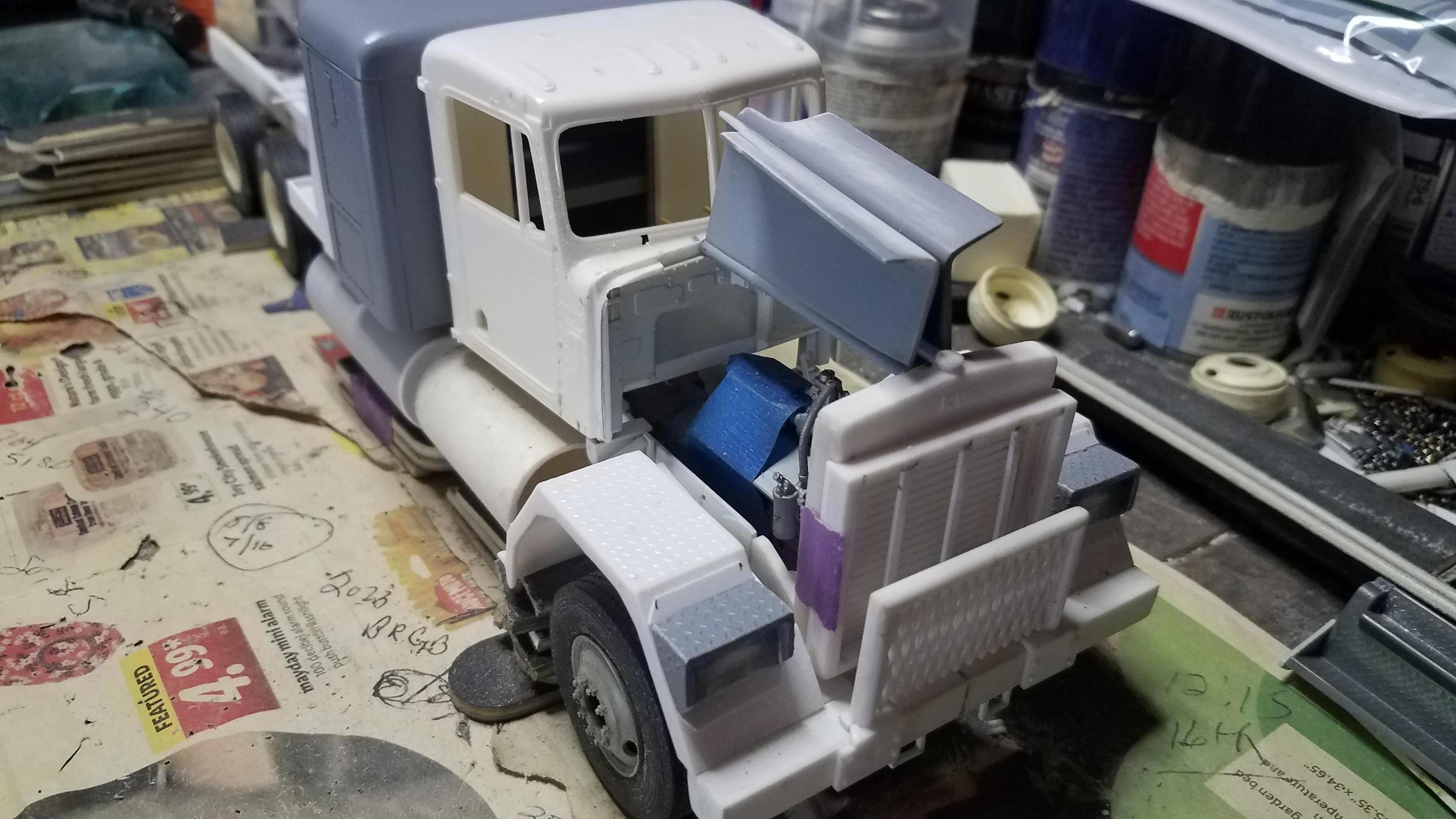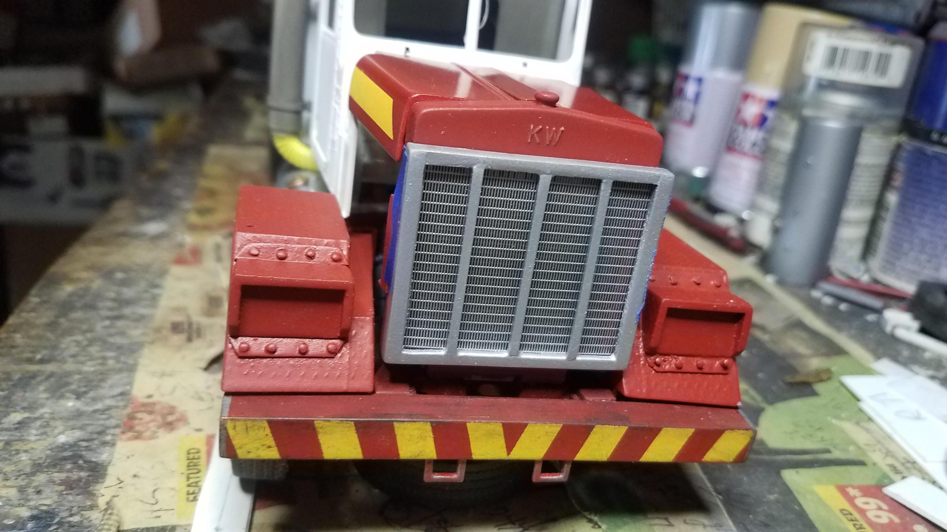 5. Got curious about paint selection so I did a little paint work to see. Completely out of build sequence. Finished the air cleaners. Added Plano railroad screen in the grille surround. It's an apex pattern similar to the KW pattern. They also make a Peterbilt oval pattern.