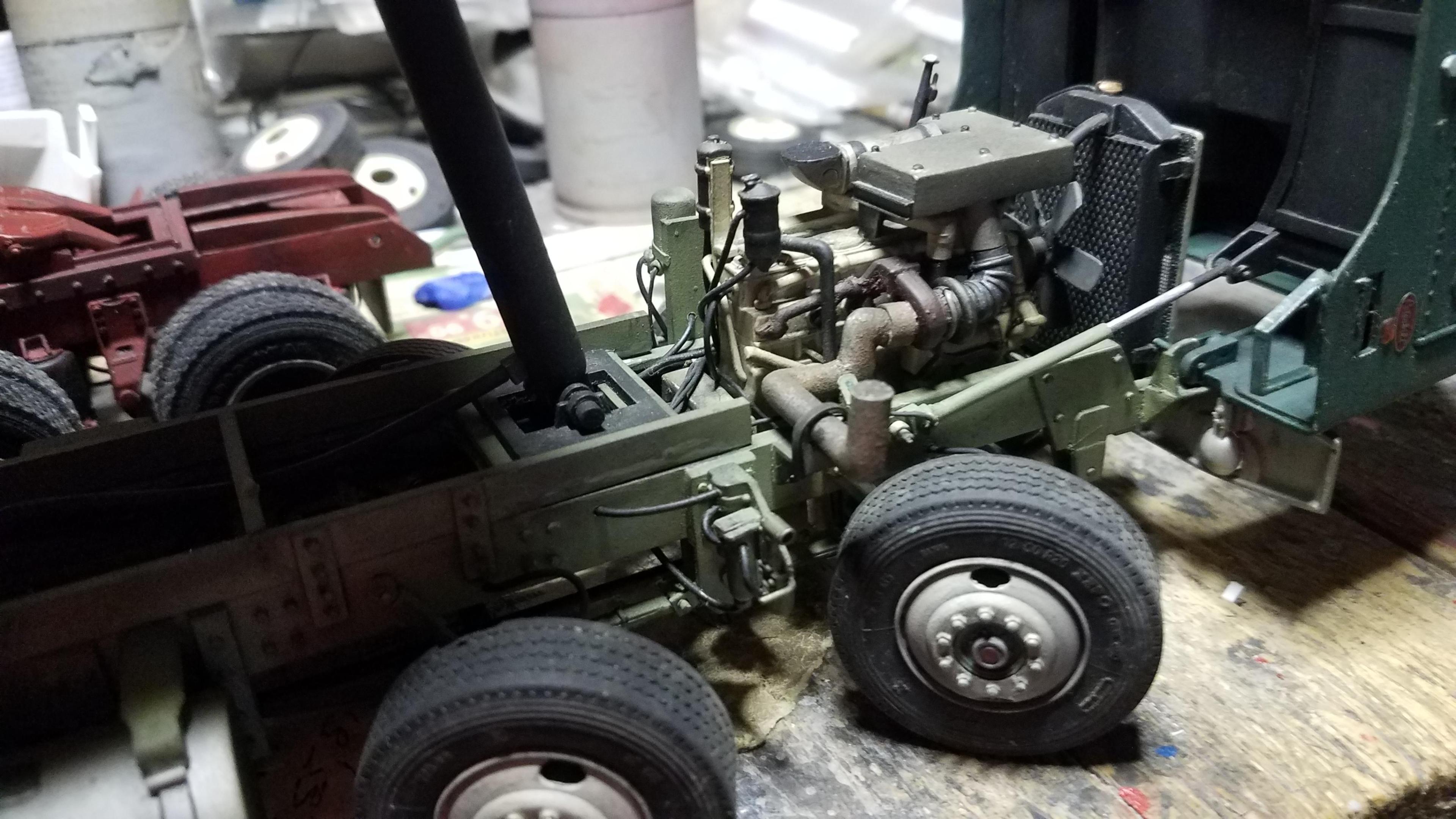 21. Got the front axle on. Metal axle, Italeri spindles and plates, brass tie rod and ujoints. Engine mounts built and engine leveled to fit radiator . Using a Cat 3408. Surprised by the small parts count. It needs some more components. Battery box cleaned up.