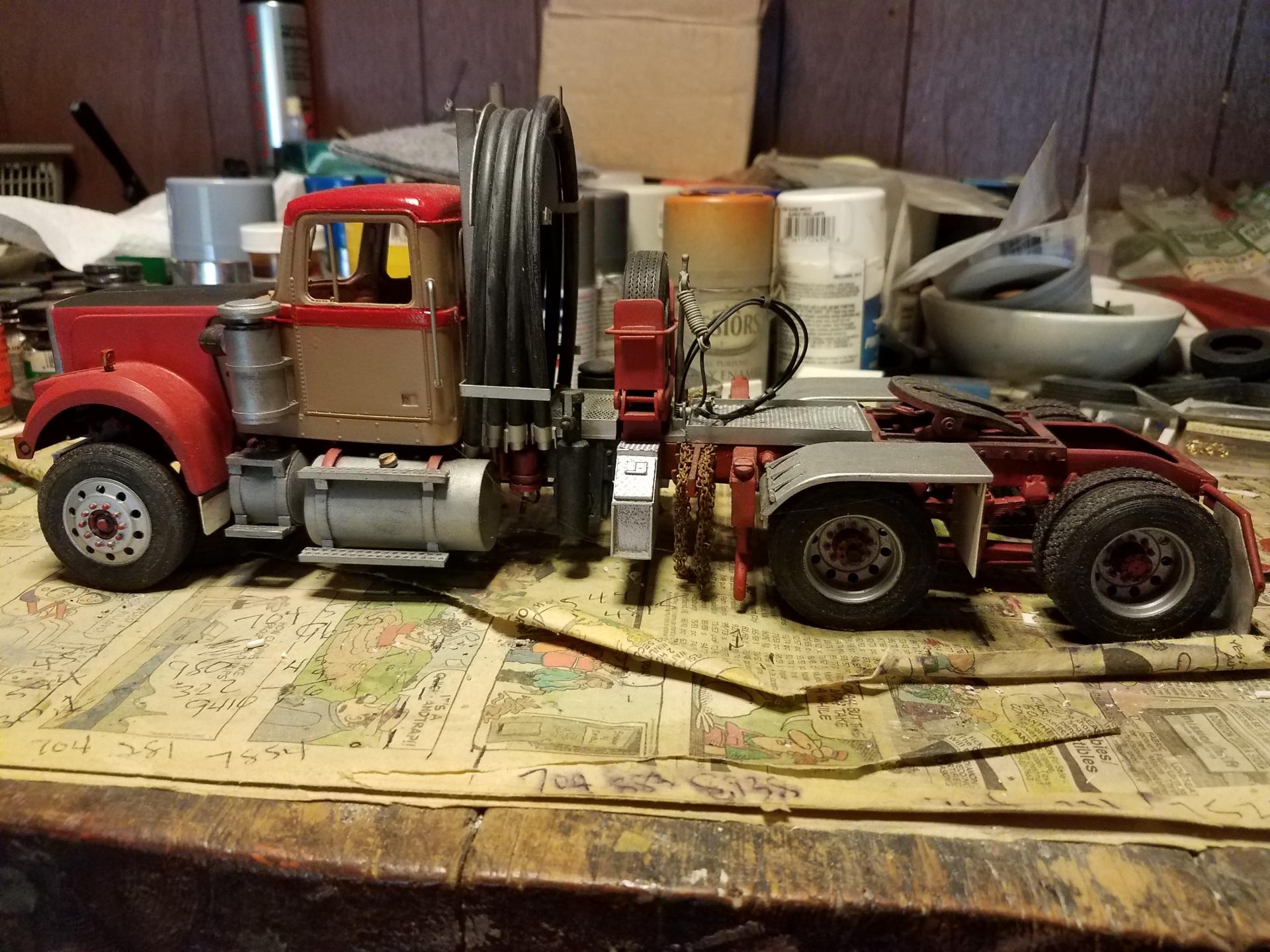 Early eighties WS tractor. Fabricated chassis. fuel tanks , battery box, air start tank, hose carrier, tire carrier ,pneumatic unloading system , 5th wheel mount and carriage, tire chain hangers. Storage boxes and sanders from AITM. Wheels and tires from Jamie. Cab is italeri and hood is updated and widened AMT hood.