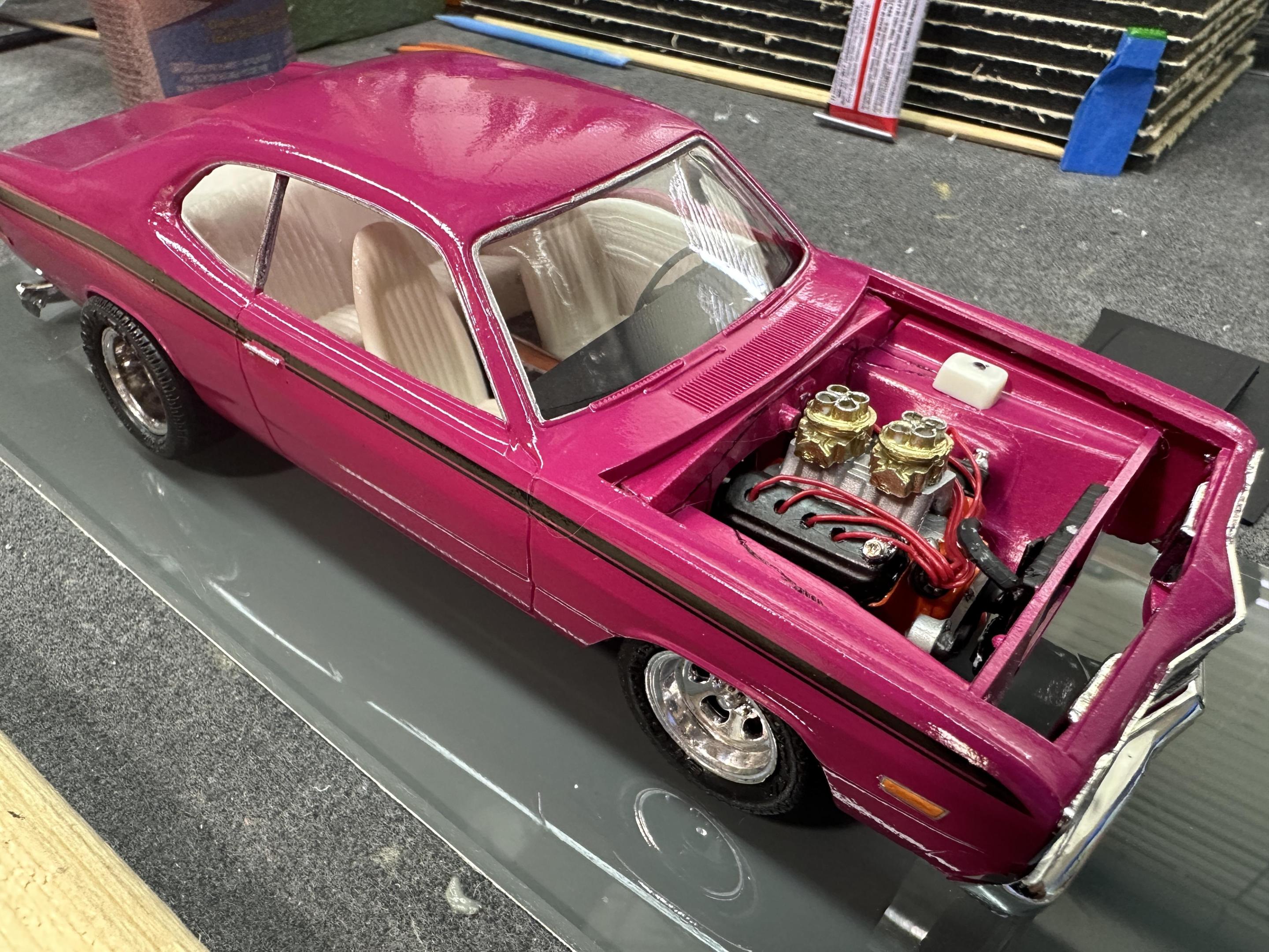 Bought this one years ago from a friend on Facebook. It has been stripped and redone a couple of times over the years but this is its final build. Wired the engine, lowered the stance a bit. I used the radiator from the Revell 71 Cuda kit as it looked better. Paint is Krylon Fusion Gloss Jungle Green over Duplicolor gray primer. It may not be a show winner but I’m happy with it.