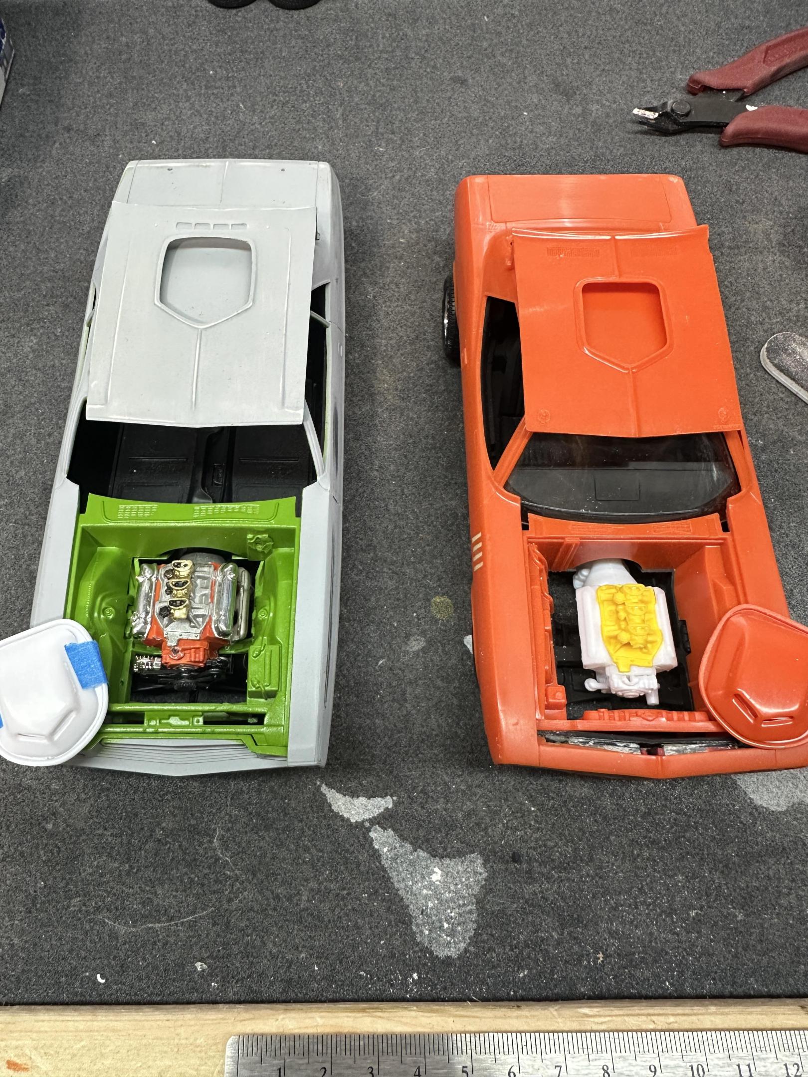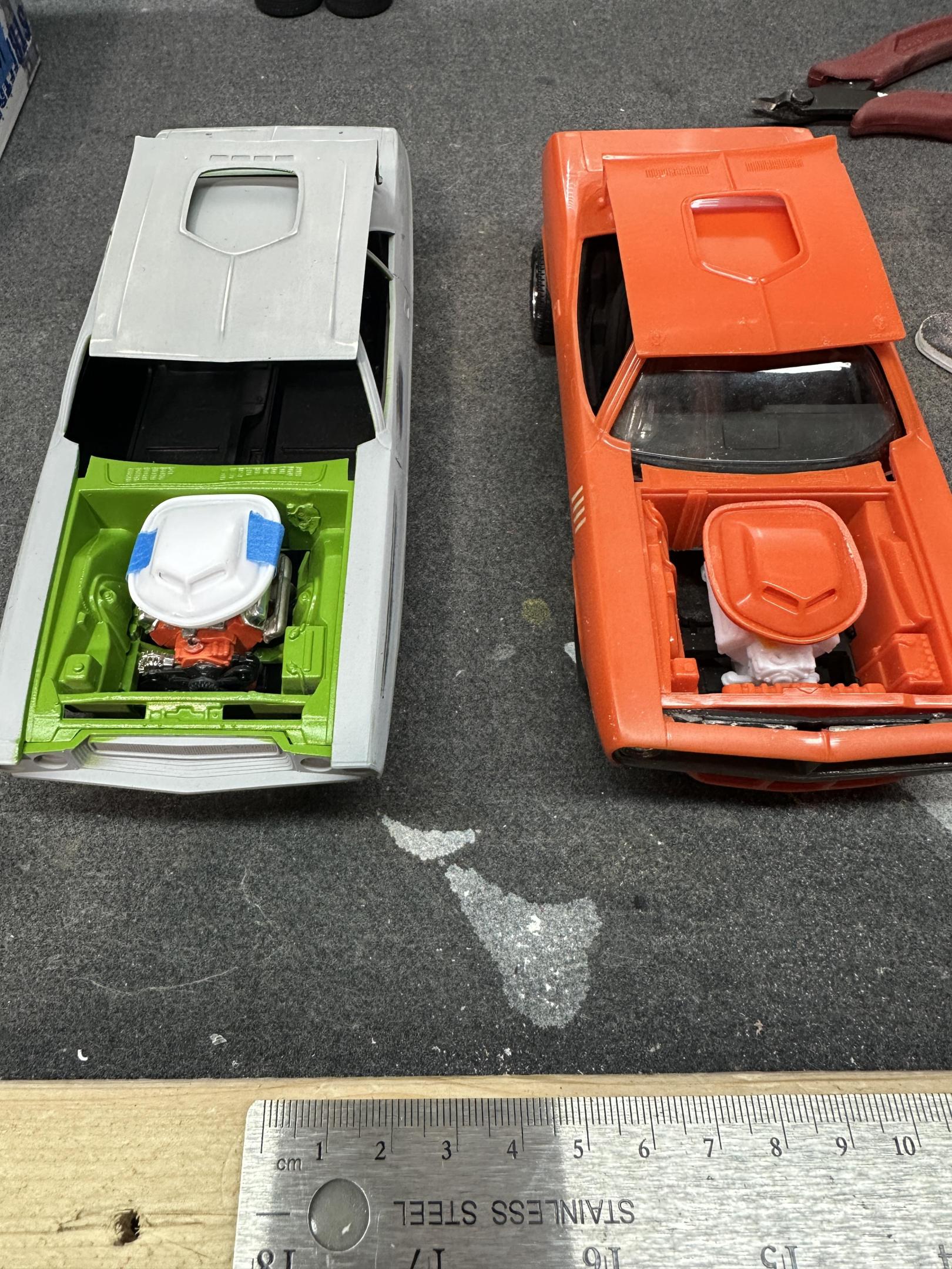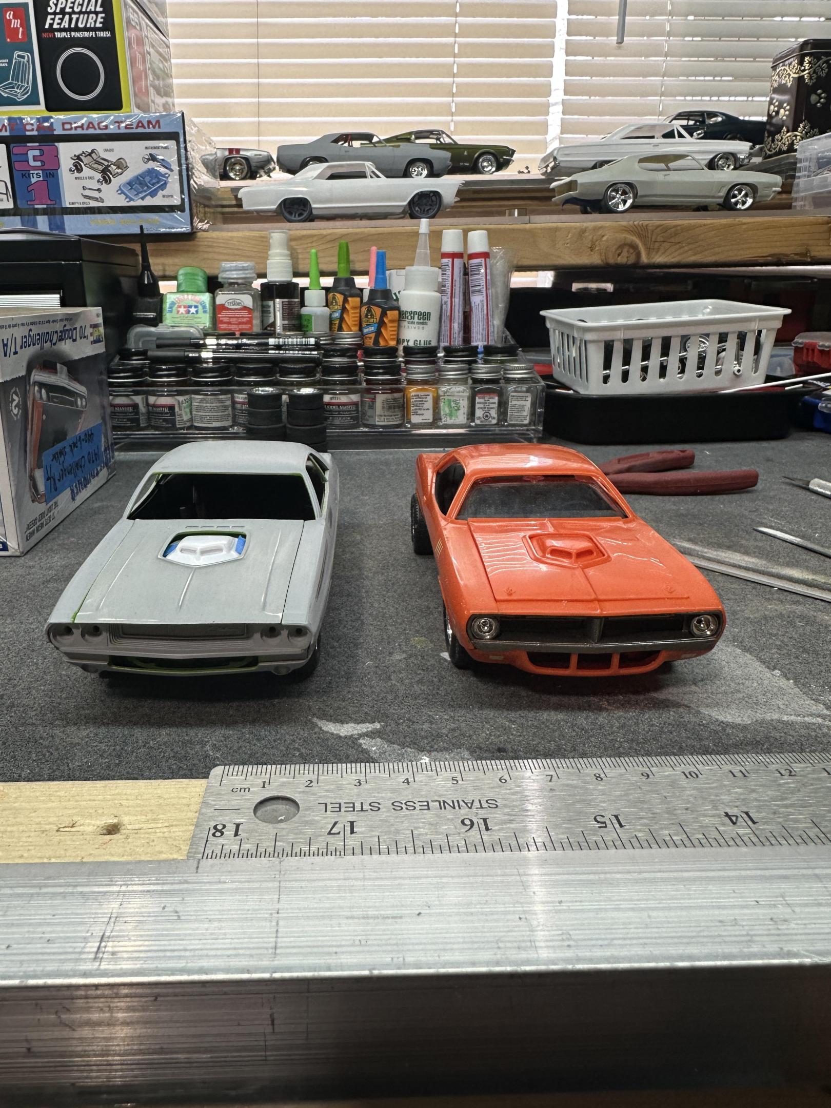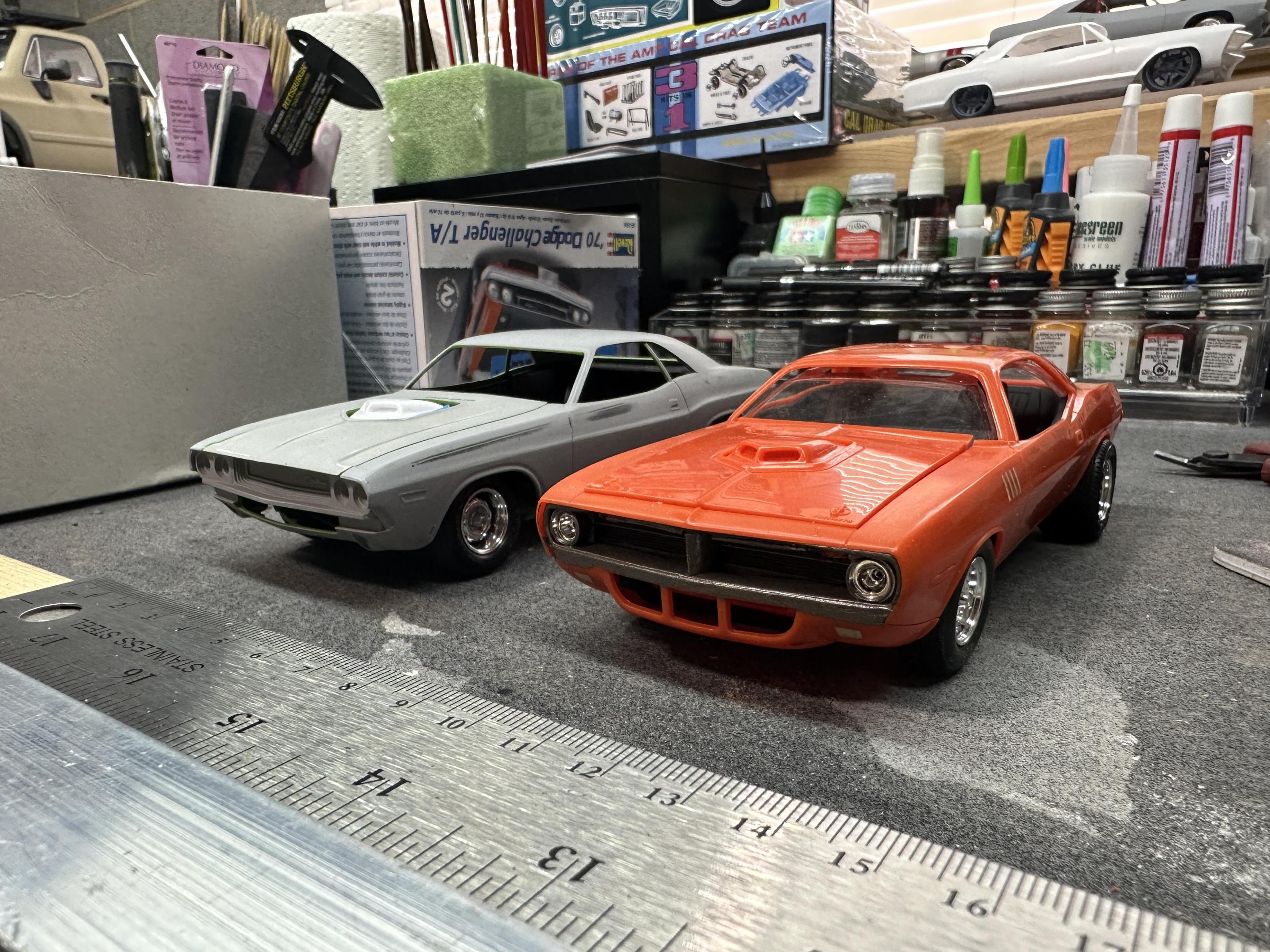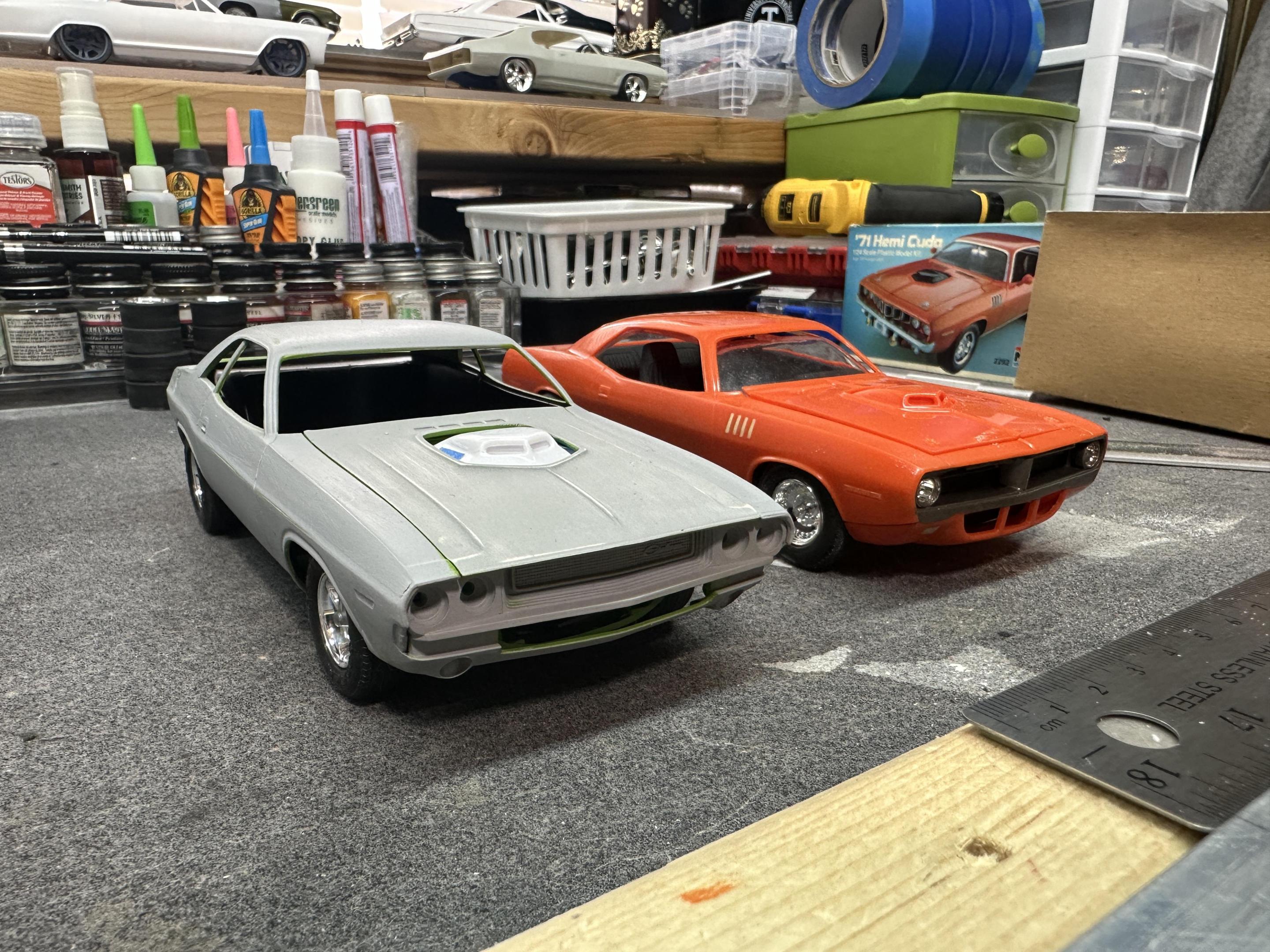 1970 Challenger T/A I’m converting to an R/T with a 440-6pak and originally a Monogram 71 Hemi Cuda I scored off of eBay that someone had started converting to a 70 Cuda also being built as a 440-6bbl car. Both will have shaker hoods. -