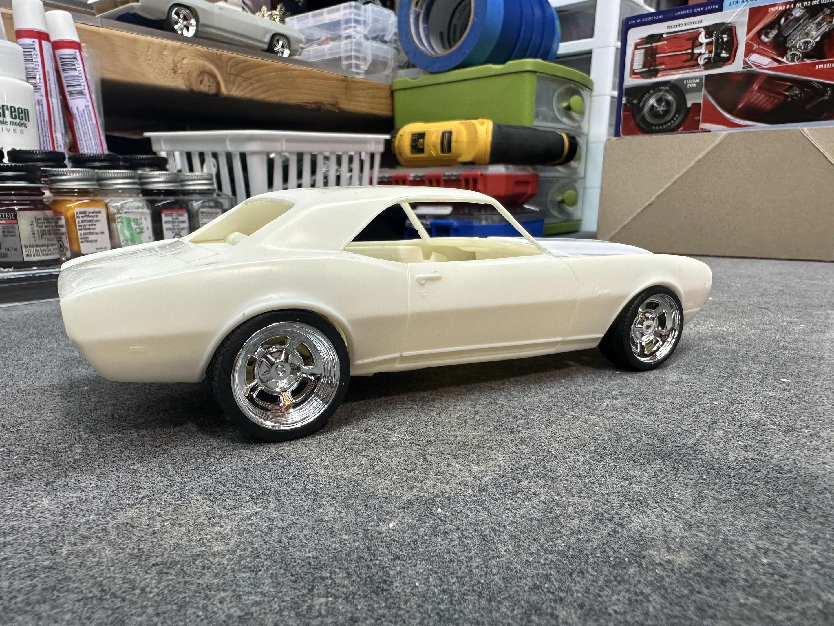 AMT 68 Z28 Camaro that I’m building as a restomod/ pro touring car. Modified the hood from the recent Ollie’s 69 Camaro kit. Wheels and tires are from Pegasus. Will have a big block and 4 speed. -