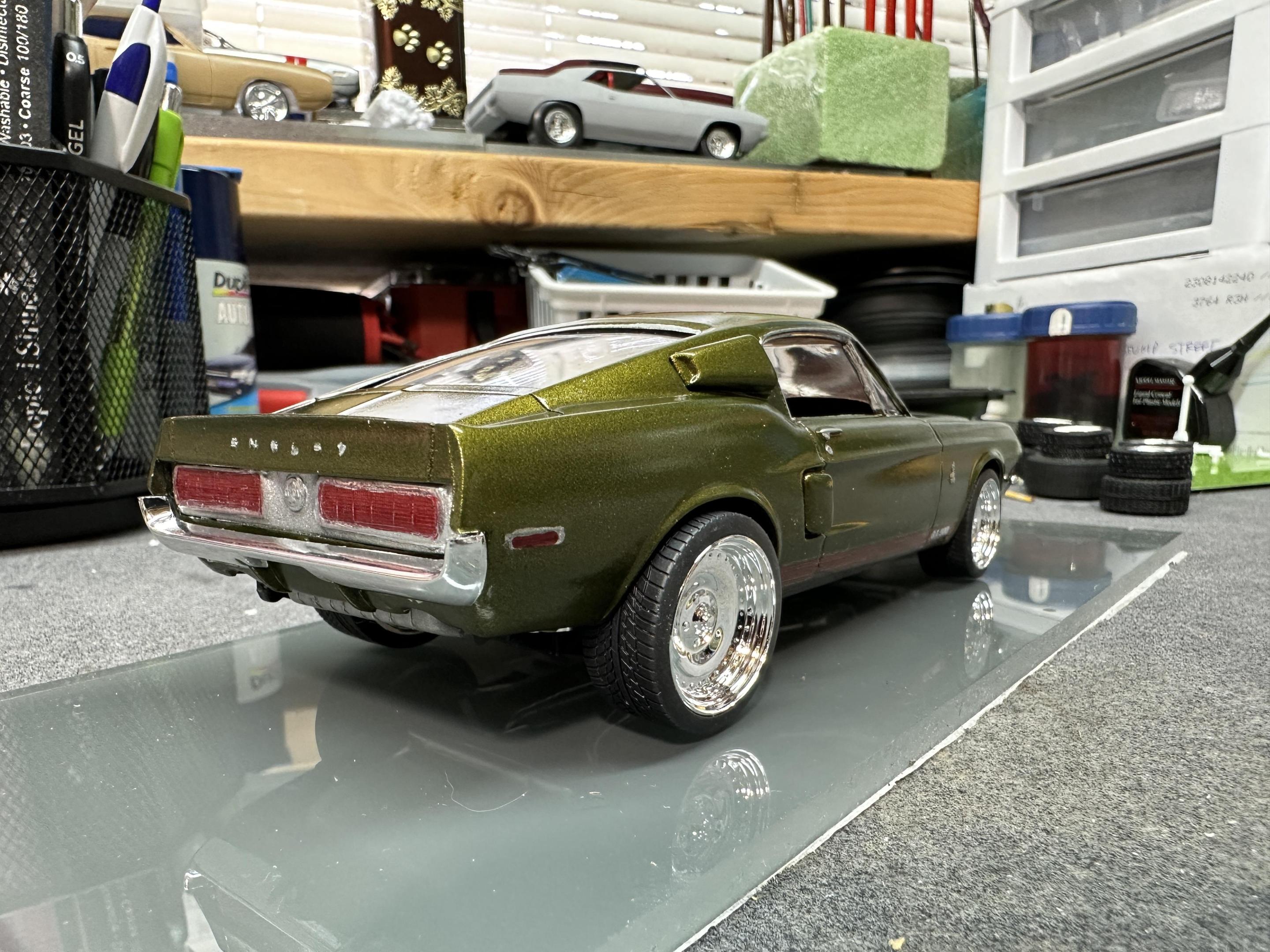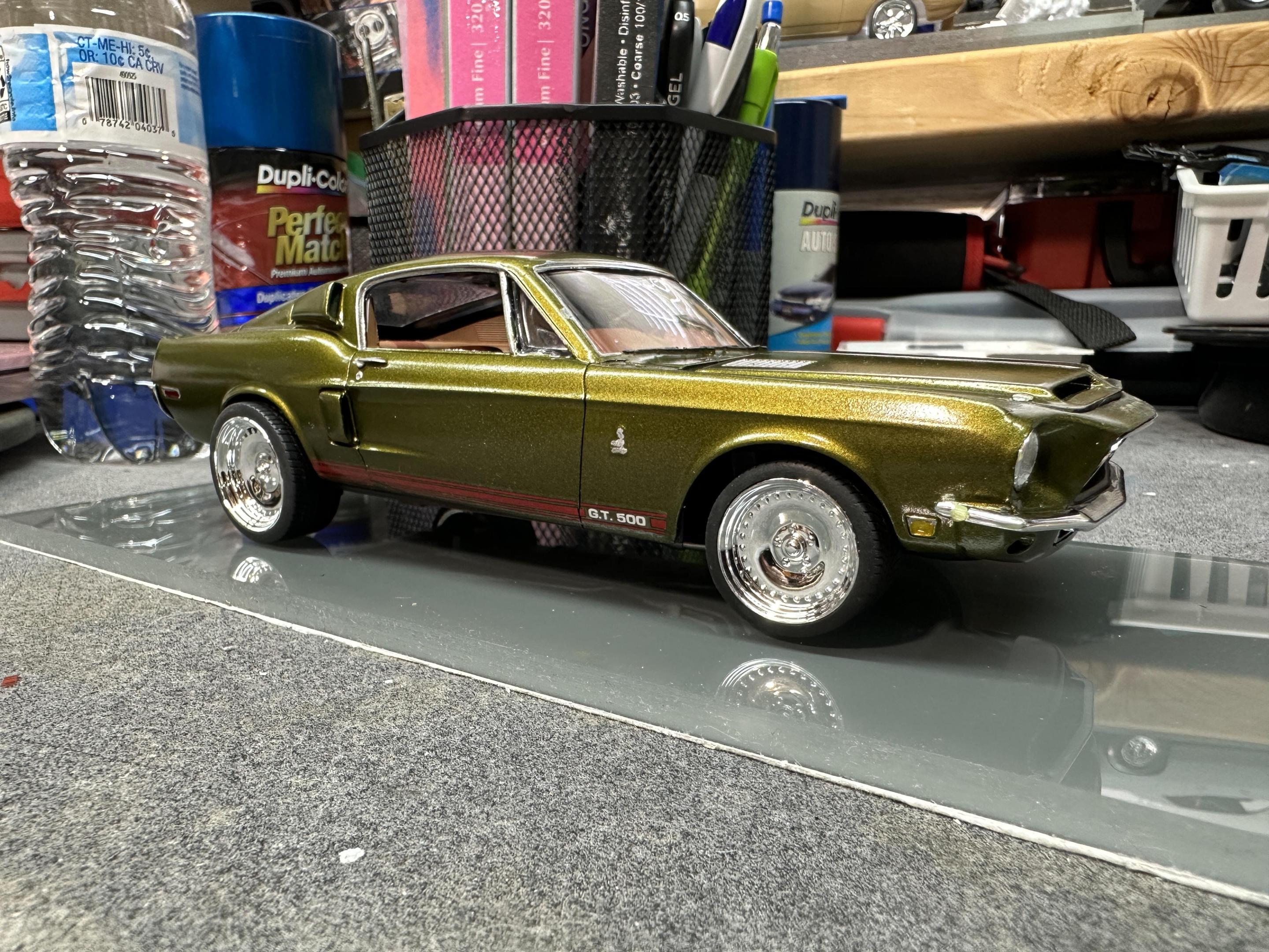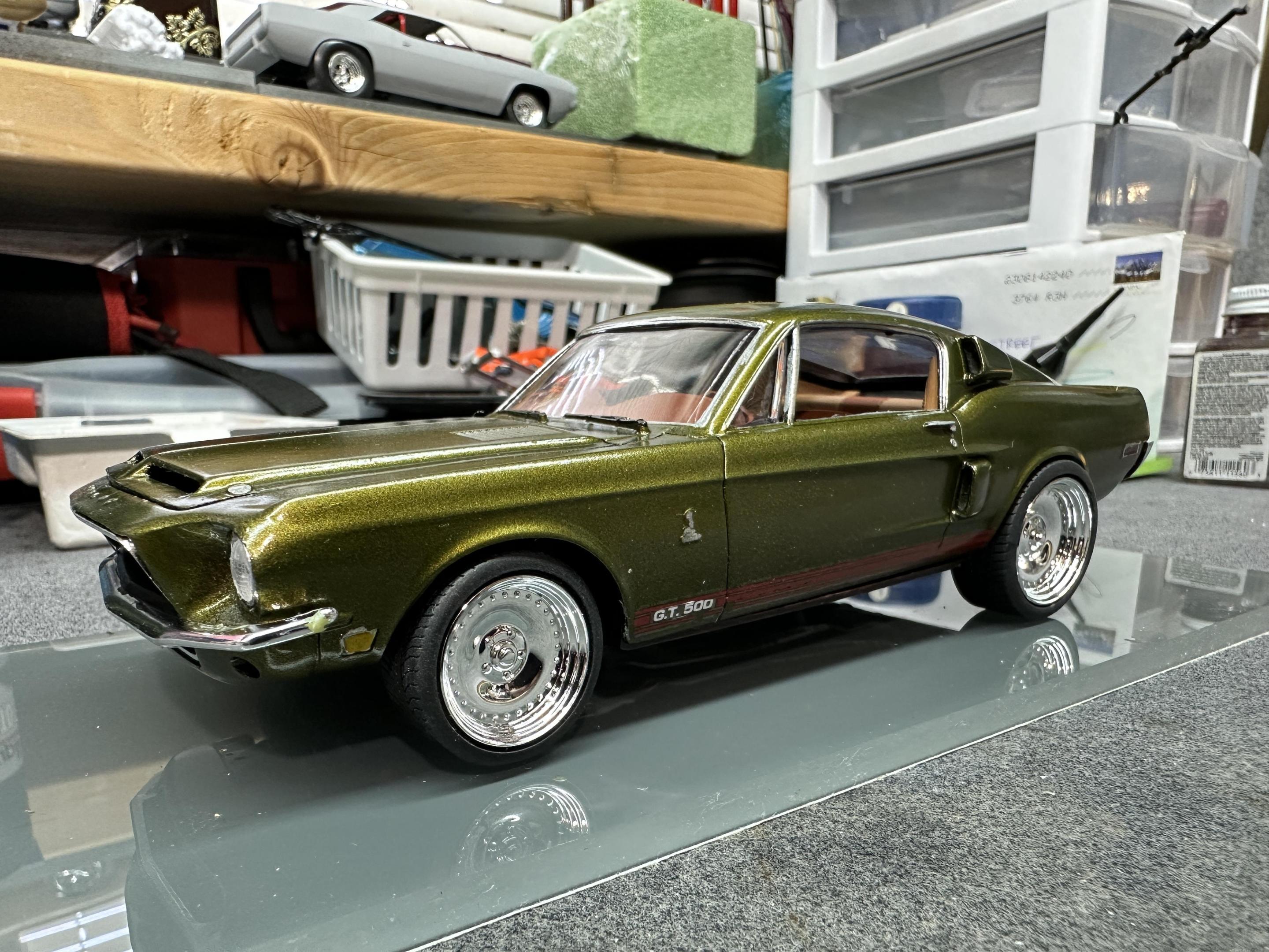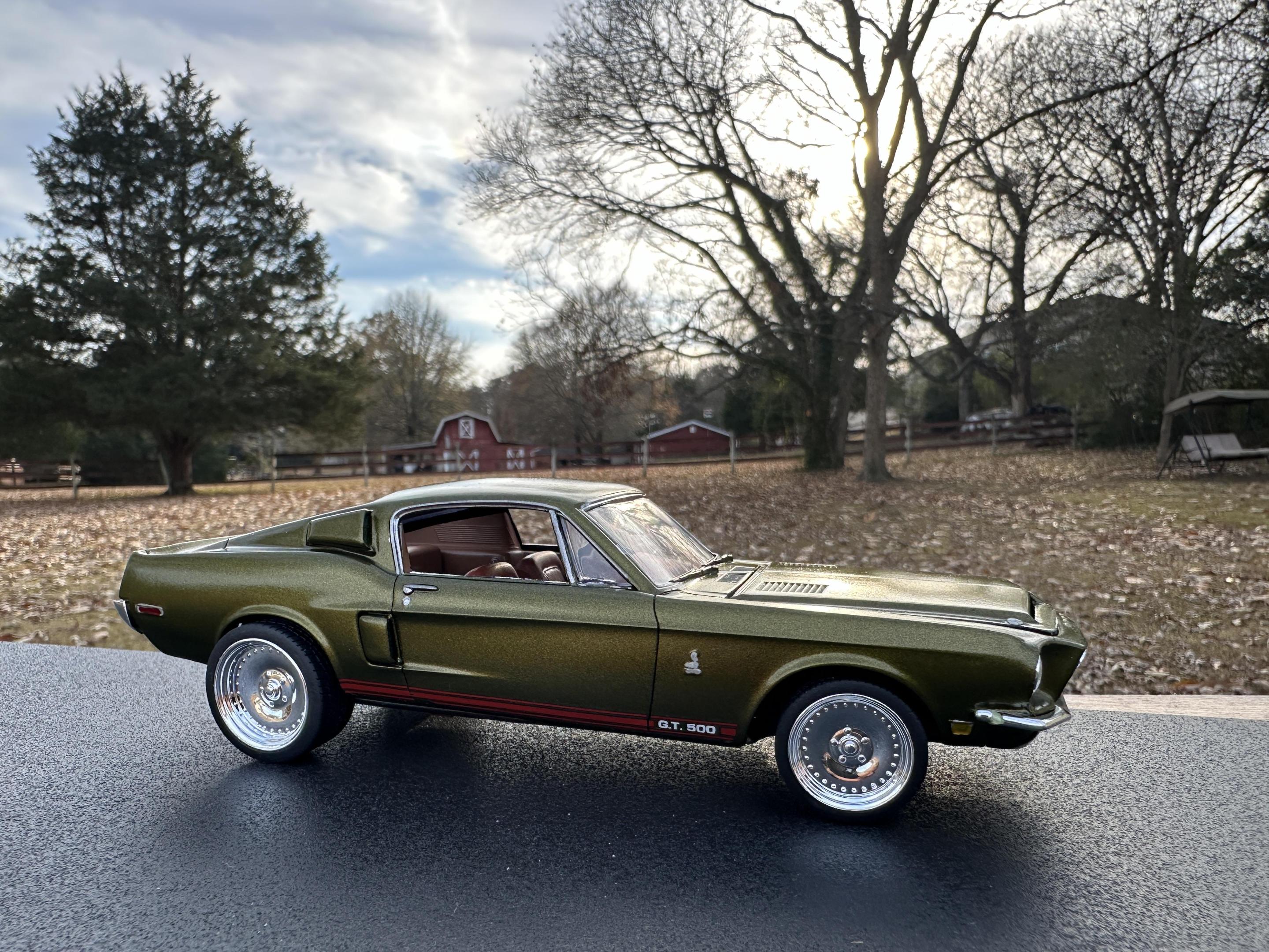 I used the AMT 68 Shelby GT500 body and parts with the Revell 68 GT chassis, interior and running gear. The wheels/tires are Pegasus Centerlines. The paint is a factory Jeep color called Rescue Green. The weather didn’t want to cooperate with me on the pics so I’ll try to take some better outdoor ones later.