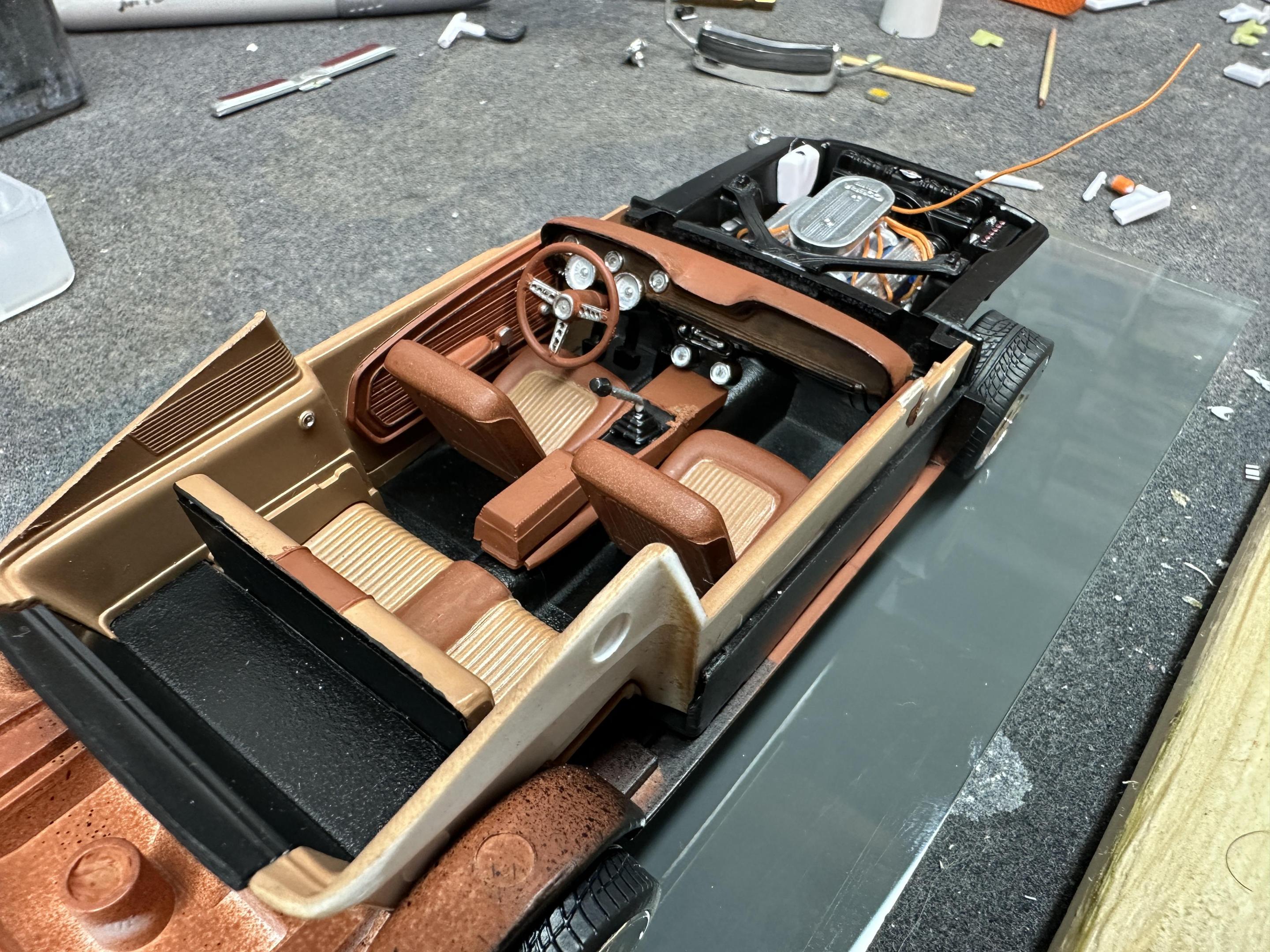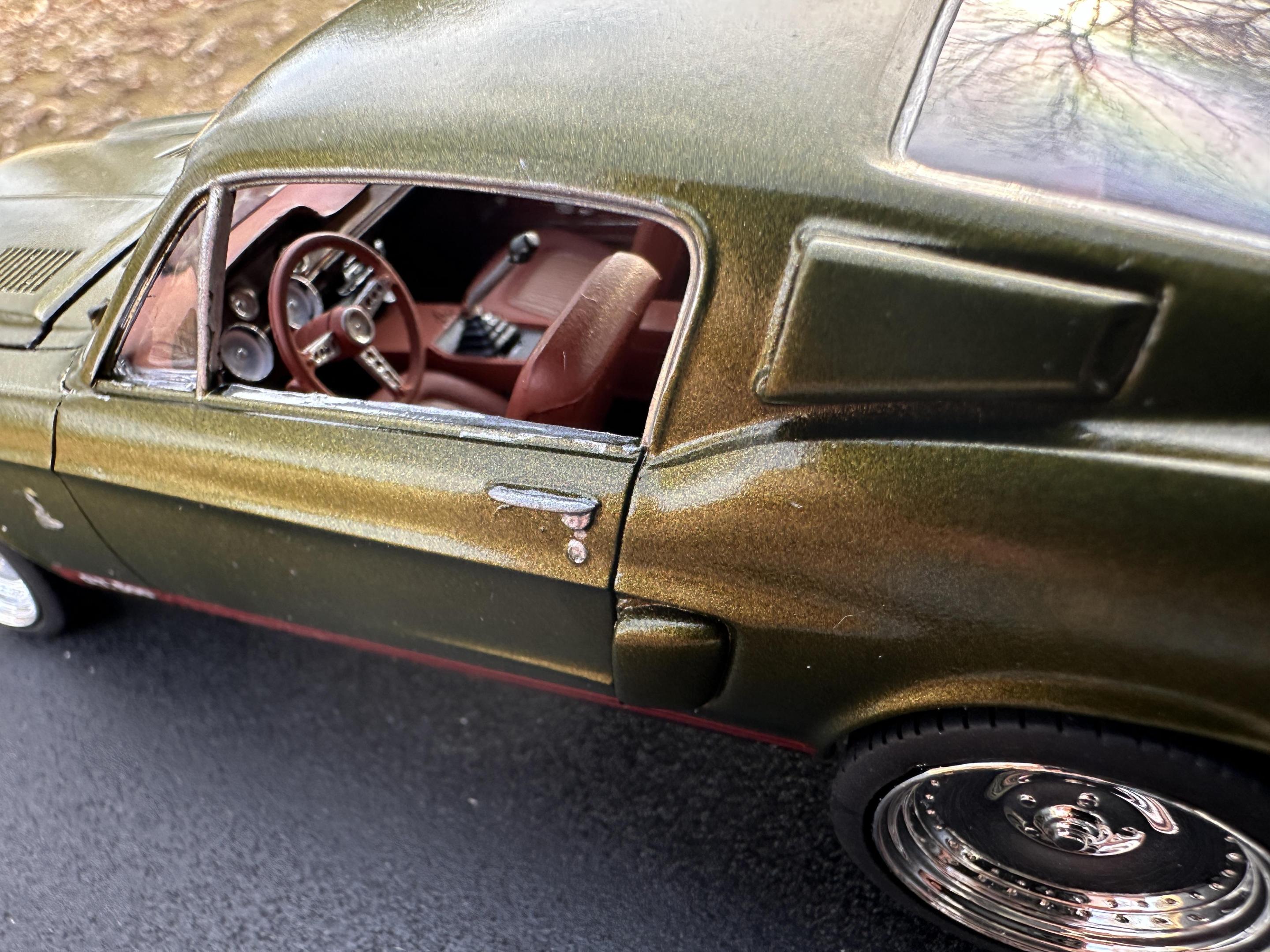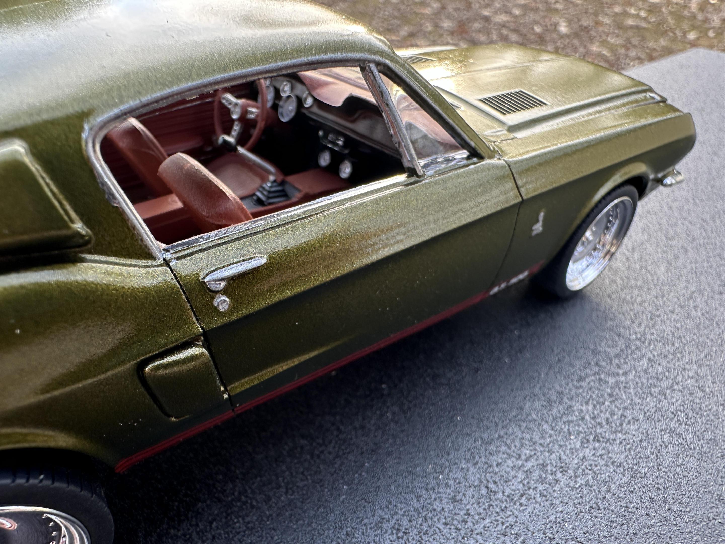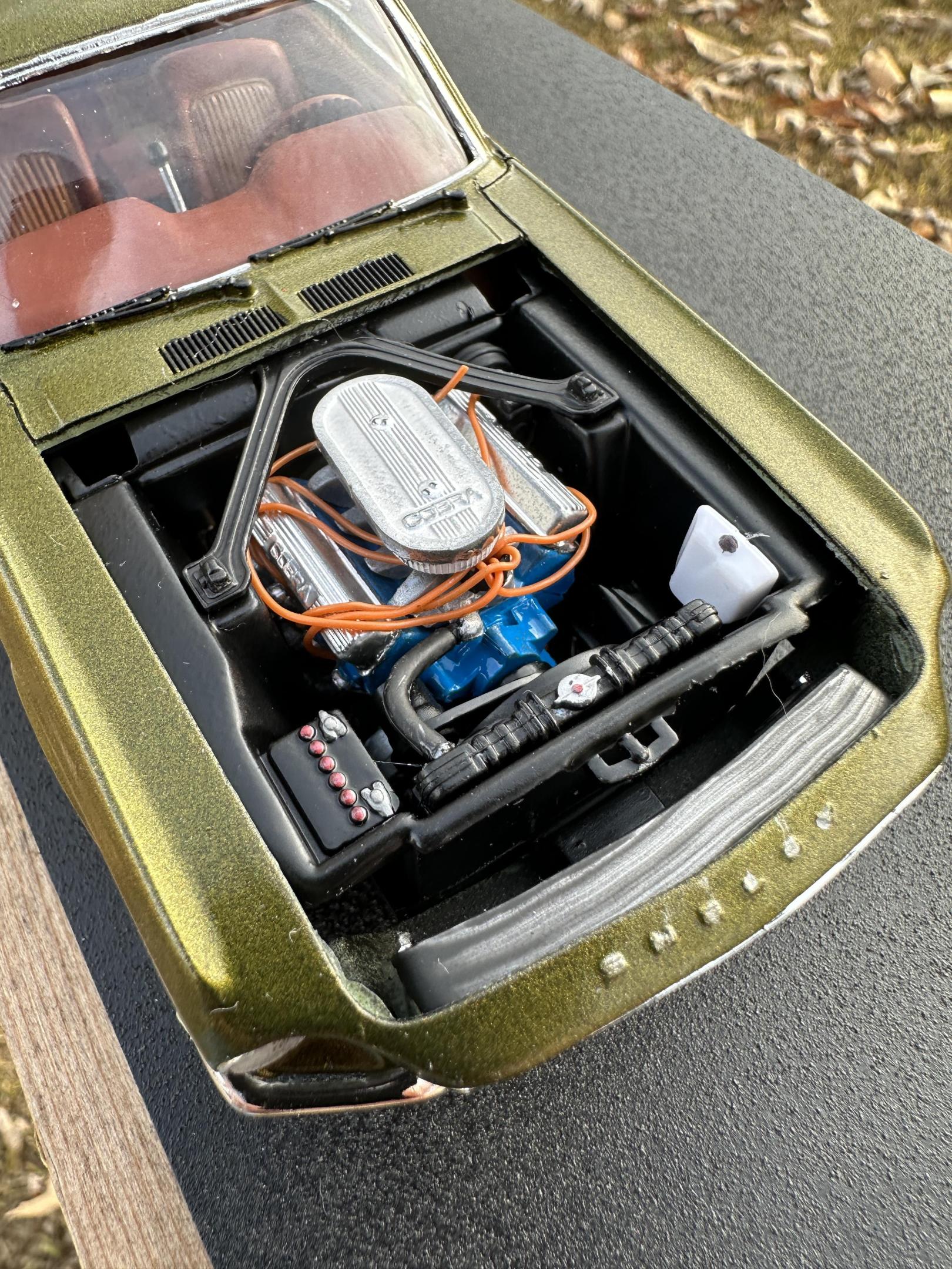I used the AMT 68 Shelby GT500 body and parts with the Revell 68 GT chassis, interior and running gear. The wheels/tires are Pegasus Centerlines. The paint is a factory Jeep color called Rescue Green. The weather didn’t want to cooperate with me on the pics so I’ll try to take some better outdoor ones later.
