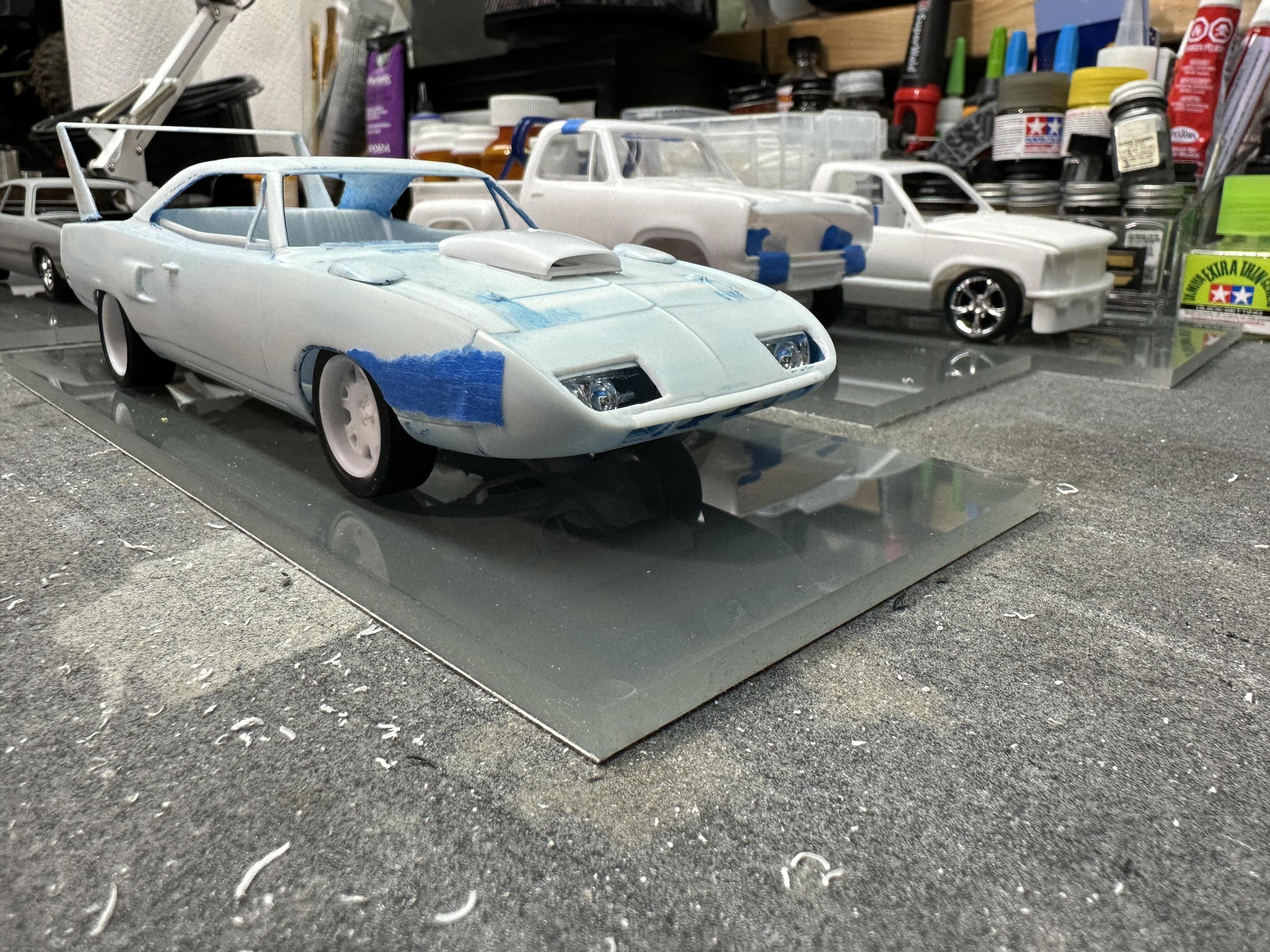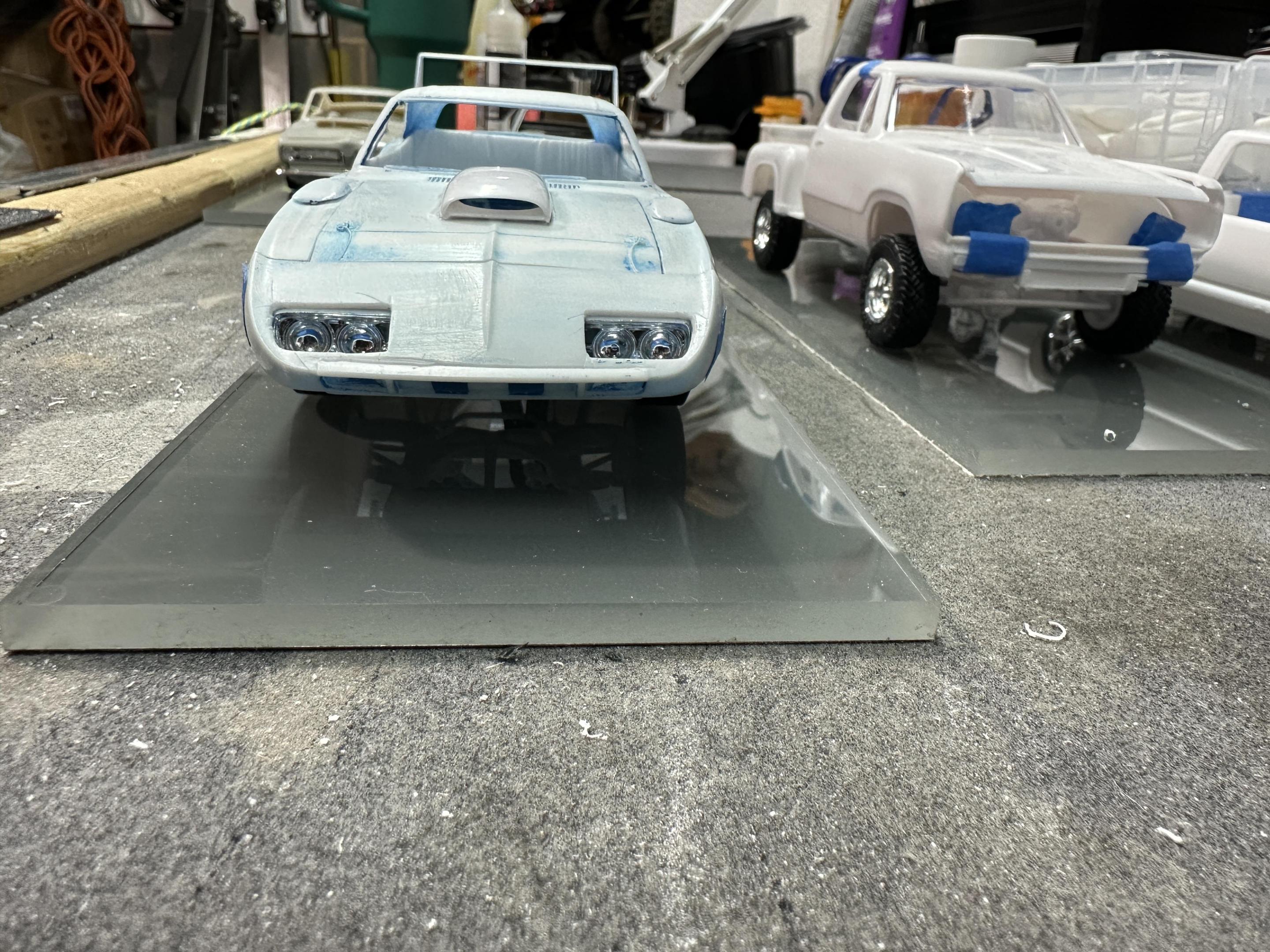 Thought I had the body ready for primer, but then I my brain decided to say “Hey what about this?” So now I’ve roughed in the headlights and swapped hood scoops. I think I’m liking it! -