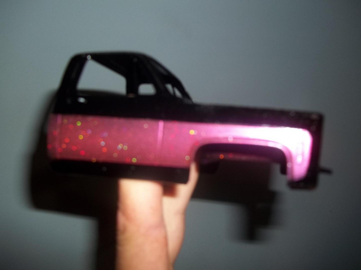 This one is done using Pearl-X Interference Red mixed into Paint Shop clear. It also has some Cherry Red Recollections flake added in, and is shot right over the black, no different base coat under it. Not really the effect I was after, but it turned out ok.